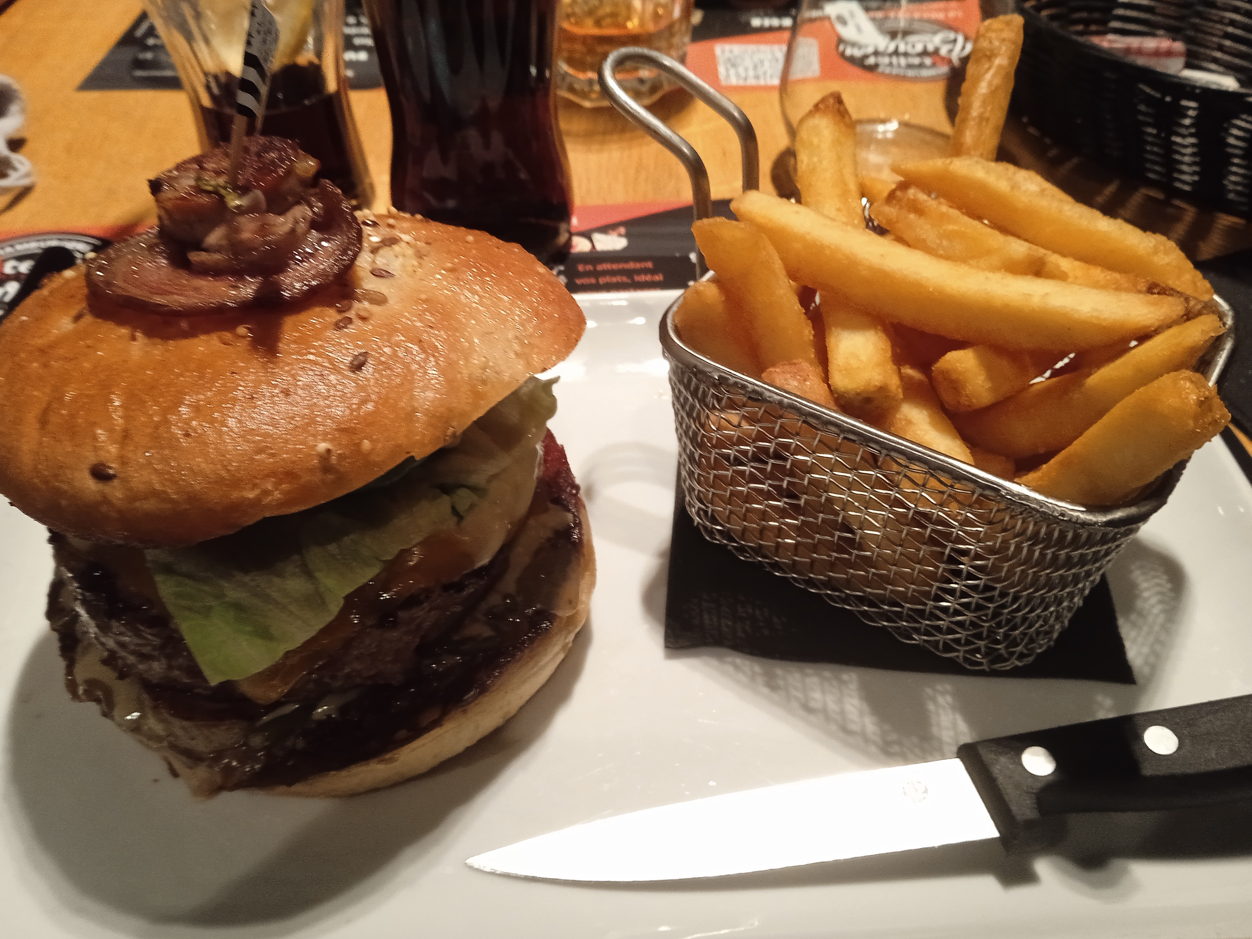 Bienvenue à l’atelier du burger ! Pour les connaisseur « La minute nécessaire … de » Chers convives soyez informé qu’à l’atelier du burger on ne sert pas des burger mais 1 unique burger imposé (le midi en tous cas) Comme le soulignerait certainement un humoriste célèbre ; étonnant non ! Résultat une entrecôte bien grillé et comme je l’aime