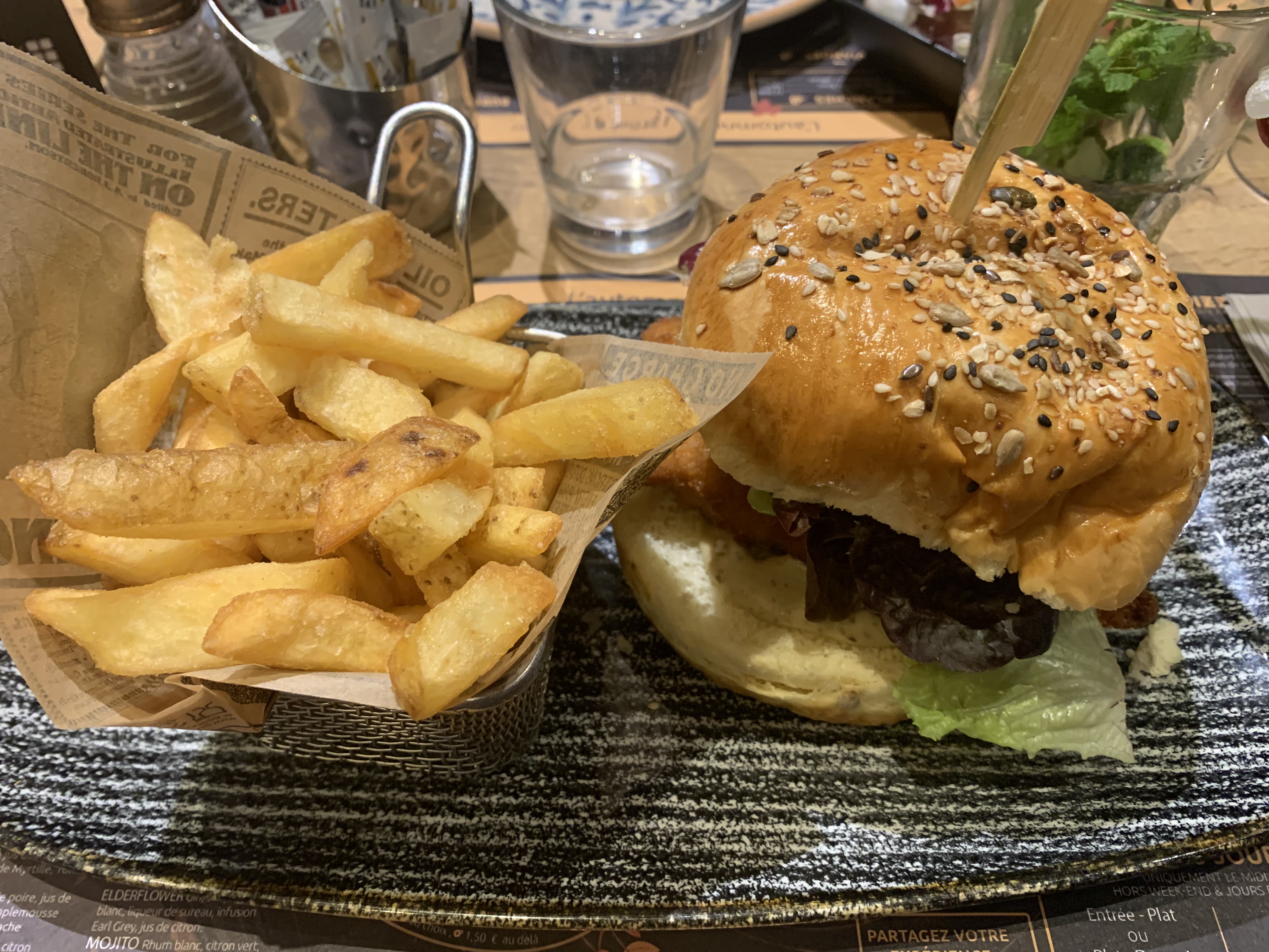 Cadre: un très beau restaurant mais nous étions installés à côté de l’entrée nous avions les courants d’airs et toutes les odeurs de cigarettes cela était insupportable. Service: la prise de commande et l’arrivée des plats ont été rapides mais un peu trop car les plats étaient froids. Le personnel est agréable et souriant mais certains n’acceptent pas la critique et se montrent distants et froids. Cuisine: nous avions commandé deux burgers personnalisés et nous avons bien aimé. Le pain était excellent tout comme les frites maisons accompagnées de leurs sauces. Le râpé de pomme de terre et le pané de poulet sont succulents. Le seul petit point noir sur le tableau est le manque de sauce rendant l’ensemble un peu sec.
