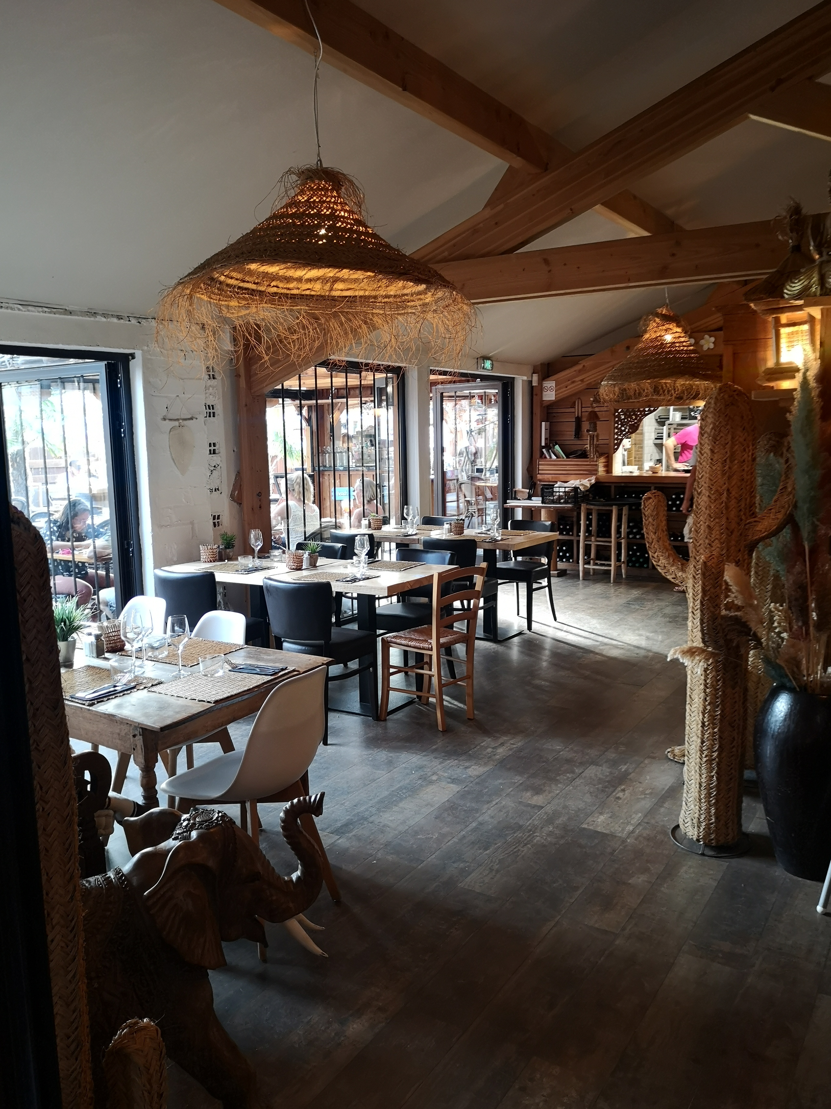 Magnifique restaurant en bois avec beaucoup de caractère. Tres joliment décoré ambiance ethnique et voyage. Repas du midi simple et efficace , bien cuisiné. Tres bon service agréable et attentionné. A voir le soir avec une carte plus élaboré après le 9 juin... Idéal pour passer un bon moment en terrasse, pour boire un verre et profiter d un after beach. Je conseil ce nouveau lieu a Maubuisson.