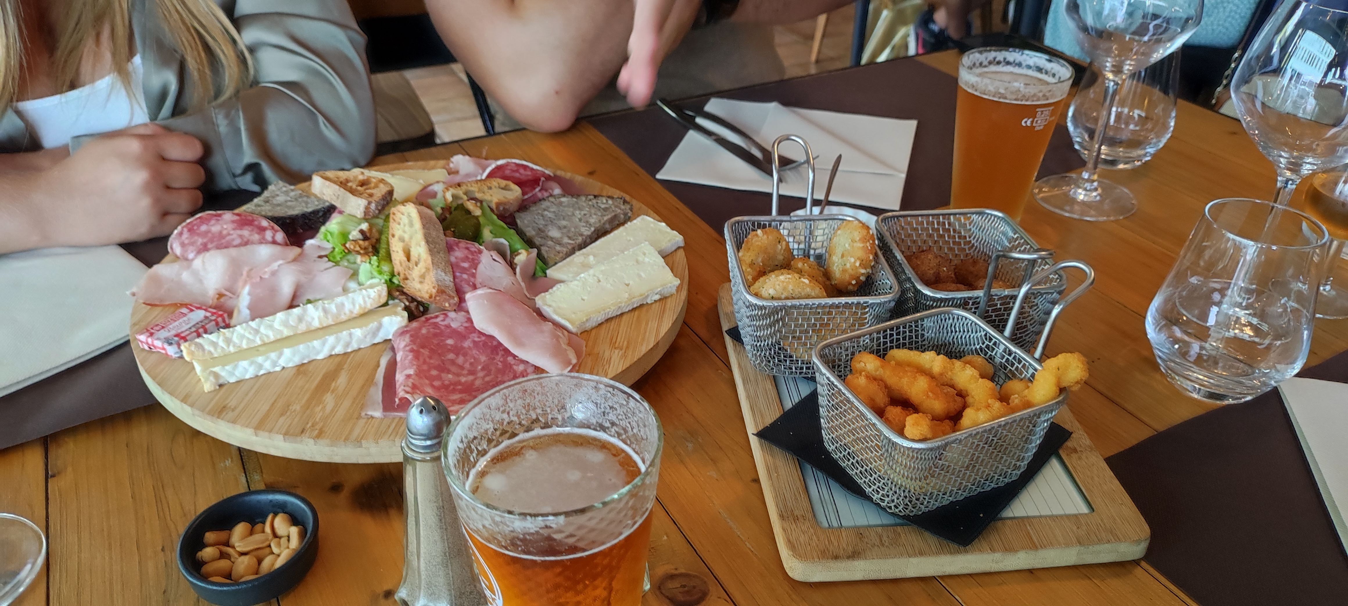 Expérience mitigée. De la réservation téléphonique jusqu'à la fin du repas, nous avons été très bien accueillis et notre poussette aussi (ce qui est loin d'être le cas de tous les restaurateurs). Donc accueil et politesse au top ! Les cocktails (mojito classique et mojito framboise) étaient succulents. C'est plutôt sur le reste où nous avons été déçus. Notre fille a commandé une steak pâtes et elle a eu des frites à la place des pâtes... Rien de grave en soi mais elle avait déjà mangé des frites la veille ^^ Quant à nous, nous avons pris une fondue savoyarde royale (avec patates et charcuterie donc) et nous avons été déçus du fromage fondu (mélange de Beaufort et de je ne sais plus quel fromage), tant par son manque de goût (trop fade, pas assez salé, pas assez relevé par manque de vin blanc) que par sa tenue (à la fois trop liquide pour bien tenir sur le pain comme si cela avait été coupé avec de la crème fraîche) mais aussi granuleux (le mélange n'était pas homogène, formait des caillots). Ce n'est effectivement pas une spécialité de la région, peut-être aurions-nous dû prendre un plat dit spécialités de la mer mais cela nous faisait envie et finalement, nous restons déçus de ce plat mais dans l'ensemble, assez satisfaits de notre soirée.