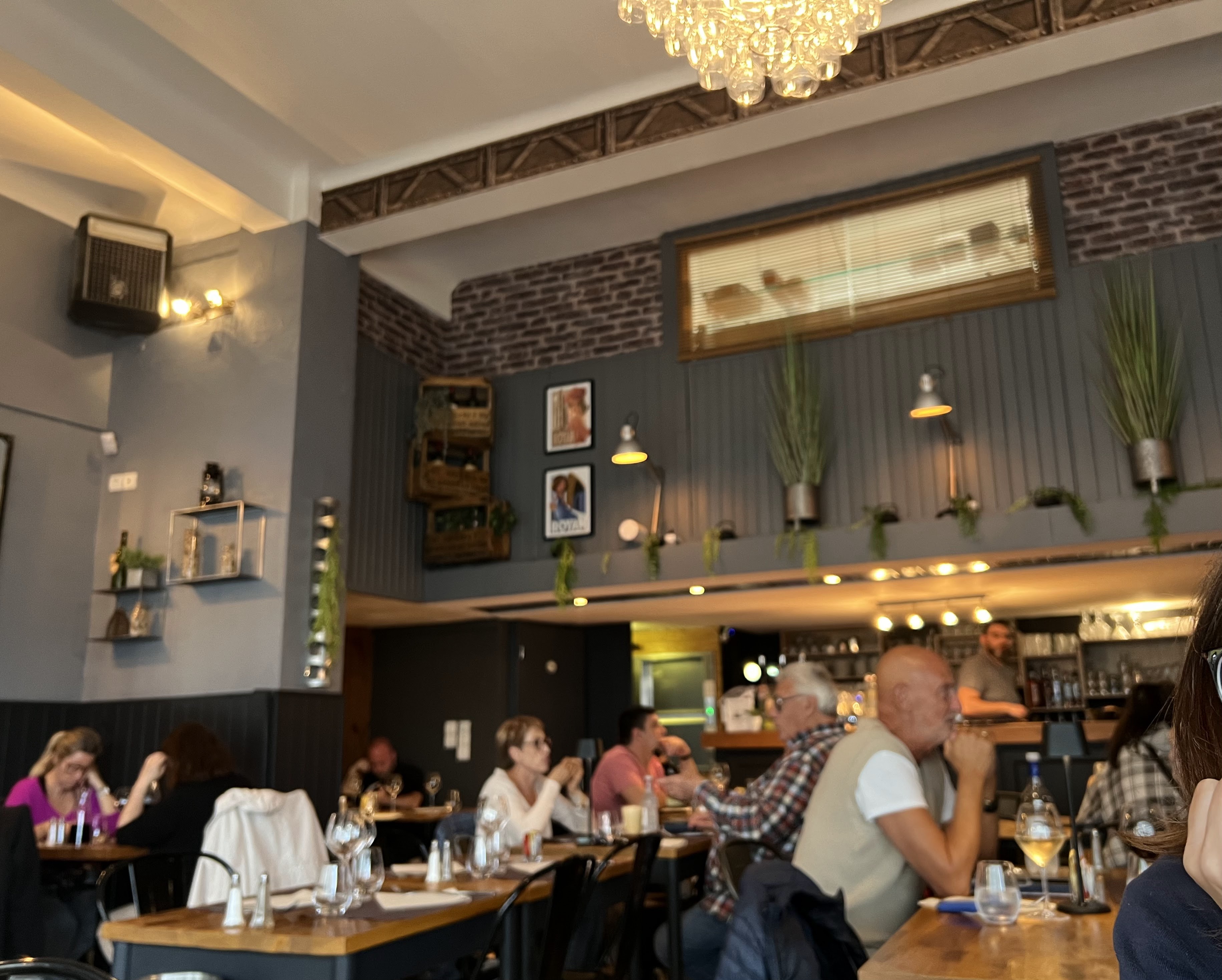 Très bon accueil. Carte simple et efficace. Serveur au top. Plat ( viande) bonne et tendre, sauce roquefort extra, dessert bon. On aime la déco surtout le lustre verre à pieds . Cuisine fait maison excellente