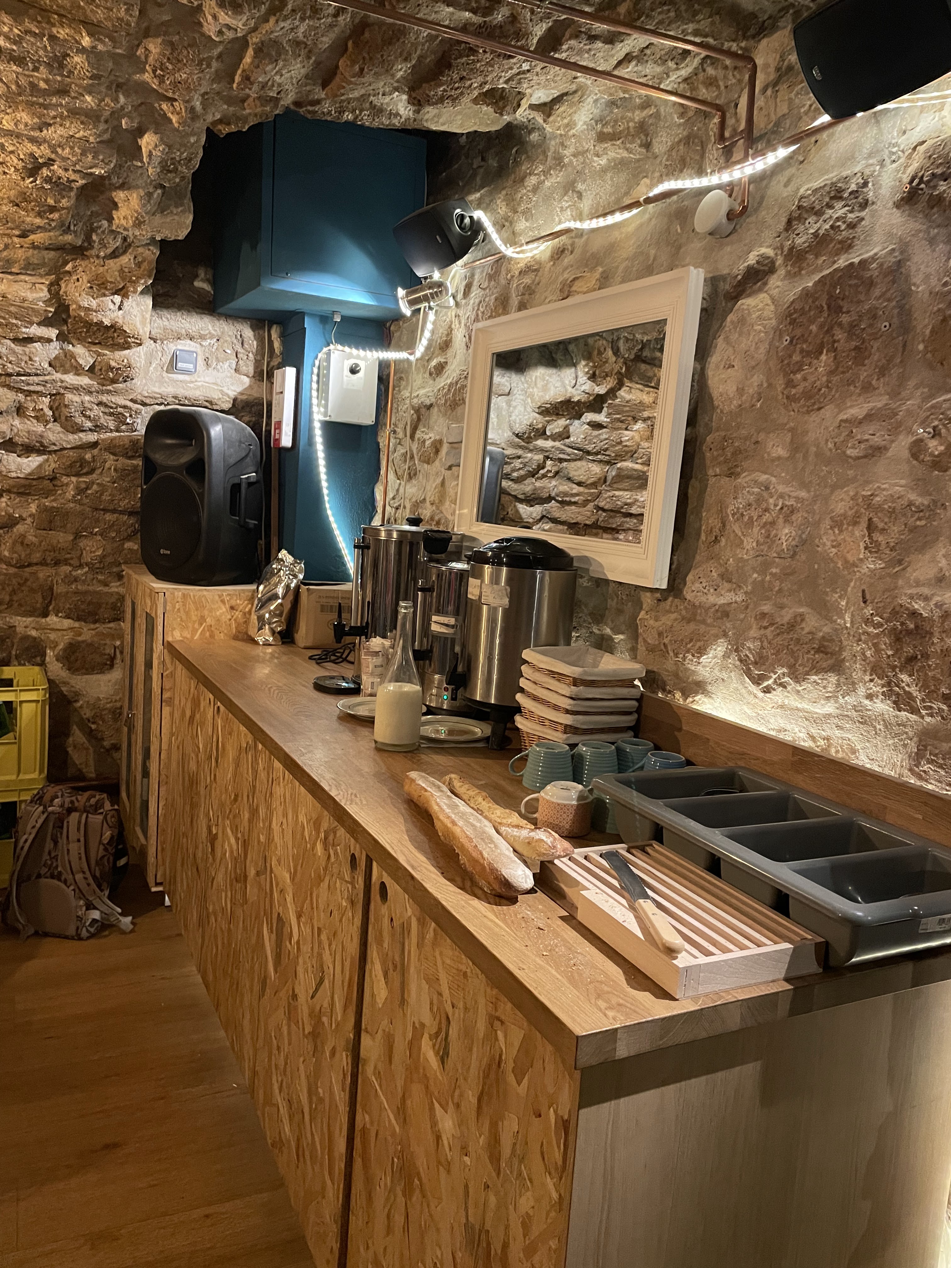 En dépit du fait que sur une réservation initialement de 13 nous nous sommes retrouvés à 4, nous avons passé un super moment. Service super chaleureux et simple. Buffet généreux et cuisine simple et réconfortante. Tout était délicieux même le houmous de betterave ! On a très bien mangé et y en avait pour tous les goûts (vegan, allergies...). On a payé 31 euros et c'était correct pour 2 h sachant que les boissons sont également incluses (jus d'orange, limonade, thé, café et chocolat). Ambiance très cosy dans la petite cave avec petits coussins et lumières tamisées. C'était cool ! Merci !