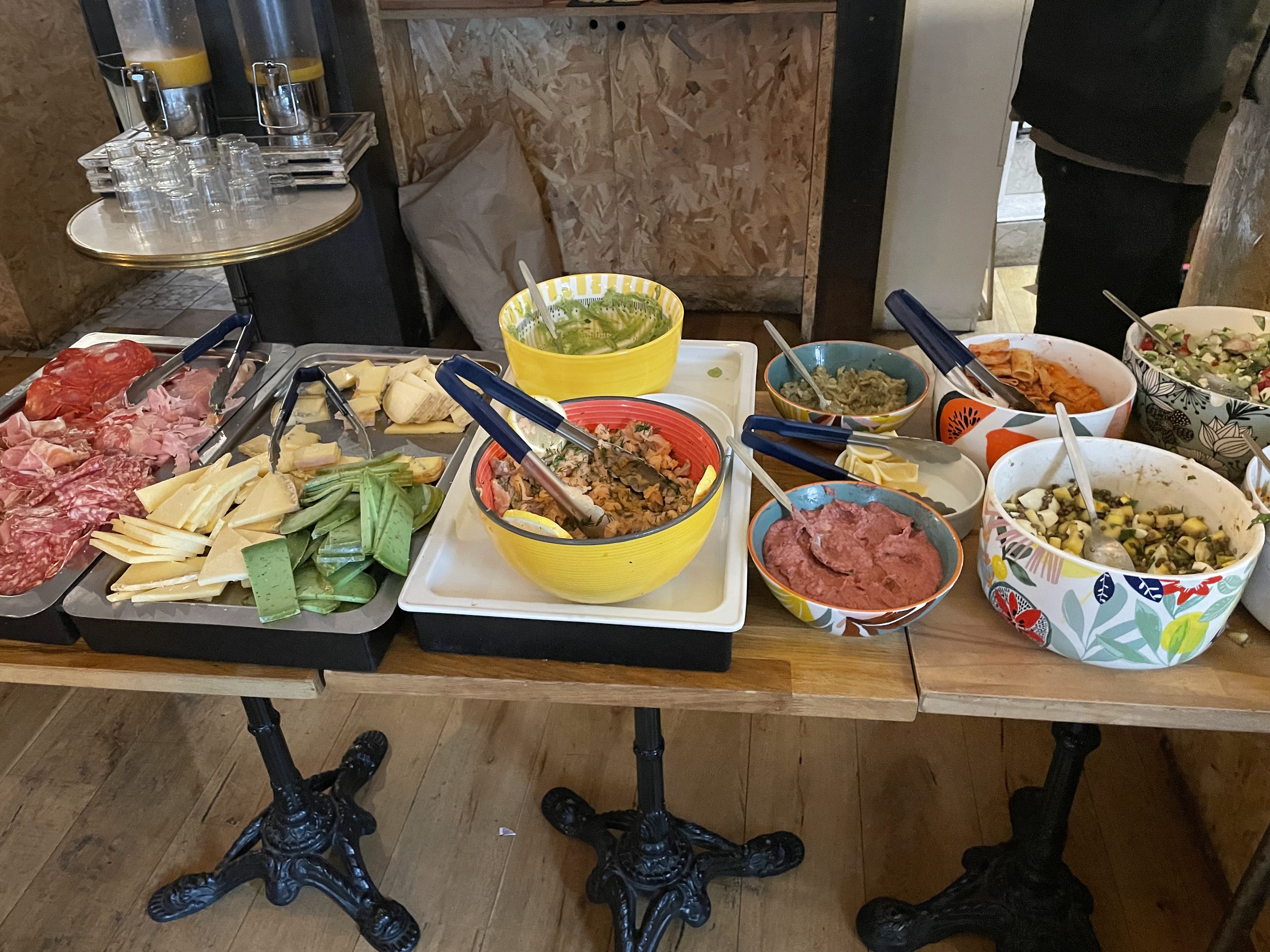 Nous avons brunché en terrasse au service de 10h. La rue était encore calme. C'était très agréable. Quant au buffet, tout est délicieux et on ne sait pas où donner de la tête.