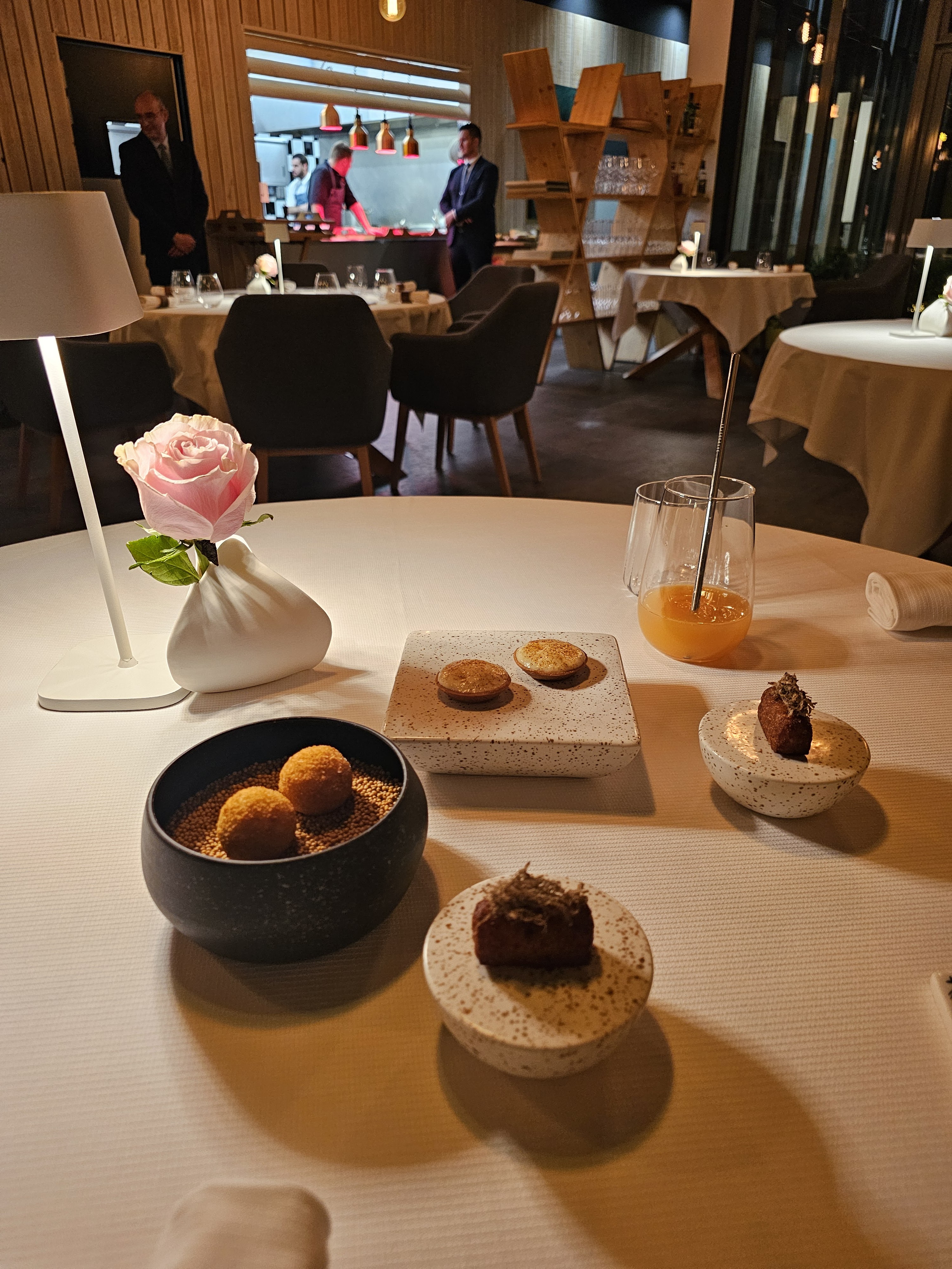 Très belle expérience culinaire, cadre magnifique, ambiance cosy, j'ai adoré voir la cuisine ouverte et officier le chef avec son équipe, personnel compétent, sommelier très pro et sympathique, seul bémol le dessert à l'asperge : association pamplemousse excellente mais goût trop prononcé de l'asperge.