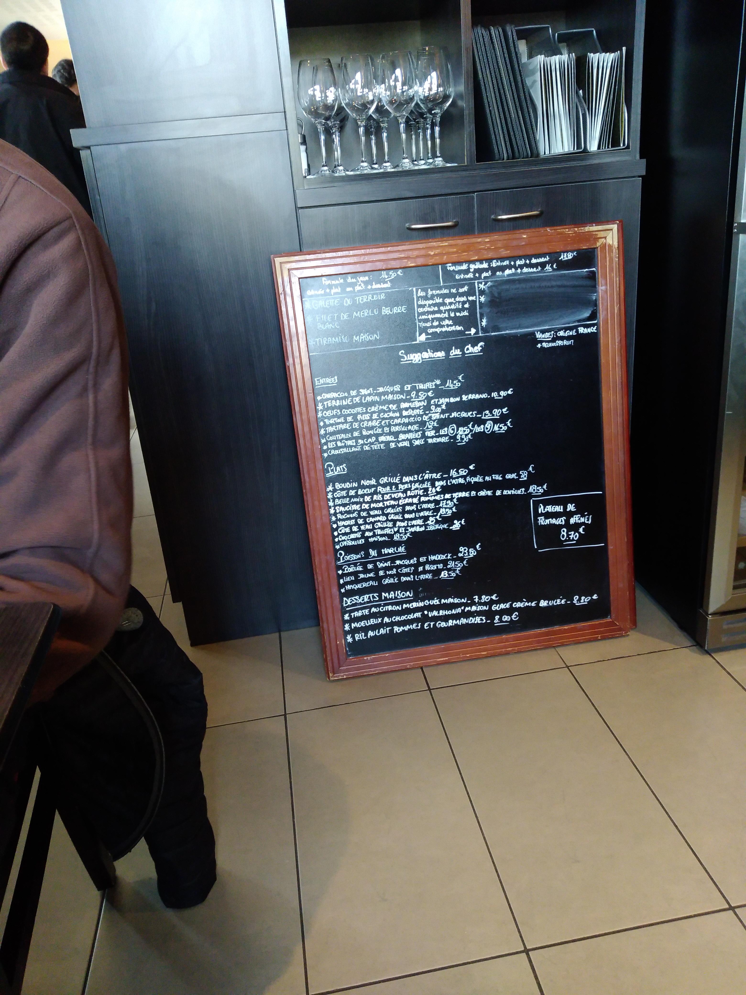 Je ne donnerai pas mon avis, je vous laisse juge: 12h30, plus de plats du jour, plus d'entrée du jour...plus de dessert du jours. Annonce en milieu de commande qu'il n'y en a plus. Erreur dans la prise de commande: pas le bon nombre de plats, jusqu'à la fin du repas. Le filet de lingue-tagliatelles se transforme en filet de lieu, pommes de terres, brocolis une fois arrivé sur la table sans aucunes explications. Pour couronner le tout, arrivé au moment de payer les plats ne correspondaient plus encore. C'était pas leur jour... Prix des vins un peu exagérés. Réponse à la réponse: Admettre qu'on a remplacé sans prévenir la Lingue par du lieu ni sur l'ardoise ni au moment de la prise de commande ça s'appelle tromperie sur la marchandise et c'est répréhensible.