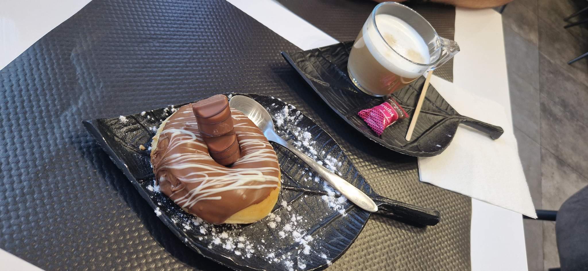 Boîte de 4 donuts commandée par Uber Eats, super assortiment (spéculos, M&Ms, Oreo et KitKat) ils sont beau et super bon. J’irais sur place tester leurs milkshakes qui ont l’air délicieux accompagné d’un merveilleux donuts. Petit mot de remerciement pour la commande écrit à la main sur la boîte fait toujours plaisir, merci à eux pour ce moment de plaisir gustatif