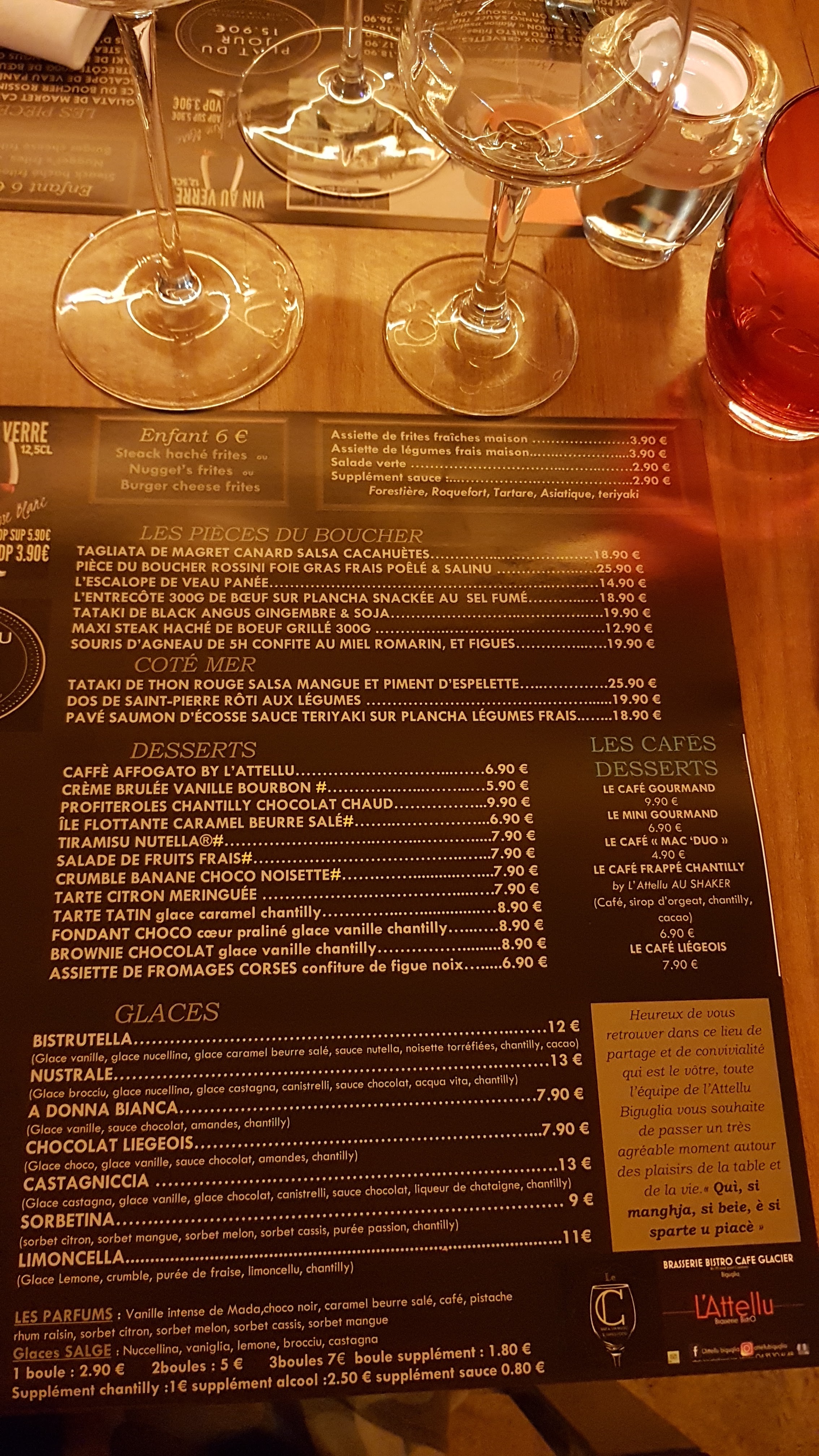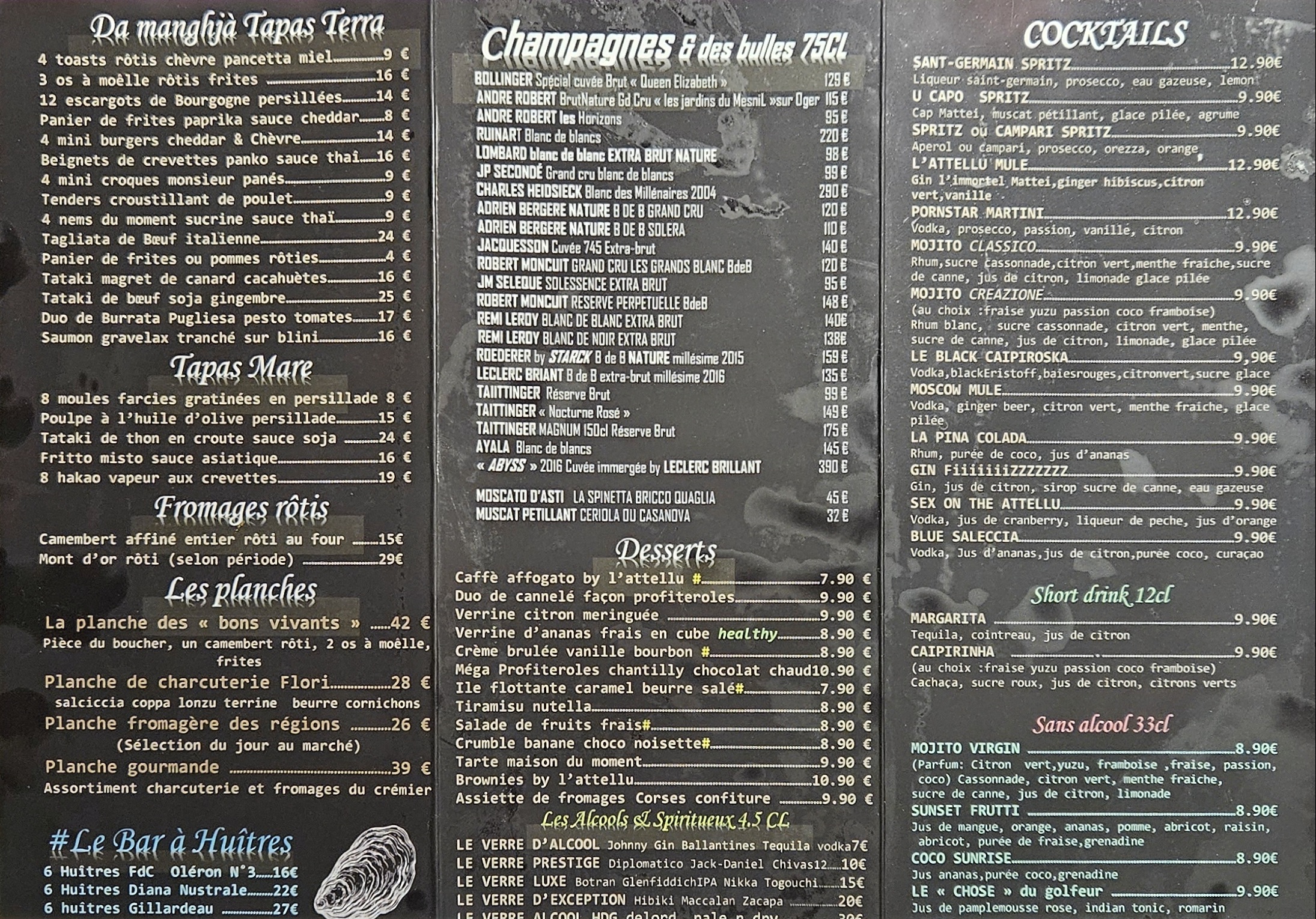 Nous nous sommes rendus dans ce restaurant en suivant les avis Google. Nous avons été ravis de notre choix ! Tout d'abord, l'accueil a été très sympatique grâce à la serveuse très souriante, avenante et agréable. Elle nous a installé en terrasse dehors le temps de boire l'apéro, donc côté bar à tapas et ensuite nous sommes passer à table, côté restaurant. Je tiens à souligner que le décor du resto est très beau et très agréable et convivial. Pour mon choix de plat, j'ai pris une salade diet et mon compagnon le burger l'atellu. Tout était très bon et bien présenté ! Il nous a même été offert une myrthe en digestif et c'est très appréciable ! Merci à toute l'équipe de l'atellu pour cette agréable soirée !
