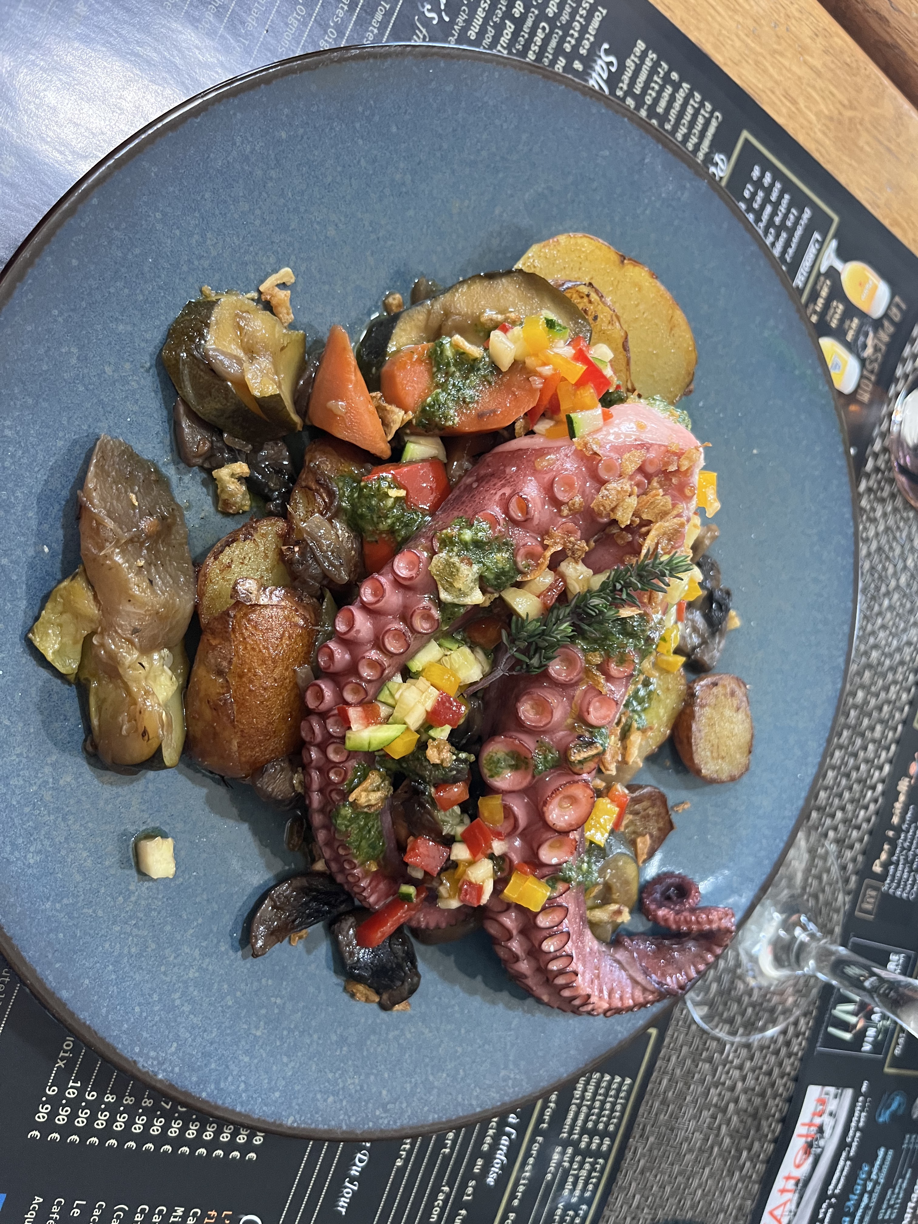 Nous avons choisi le restaurant sur la base des bonnes critiques mais nous ne pouvons malheureusement pas le confirmer. Ma femme avait du poulpe. Malheureusement, c'était servi froid. Après réchauffage au micro-ondes, le plat était plutôt bon. Mais il fait chaud à certains endroits et encore froid à d’autres. J'ai mangé un steak et des frites. Les frites étaient faibles. La même chose s'applique au steak. J'entends quelque chose de différent par une bonne entrecôte. Le service amical et professionnel est positif.
