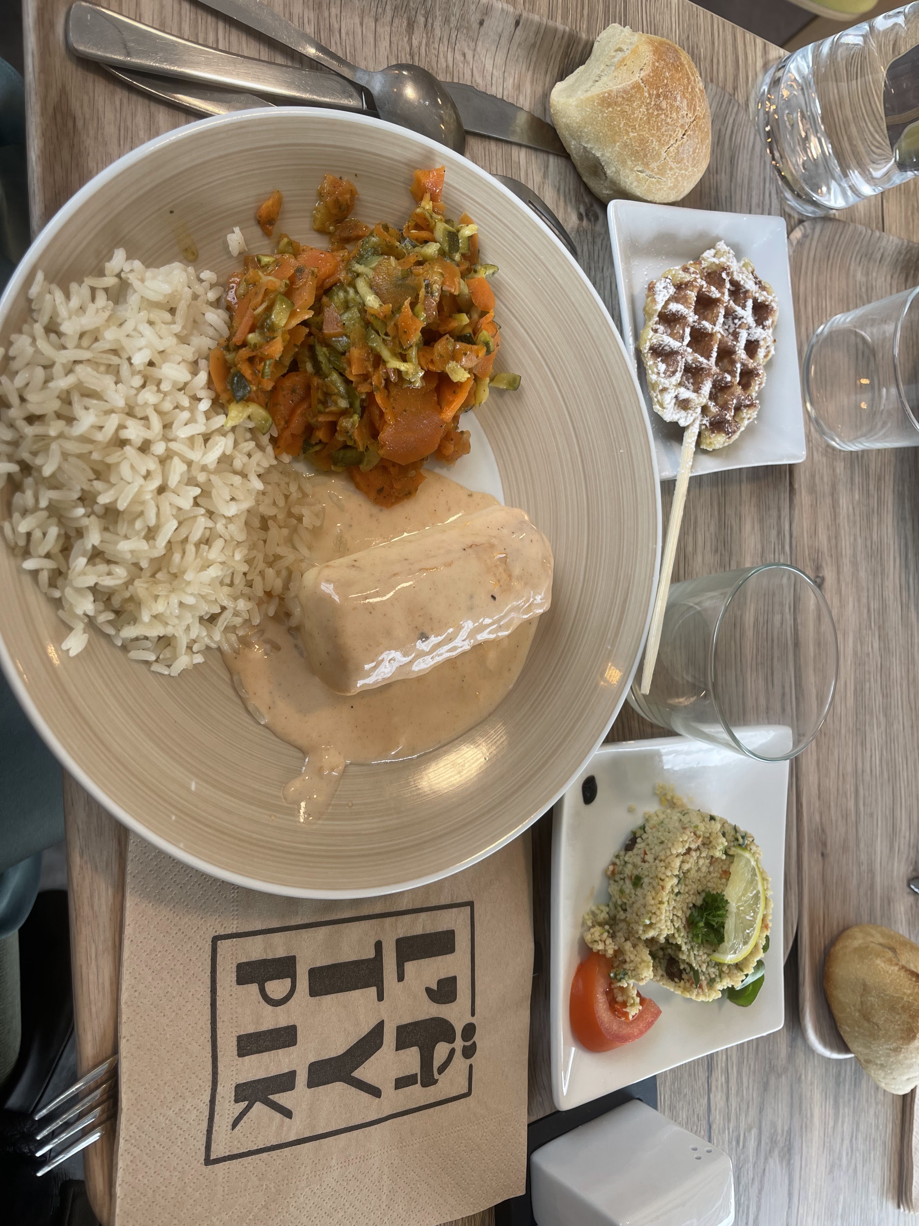Repas simple et bon avec choix pour chaque étape. Prix mini. Idéal pour le midi. Portions un peu petites. Personnel en situation de handicap sympathique et compétent : il faut en tenir compte pour excuser quelques réactions, sinon passez votre chemin ! A recommander dans le cad contraire.