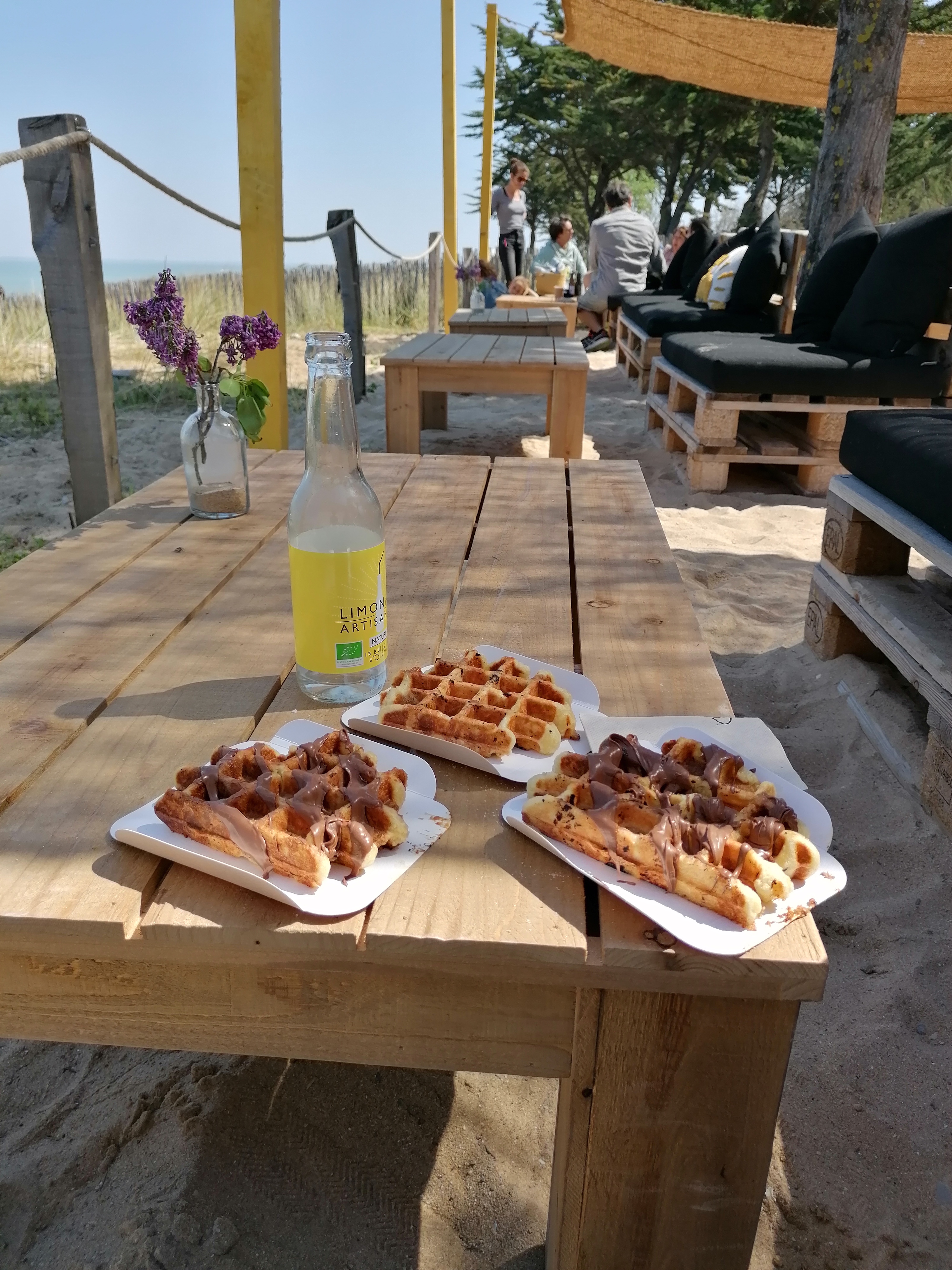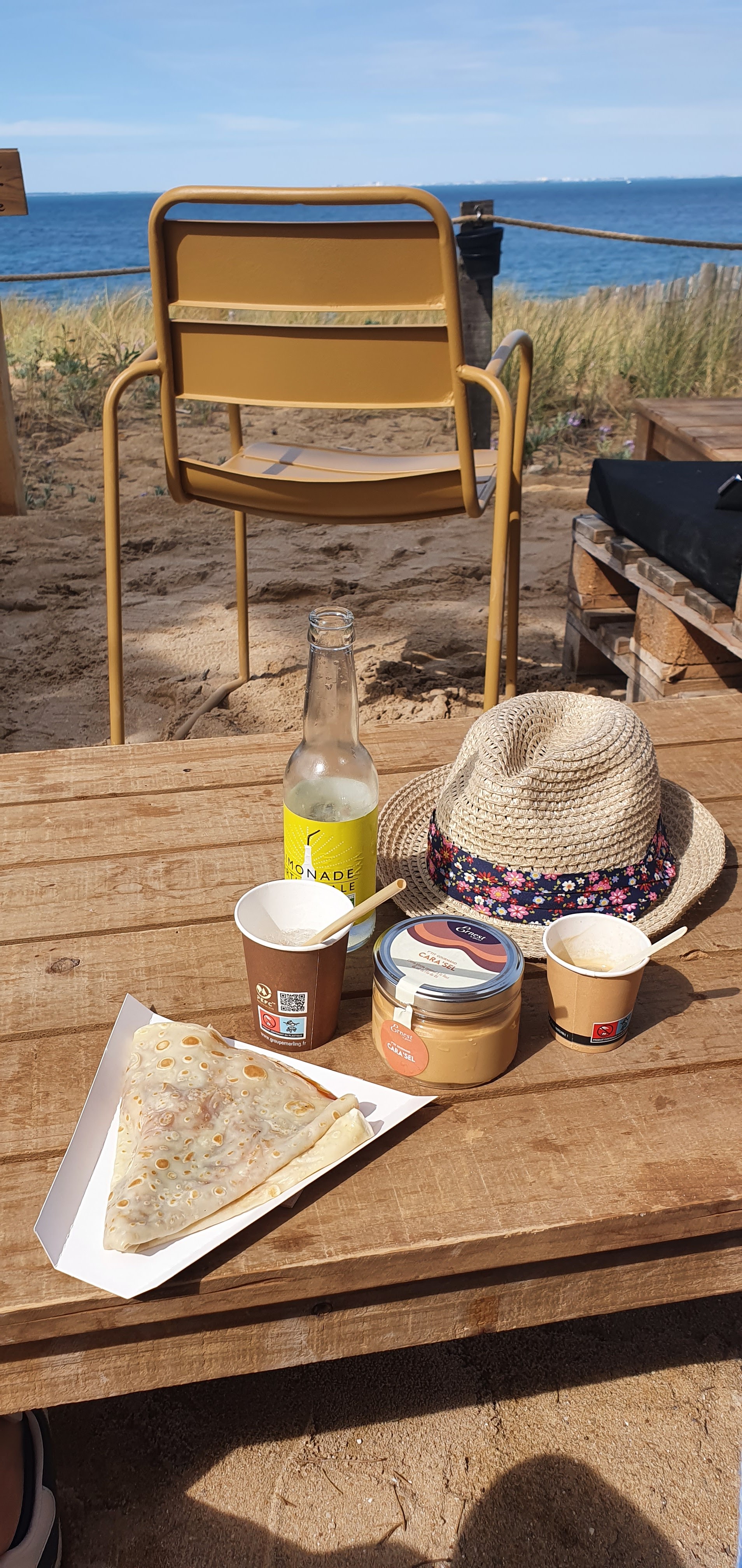 Moment convivial dans un lieu qui porte bien son nom ; Les pieds dans le sable; confortablement bien installés. Le mobilier est fait en matériaux recyclés (palettes...) et les plats et gaufres sont confectionnés maison ou achetés chez des producteurs locaux. Et pour couronner le tout; les propriétaires sont dynamiques et agréables. Je ne peux que recommander !