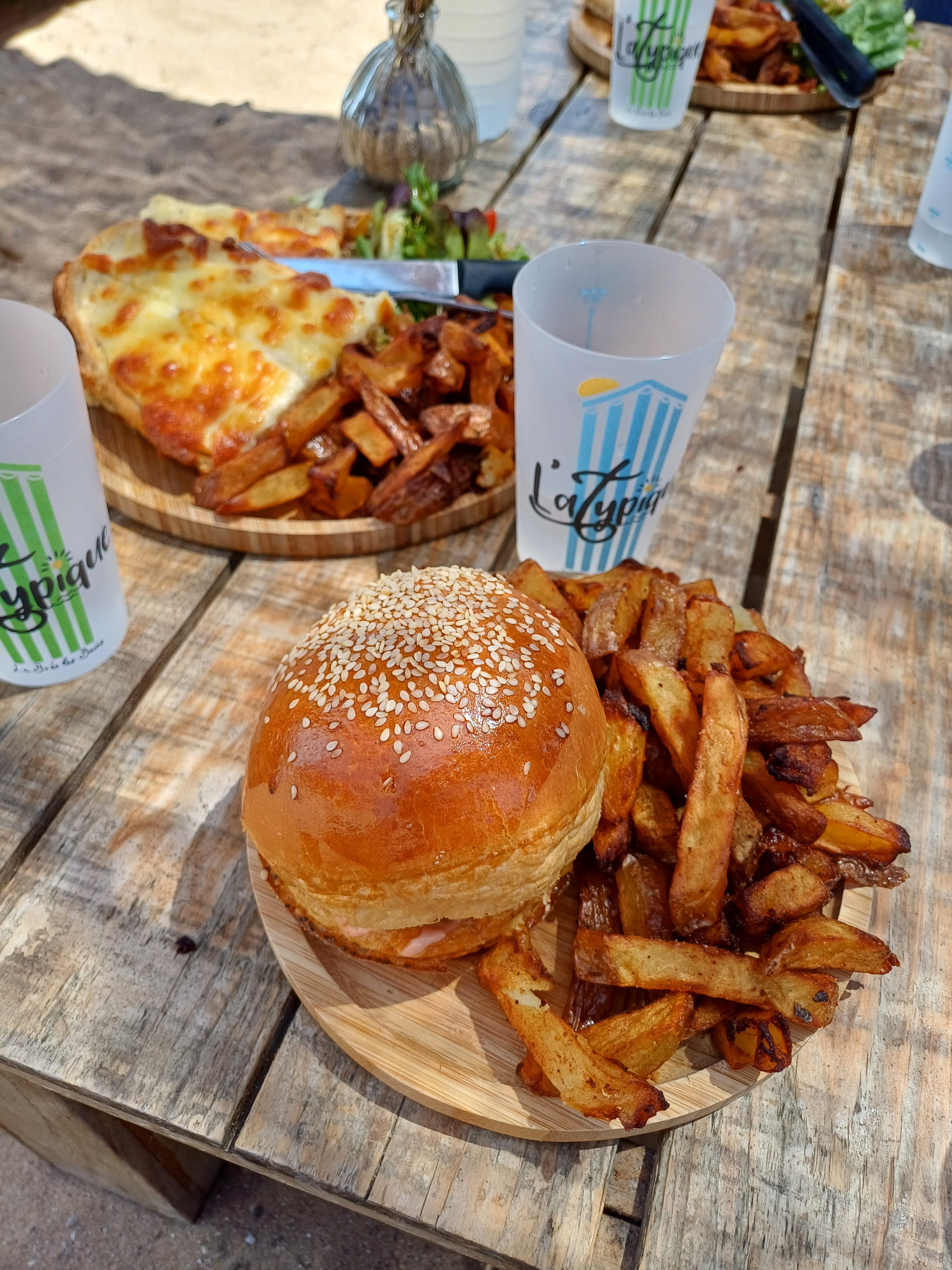 Sympa d'être à côté de la plage pour manger du fait maison. Frites maison 😋 Mais quelques points à revoir... Beaucoup de demande donc service assez long (comptez une petite heure), 9€ pour une boule de Burrata sur de la salade verte et quelques tranches de tomates c'est un peu cher, une assiette à dessert pour un burger frites c'est dommage (13€), peu de condiments à disposition, pas de service on va chercher son plat et on débarrasse la table, puis les stocks sont assez limités leur hutte est petite... Et ils ne demandent pas la cuisson du steak. L'atypique a du travail pour maintenir sa notoriété.