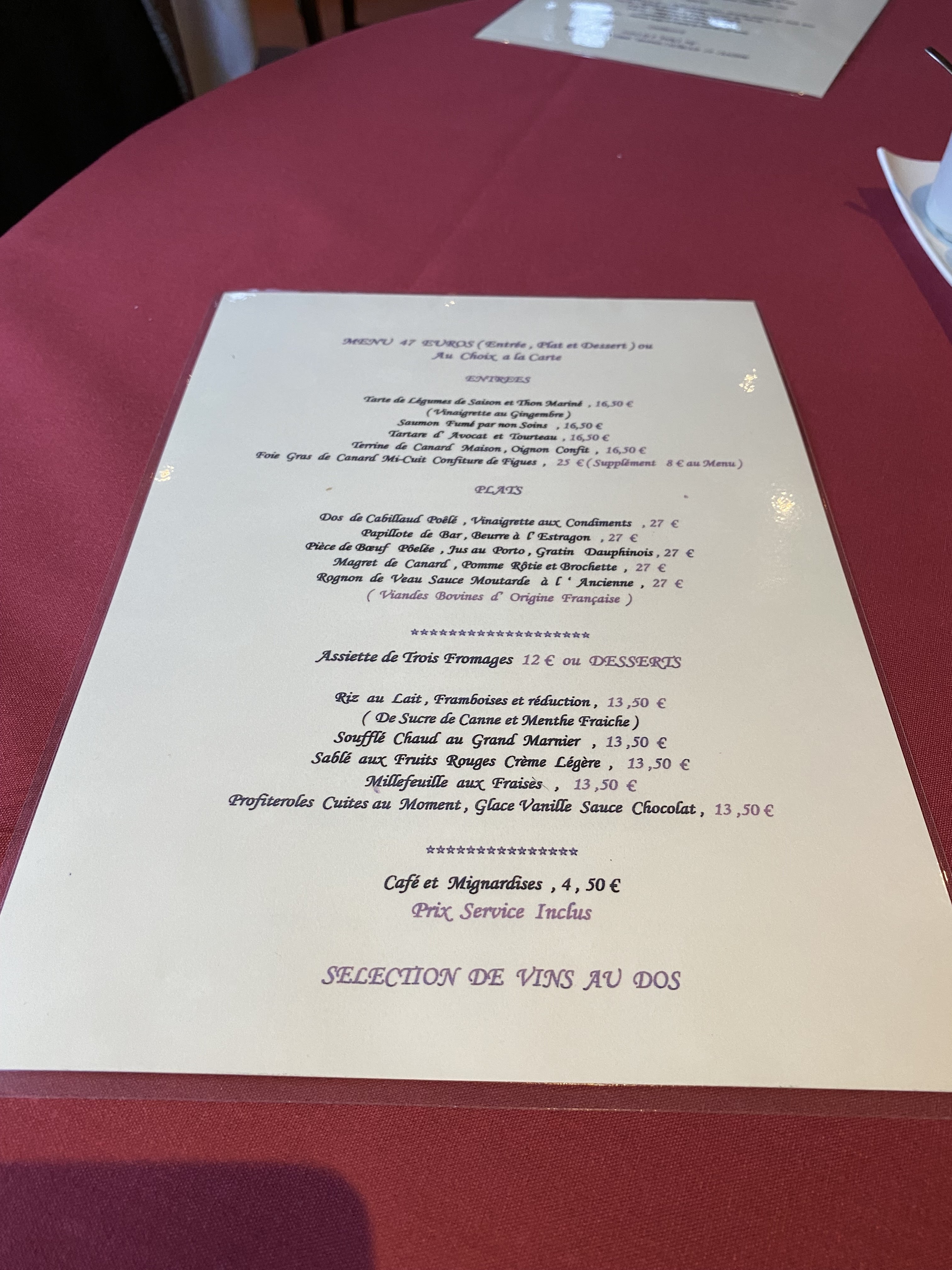 le cadre est splendide, carte très correcte et pas trop chère, service familier et efficace. une bonne adresse pour des repas d'affaire ou des occasions spéciales sans se ruiner.