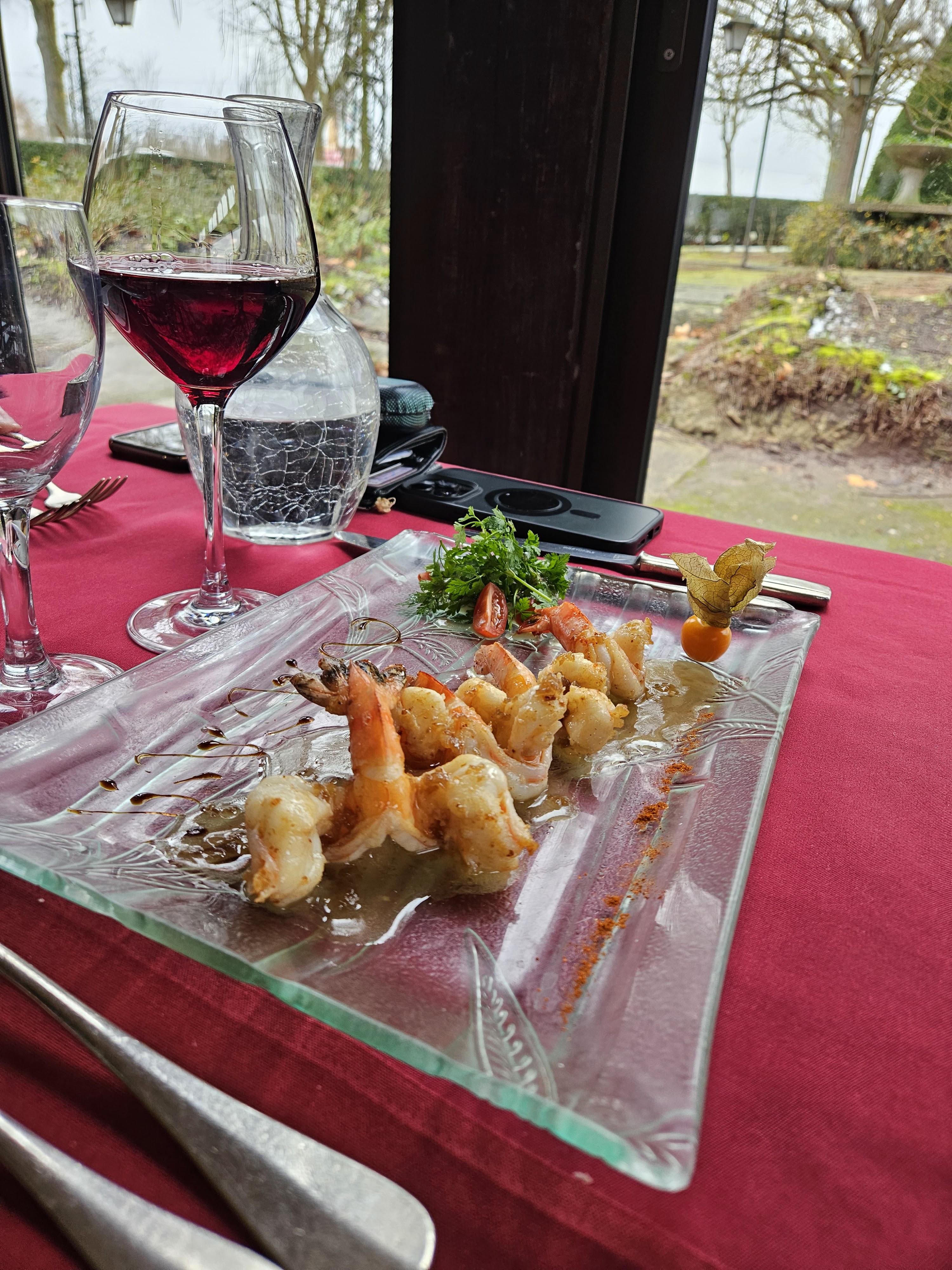 Déjeuner devant une magnifique baie vitrée laissant apercevoir un parc superbe, des mets délicieux et de grande qualité, un service soigné et impeccable.