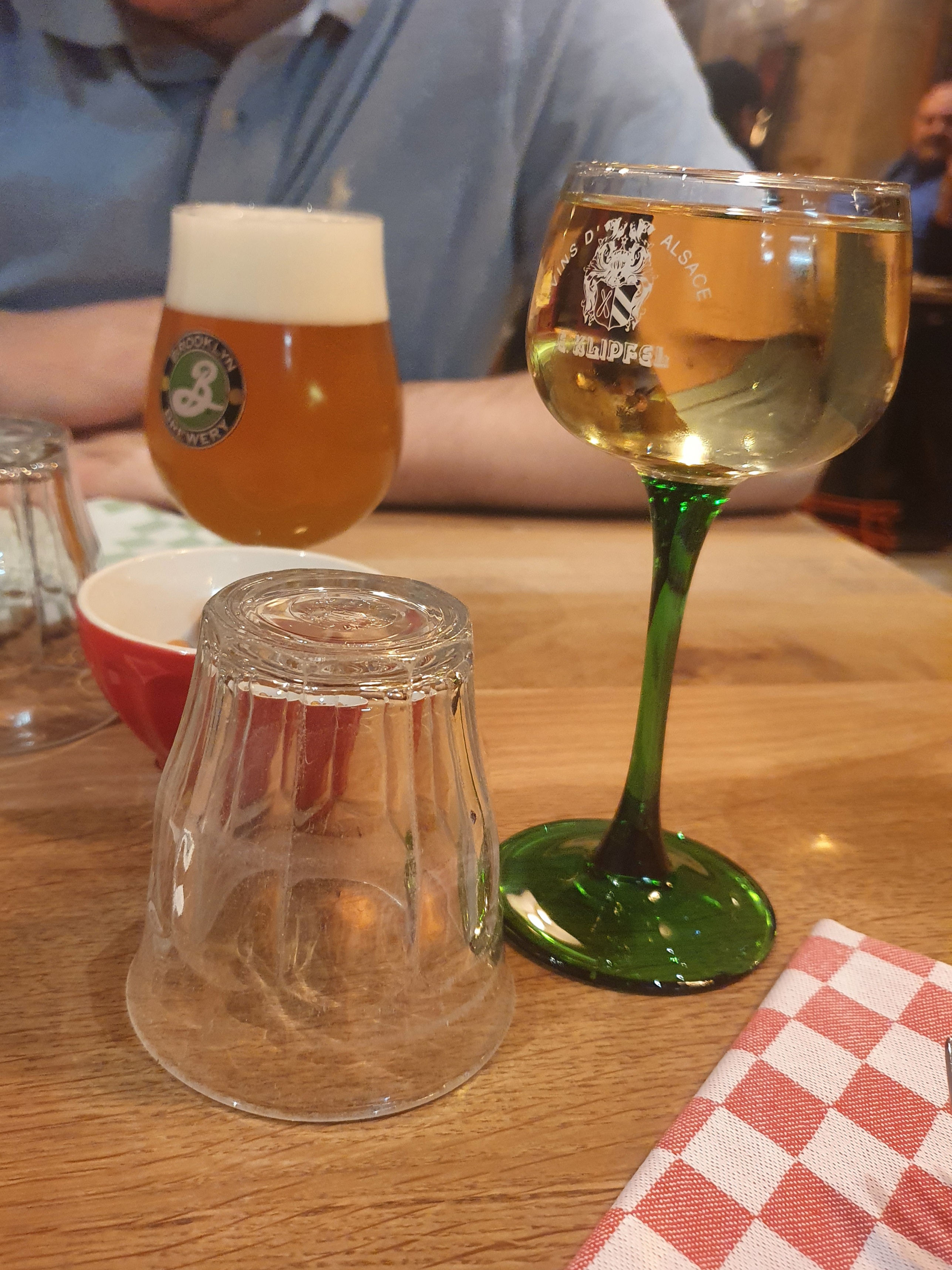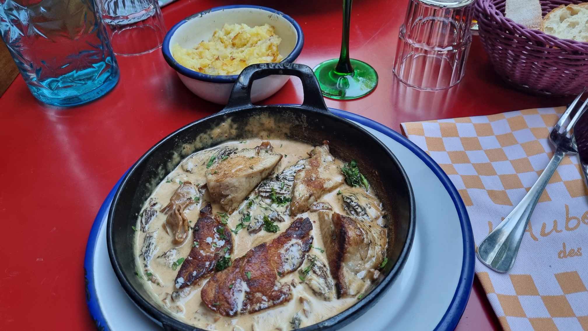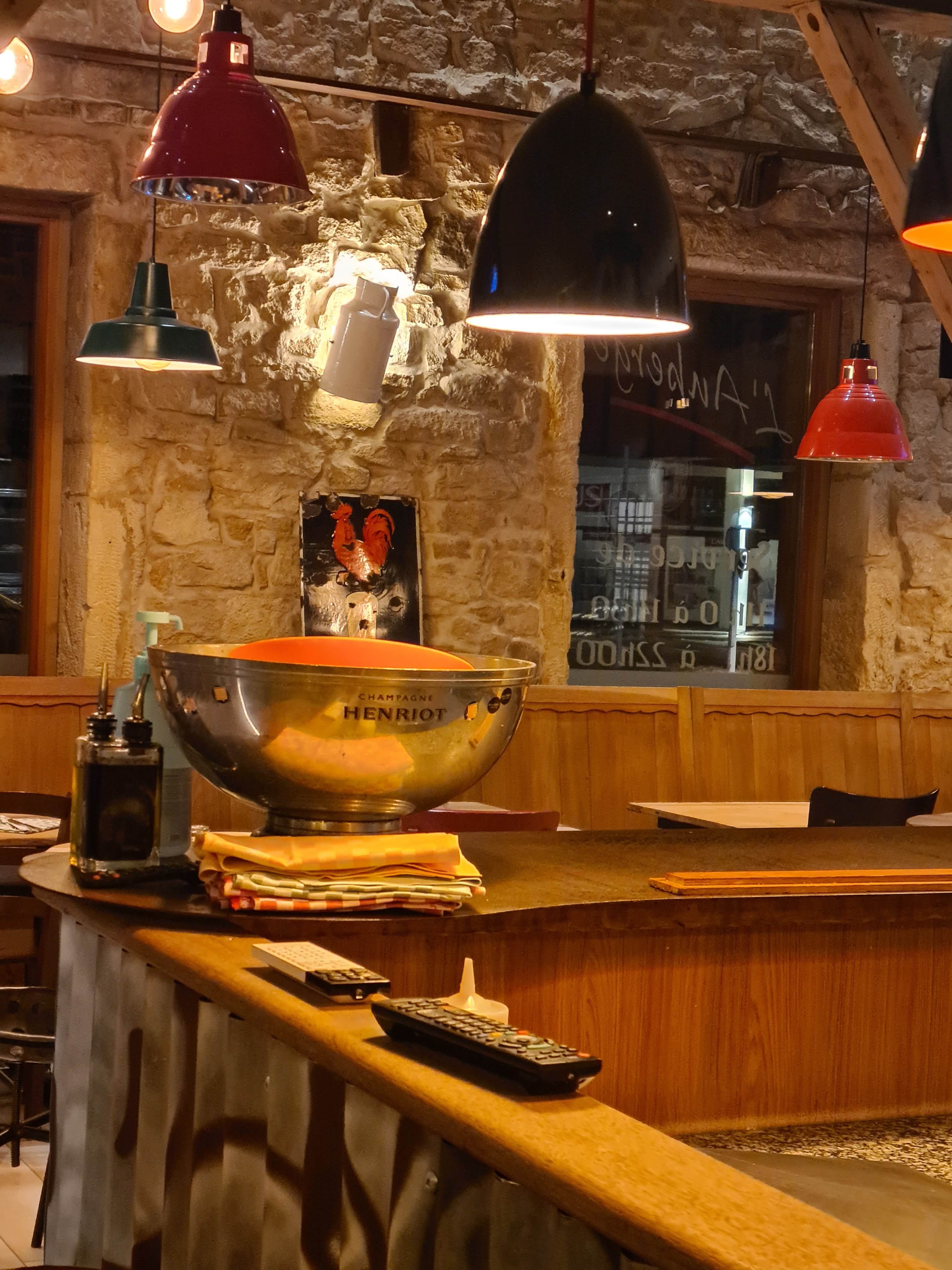 Une décoration sympa, à la fois moderne et rustique avec du bois et du métal. La salle principale donne sur la cuisine d’où sortent des plats raffinés – un faible pour les rognons – et sur le four à bois avec des Flammekueches que les Alsaciens doivent nous envier ! Des serviettes en tissu, des plats en fonte, un service dynamique et chaleureux et bien orchestré. Un restaurant à recommander.