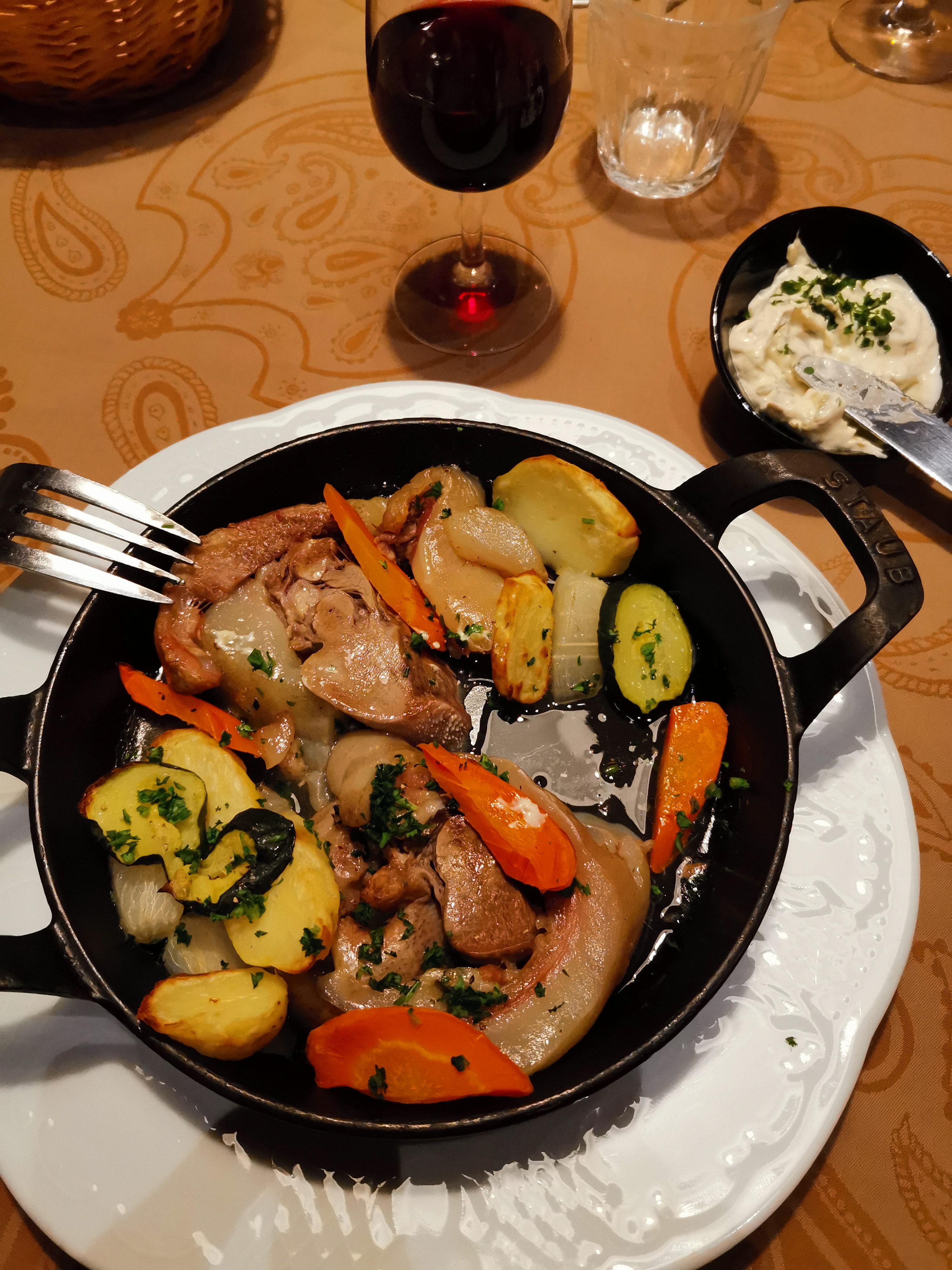 Super endroit où, de l accueil au repas tout c est bien déroulé. Une carte originale et à des prix plus que raisonnable dans une déco d Auberge. Alors n hésitez pas, Bravo et félicitations à toute l équipe de ce restaurant. Hélas je n ai pas pris en photo les plats des 6 convives que les pieds porc panés