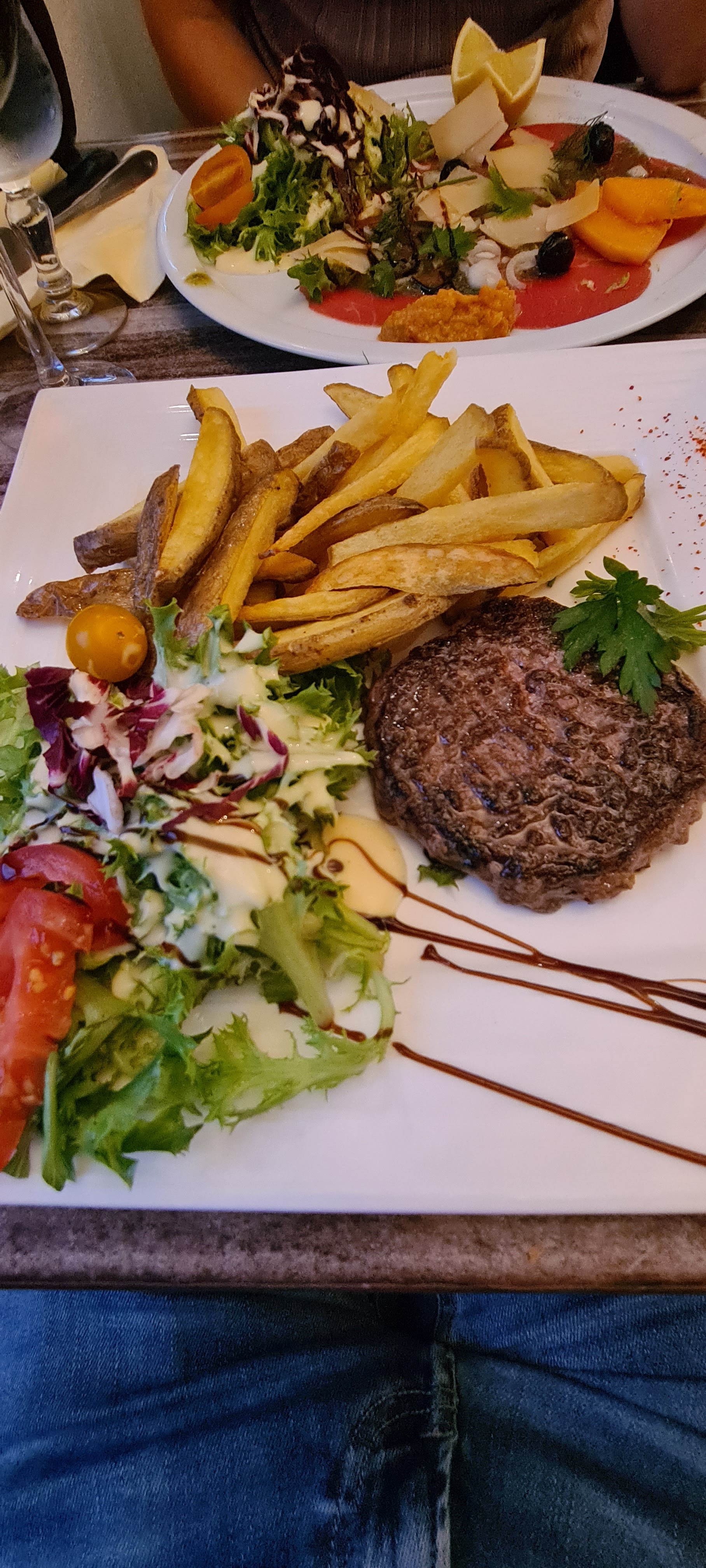 Nous, 2 adultes et 2 enfants âgés de 12 et 14 ans, avons trouvé cela absolument fantastique. Nous adorons ça maintenant ! Un petit restaurant qui ressemble à un mélange de bar, de pizzeria et d'autre chose ! Vous mangez littéralement parmi les Français locaux et la nourriture est vraiment excellente. D'une pizza pour une personne et d'une bonne salade pour l'autre. J'ai mangé un steak au poivre..... Super bonnes saveurs Hautement recommandé