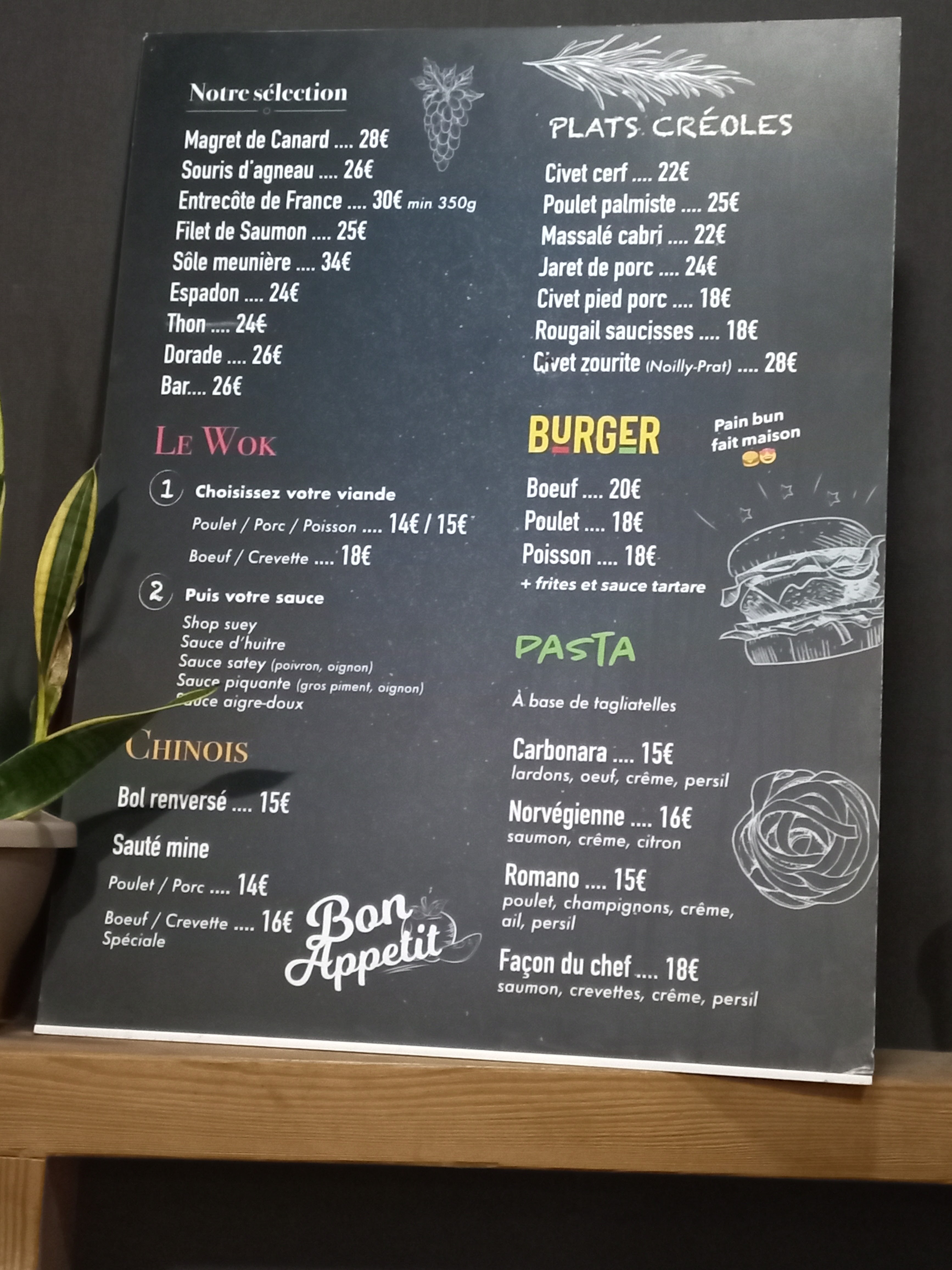 Dans ce restaurant, il y en aura pour tous les goûts. Des plats métro et des classiques créoles, mais aussi du wok et des mines (viande et sauce au choix), des burgers (pain maison et bien garni) et enfin des plats de pâte. Nous avons testé le poisson (arrivage le vendredi) et le burger... on s'est régalé, cuison impeccable, petite sauce maison qui va bien et joli présentation. Et pour les desserts, c'est du fait maison! L'équipe est au petit soins avec les clients, une équipe jeune, dynamique et très pro. le service à été un peu long mais la salle était pleine avec une grosse réservation (pour un baptême) mais rien de grave car la vue sur l'océan et l'air du large était là. Gamme de prix plat de 15 à 25€ Si vous prévoyez un moelleux au chocolat ou une tarte tatin en dessert, c'est cuit à la minute. Donc si vous êtes limité en temps, commandez les en même temps que le plat😉