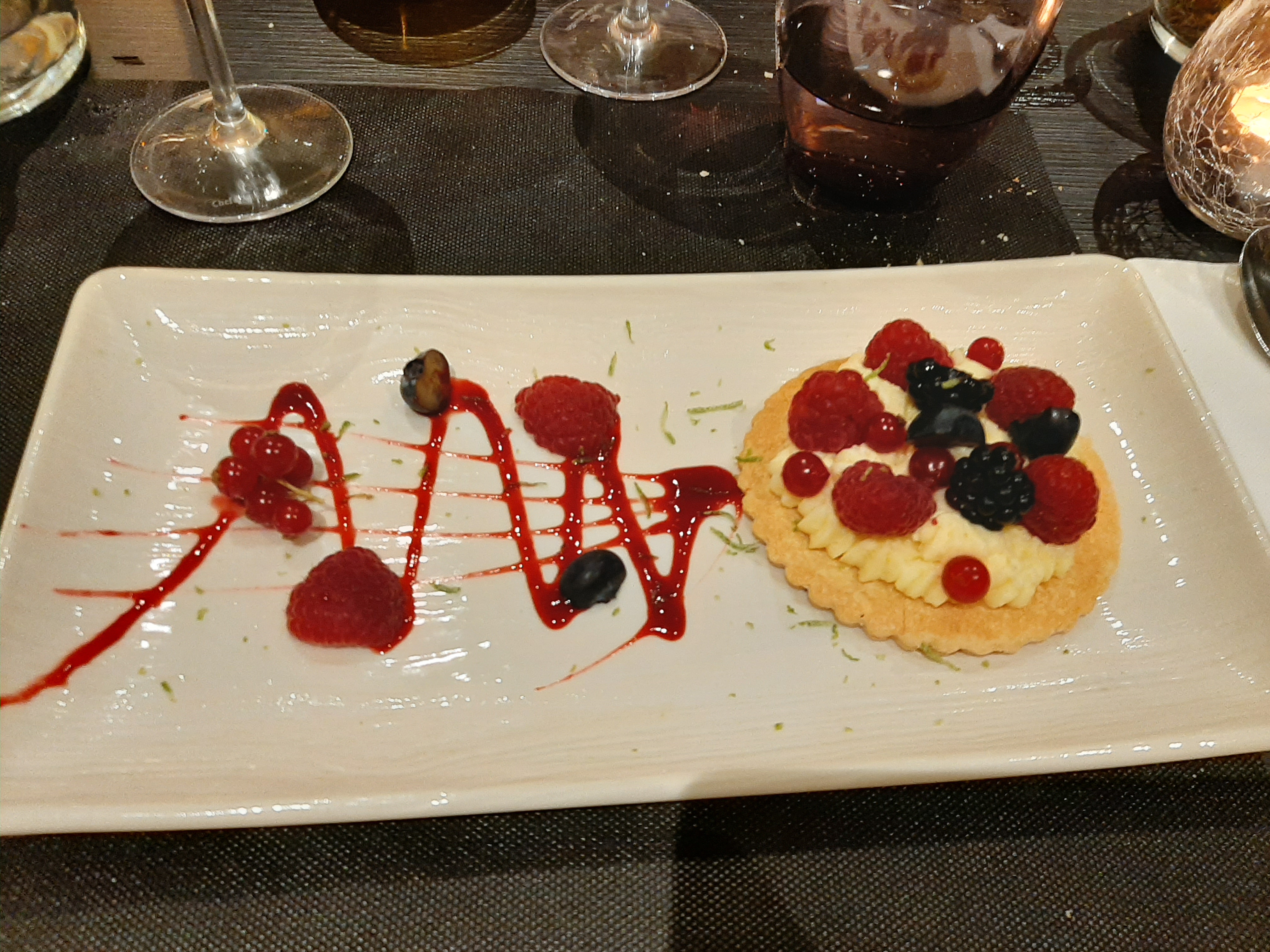 Repas et service au top. Les plats, de l entrée au dessert, sont gourmands, originaux et superbement présentés. La prise en compte du régime sans gluten est remarquable d attention et de maîtrise pour que nous puissions tous passer un moment des plus agréables. On recommande vivement.