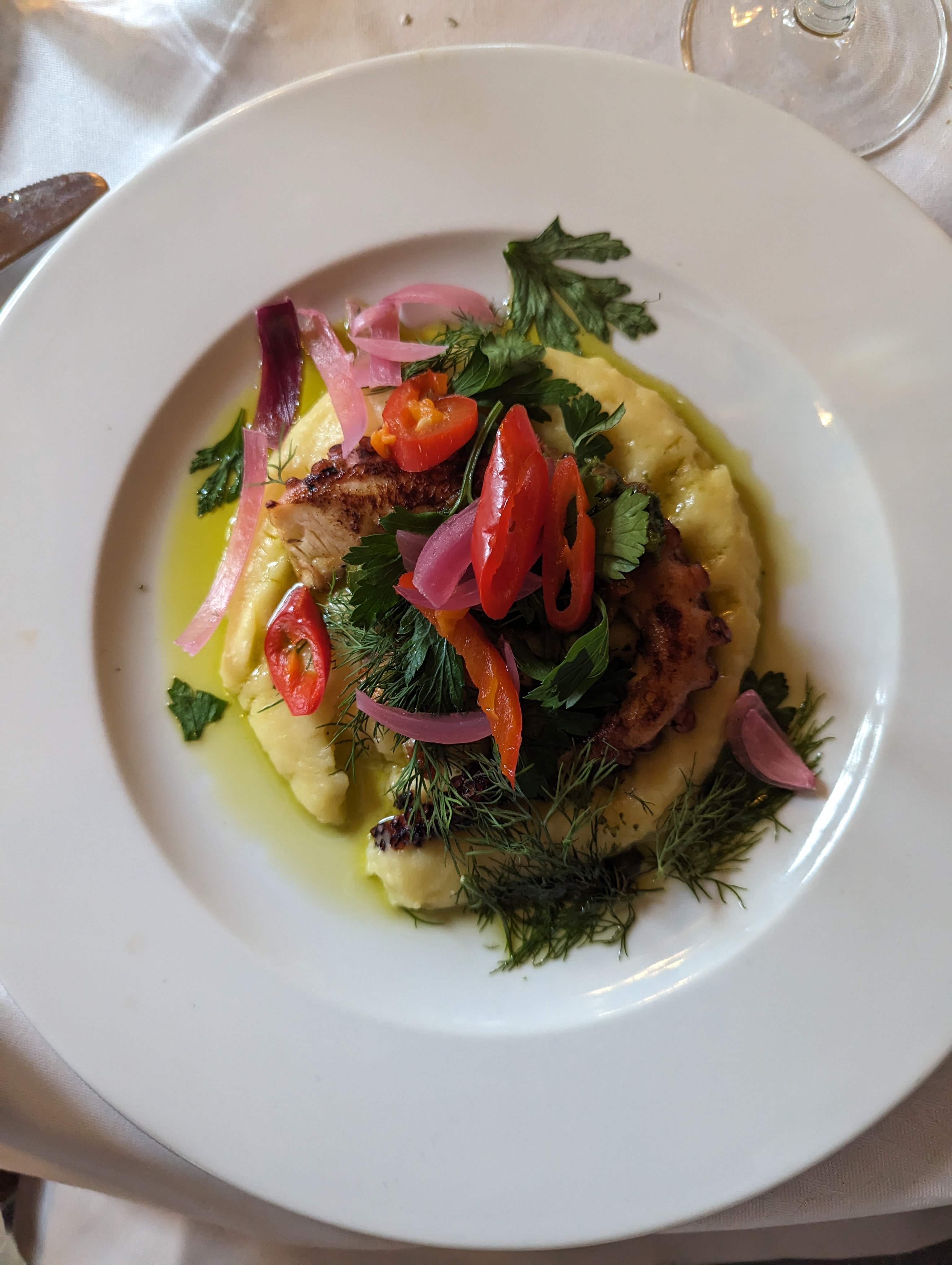 Rien à dire sur la cuisine, le repas était excellent mais les serveurs devraient apprendre leur métier, aucune politesse envers les clients et le service était extrêmement long ... Également beaucoup de bruit à l’intérieur du restaurant du à la proximité des tables.