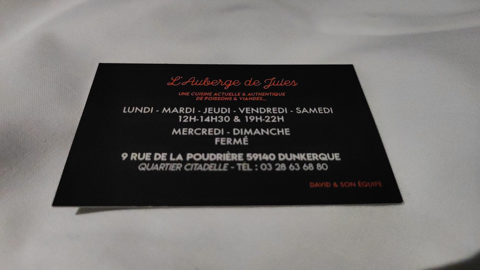 bonsoir, de passage à Dunkerque, je me suis arrêté à l auberge de Jules. l accueil est impeccable, la cuisine est très raffinés, c est l excellence. l ambiance est impeccable. Je recommande très fortement. je reviendrai.