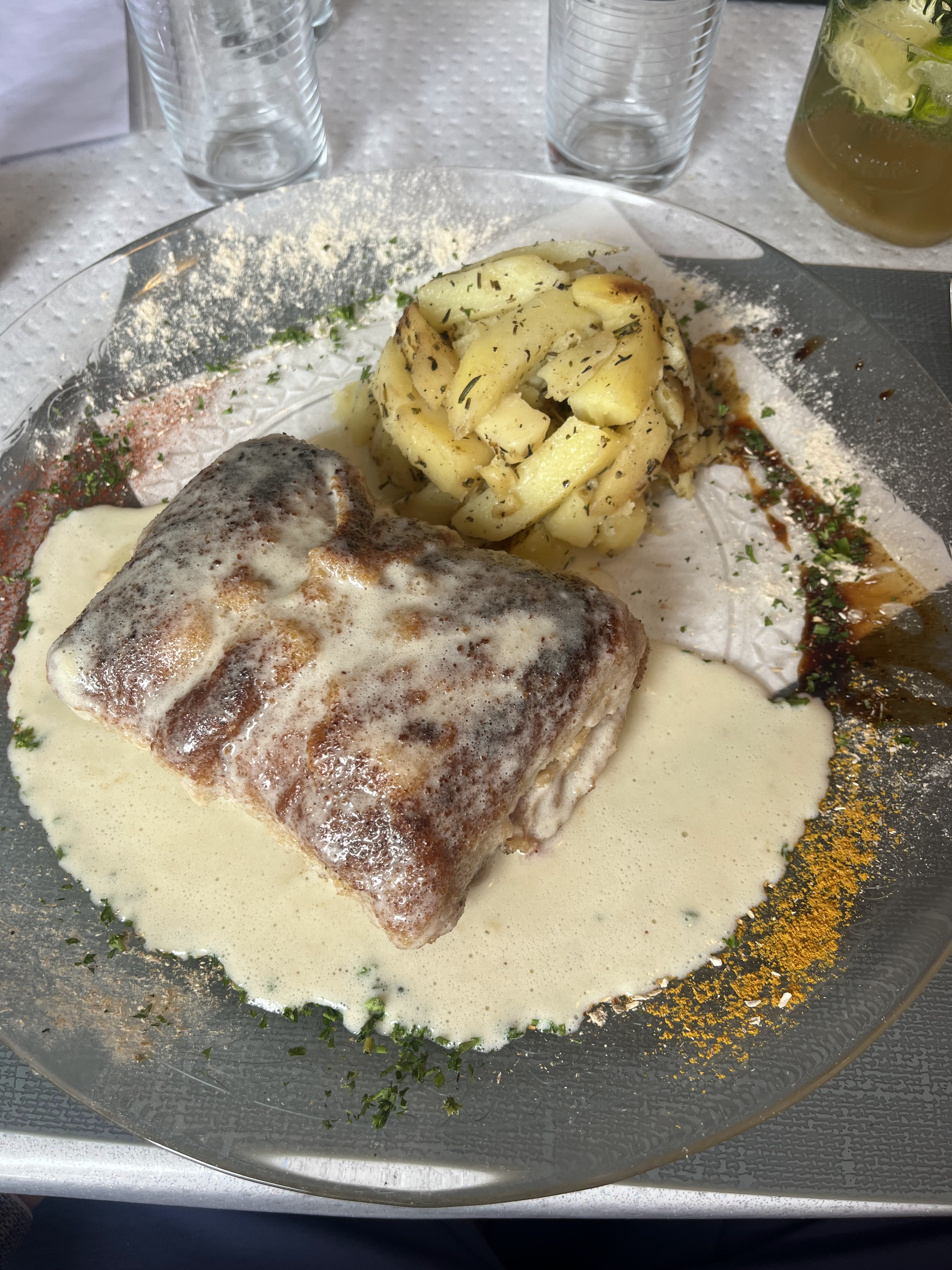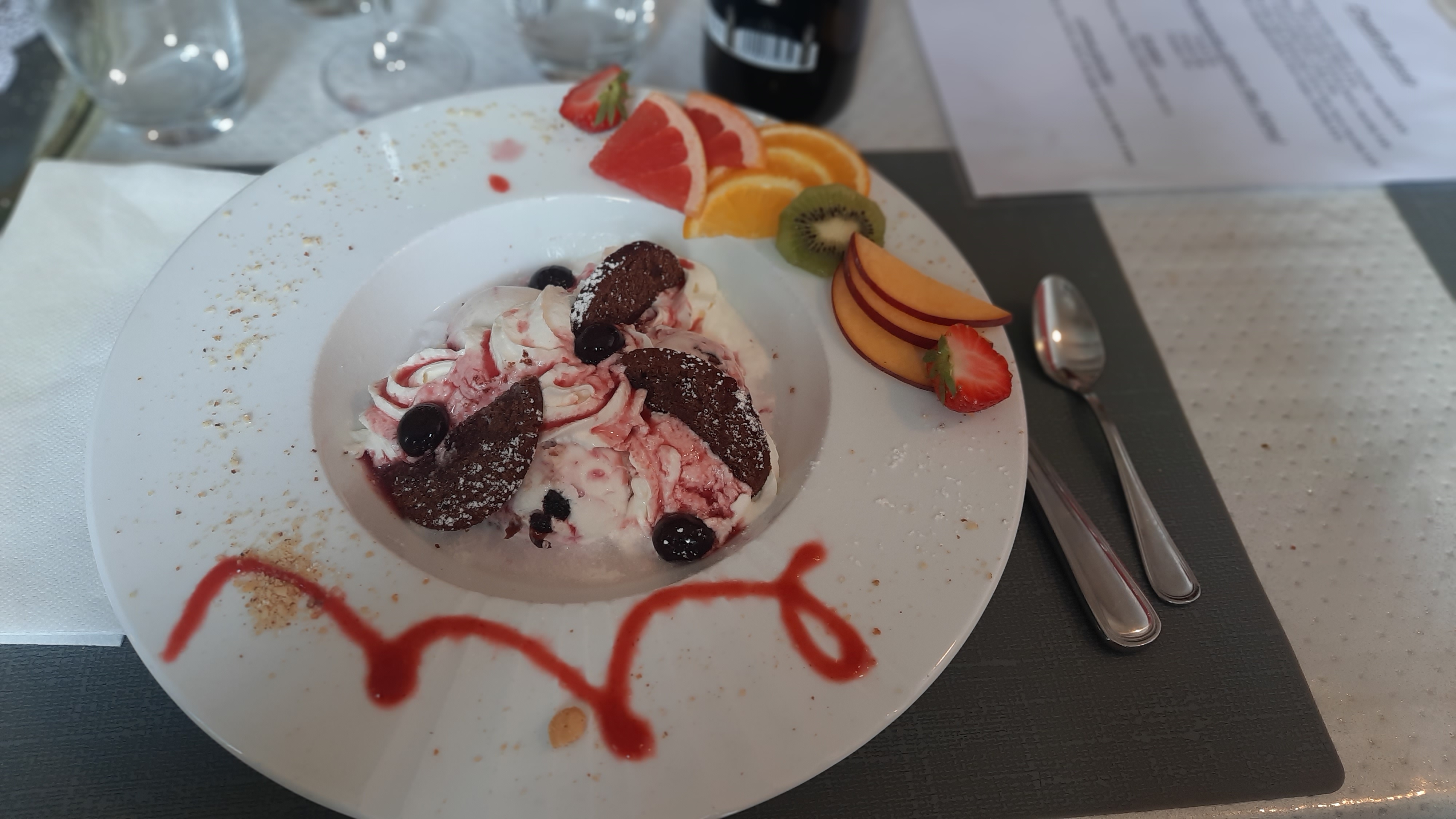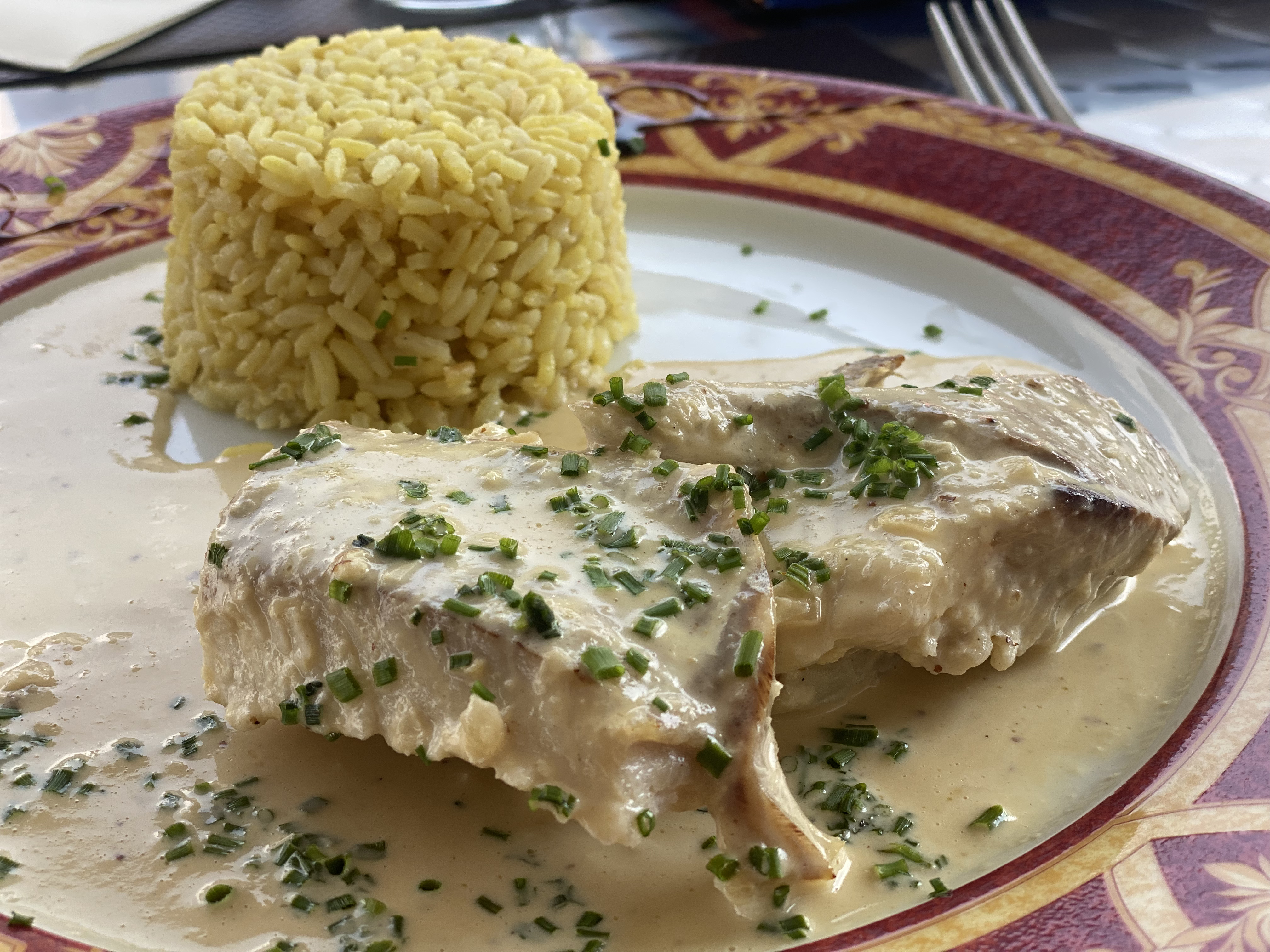 Poisson a la mirabelle étais excellent accompagné avec ses pommes de terres. J'ai pu goûté le vin de fraise vraiment très bon. Le service et le personnel est irréprochable