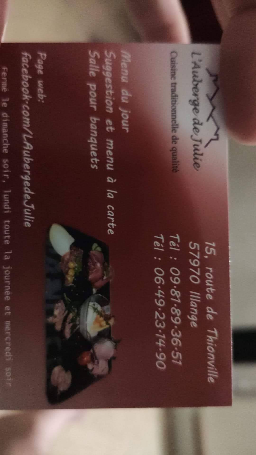 Auberge de Julie lieu convivial avec un accueil familial prix raisonnable. Nourriture plus qu' excellente Je conseille le jambonneau ou son cordon bleu une repas terminé vous ne manger plus avant le lendemain copieux ,de plus produit frais je co nseil .Merci aux patrons pour leurs accueil et au chef pour sa cuisine ☆☆☆☆ Parole de Lyonnais