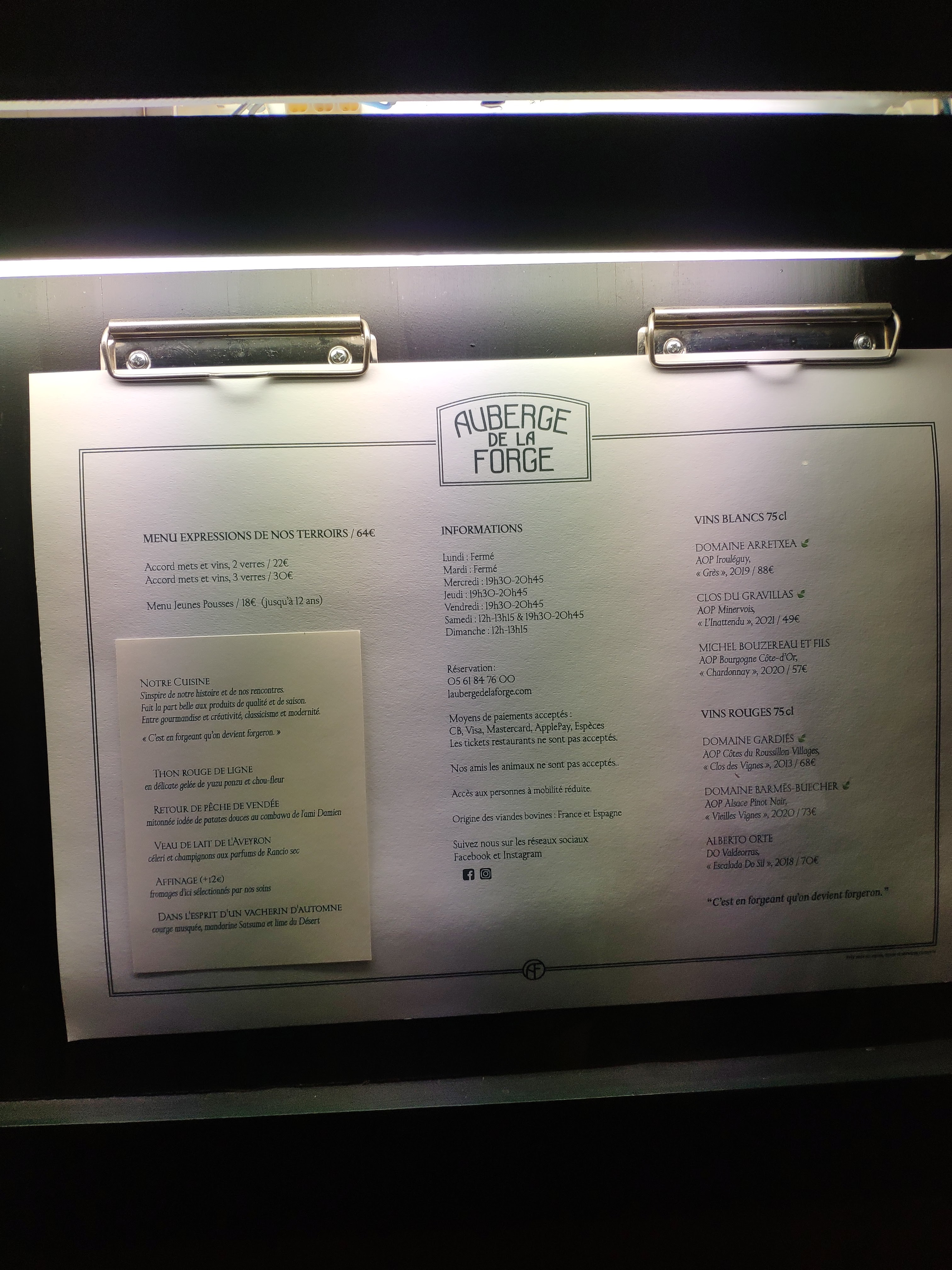 Très bon accueil, cadre chaleureux et cosy, personnel très agréable et souriant, cuisine raffinée, très savoureuse, un délice; nous avons passé un excellent moment à l’Auberge de la Forge, tout était parfait! Je recommande vivement cet établissement!