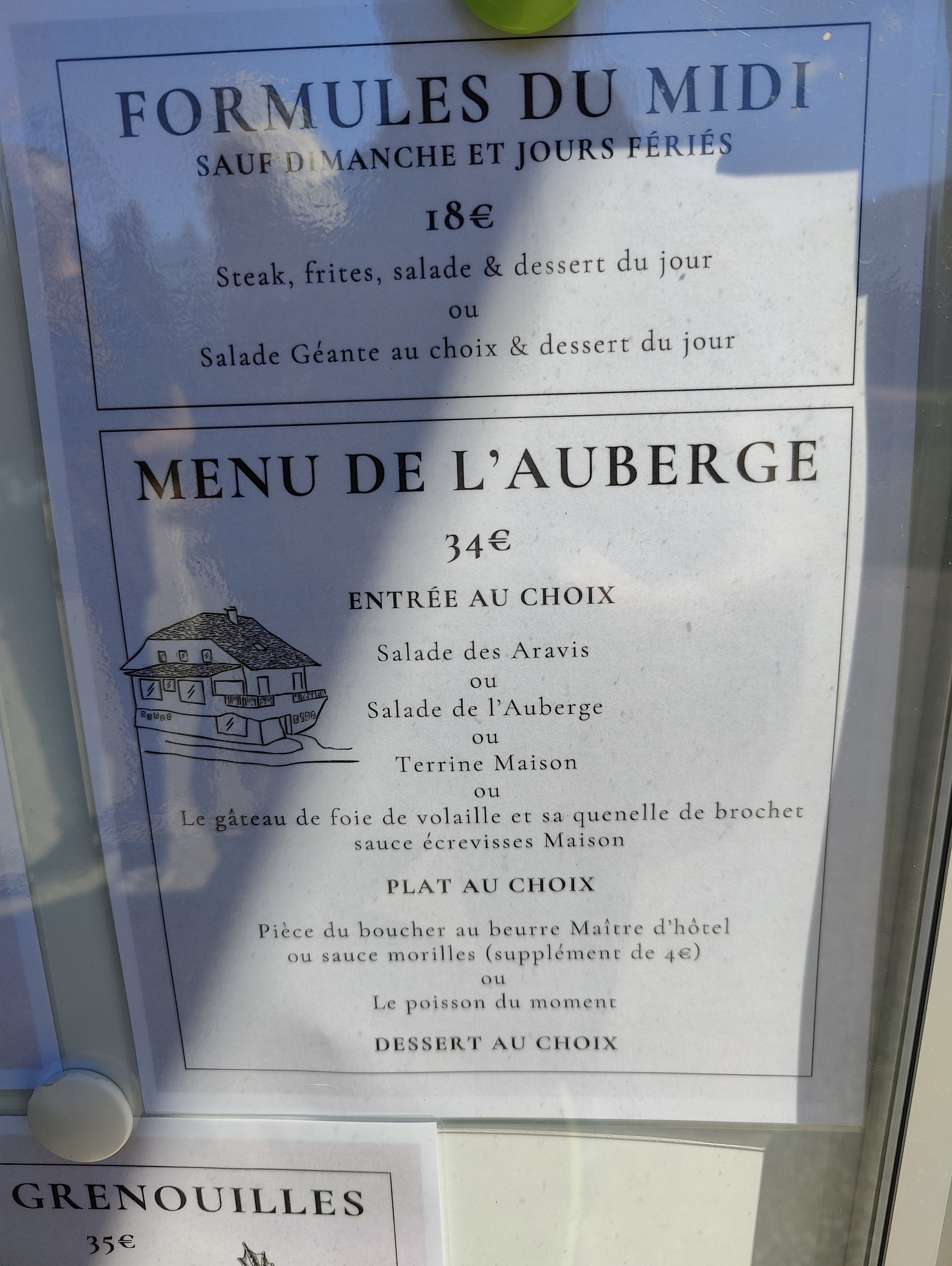 menu grenouilles très copieux service royale part deux serveuses au top et aux petits soin prix très correcte je recommande cette établissement