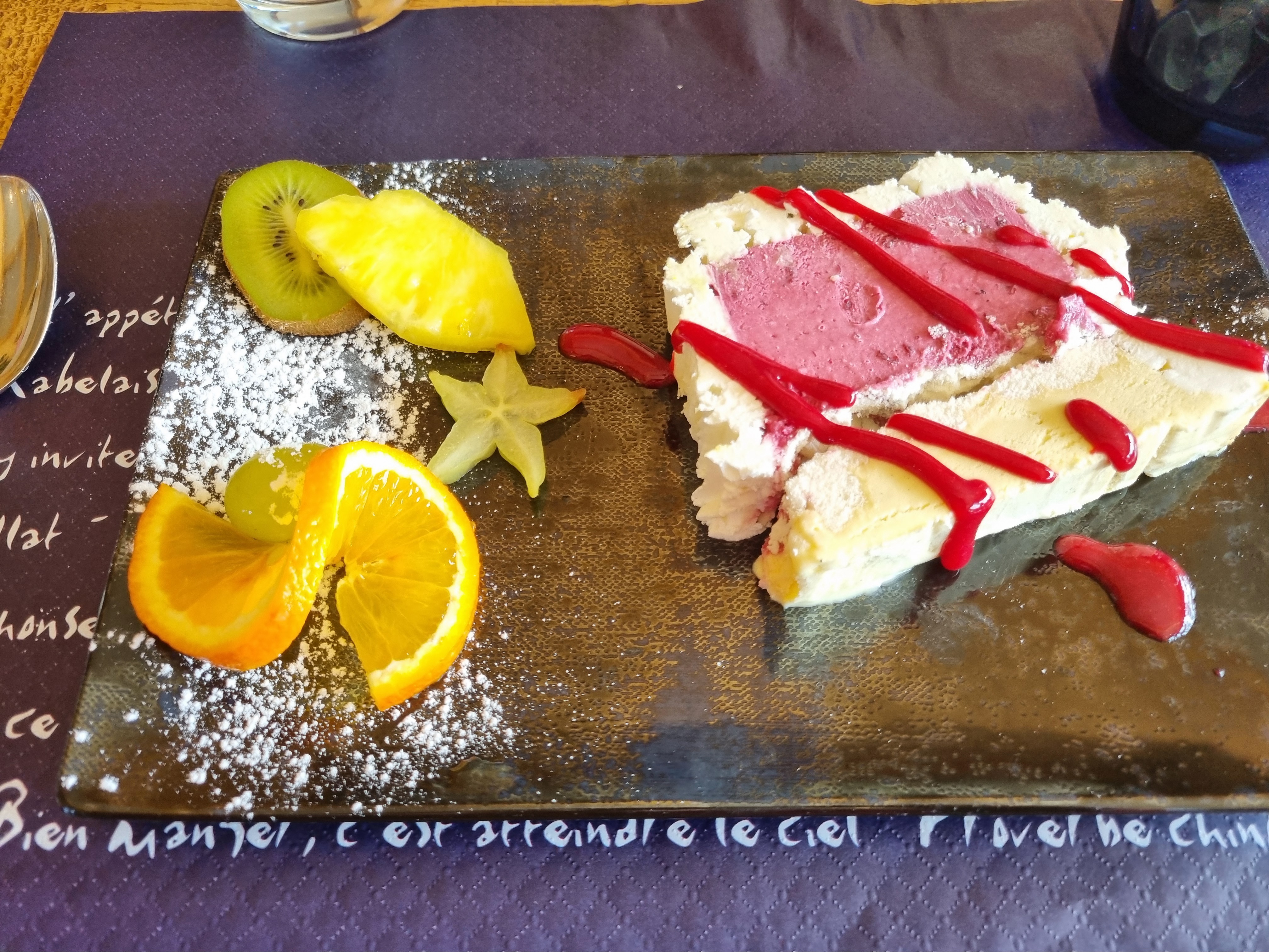 Repas excellent : tartiflette, salade repas et frites délicieuses ce qui est rare pour un restaurant. Quel dommage sur la fin avec une toute petite salade de fruits industrielle en seau. Autant ne pas la proposer.
