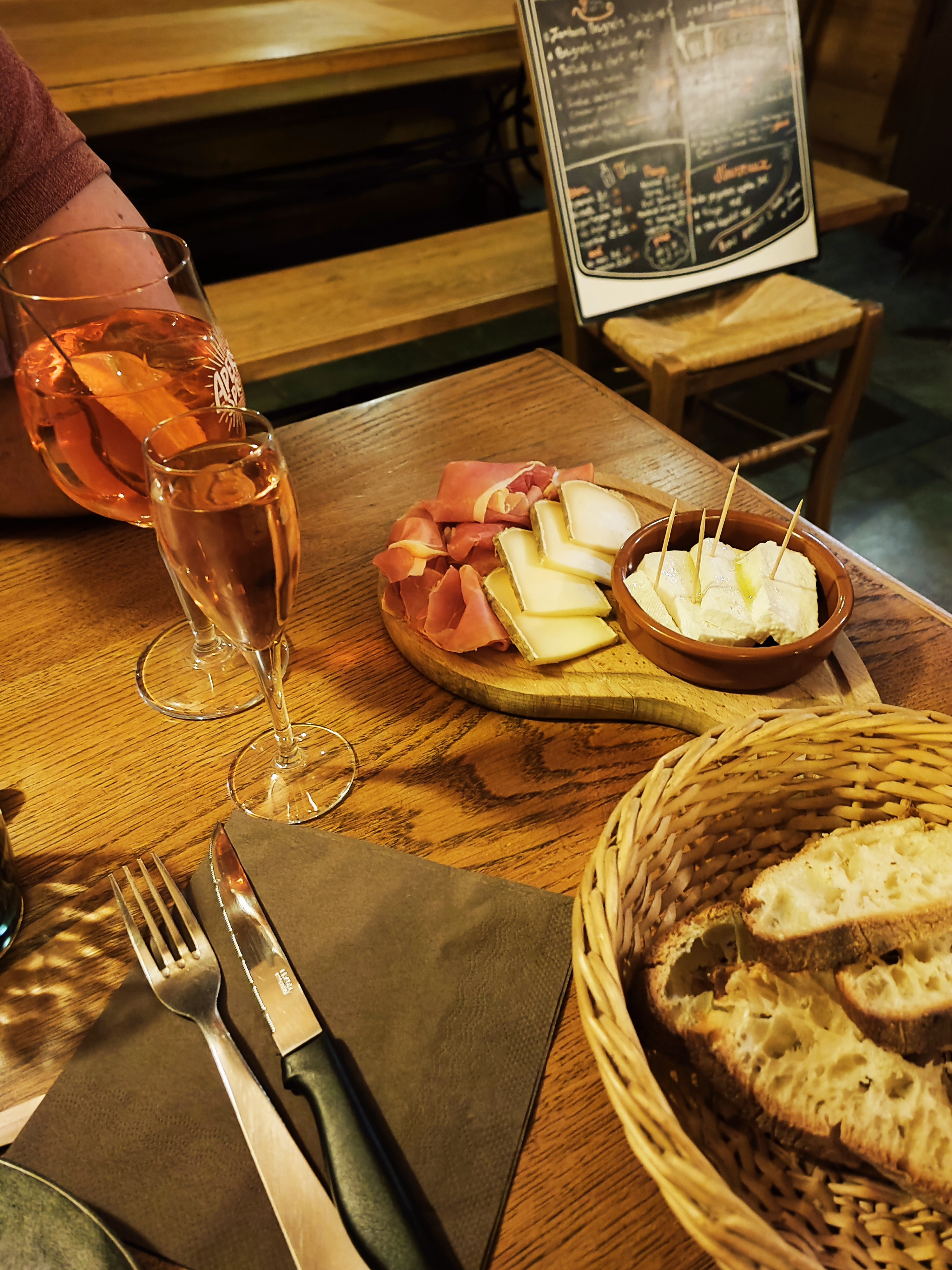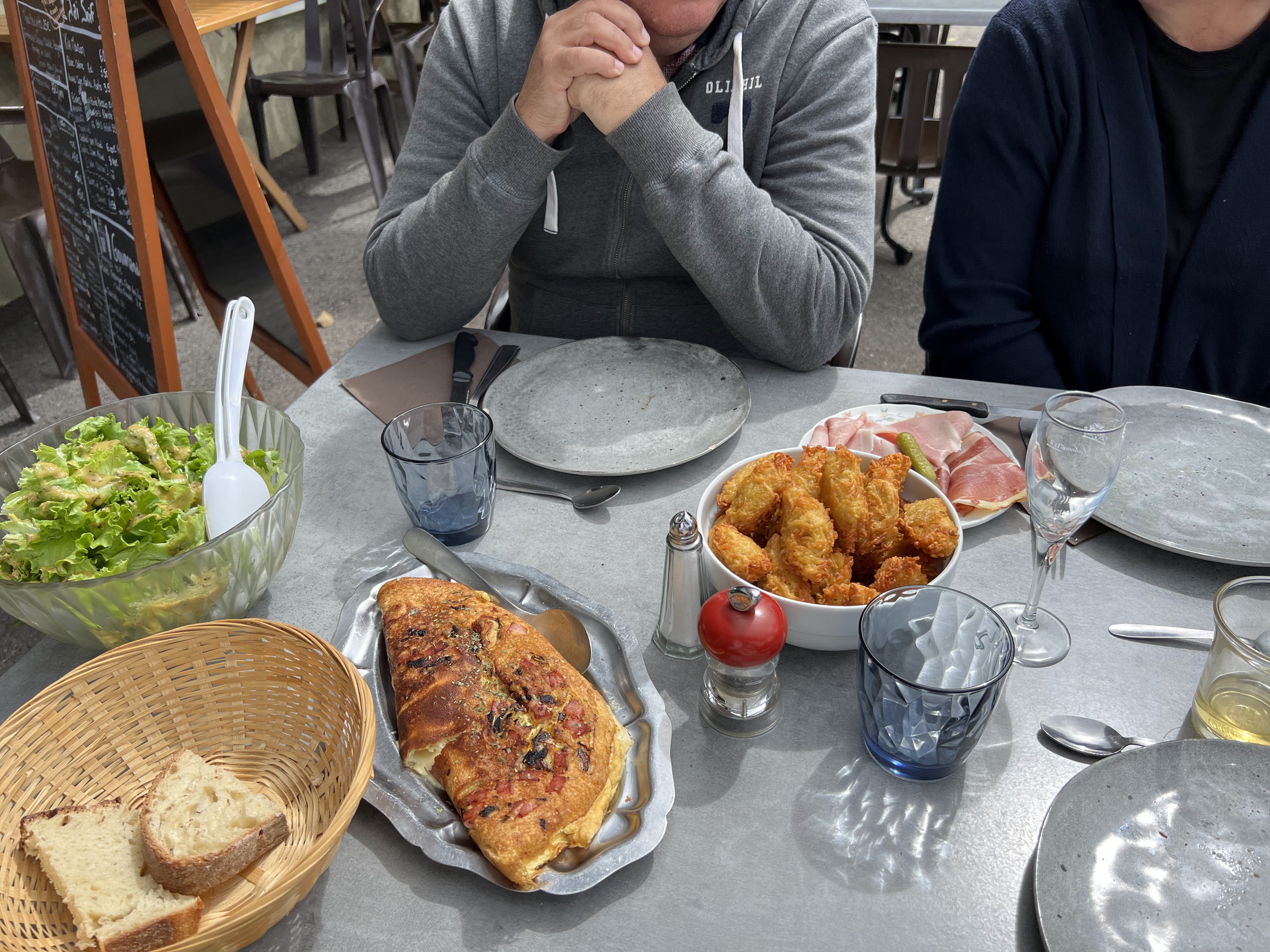 Nous avons mangé aujourd'hui une délicieuse reblochonnade accompagnée de merveilleux beignets de pomme de terre, jambon de pays et salade. Très bons conseils donnés par Gaëlle quant au choix du vin, un Chignon Bergeron 2019. En dessert bolet et café gourmand. Le tout préparé par Yannick, avec qui nous avions discuté la veille après notre balade. Vous pouvez y aller les yeux fermés !
