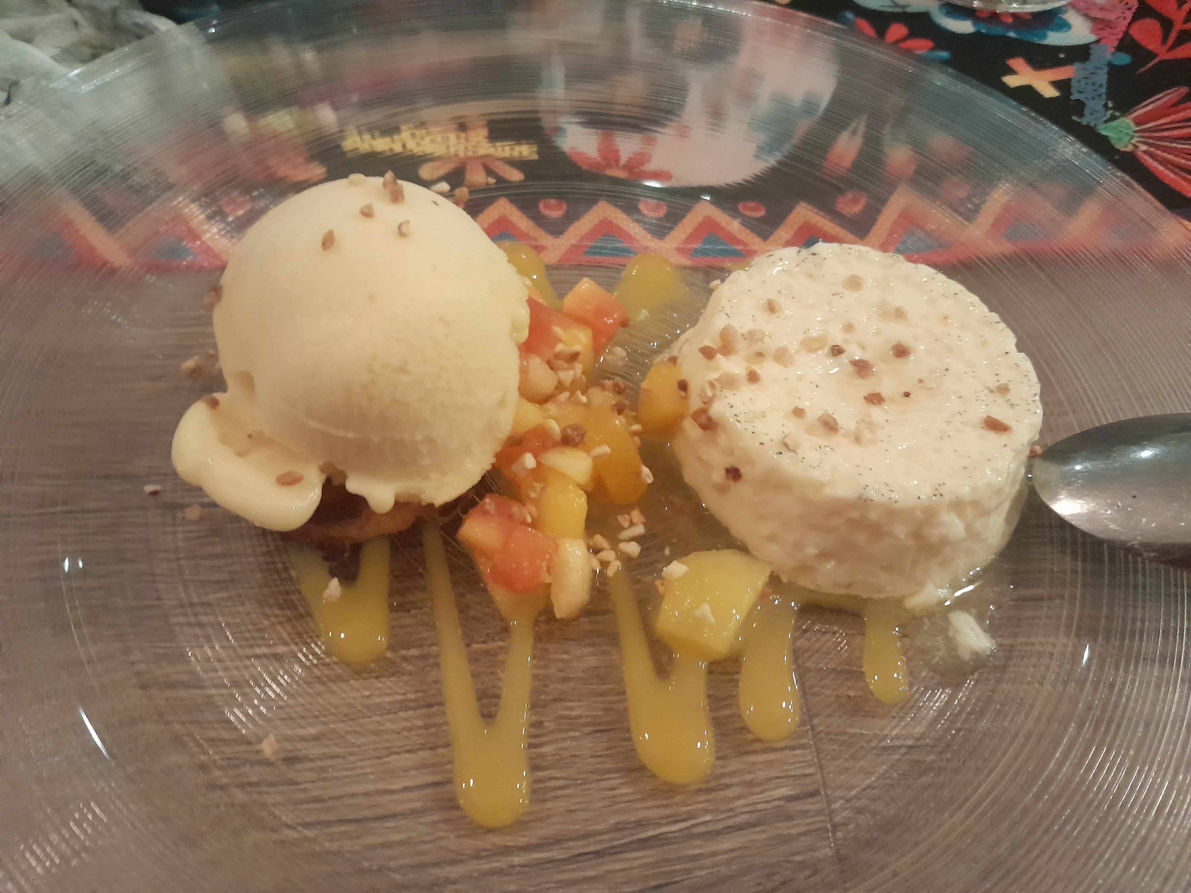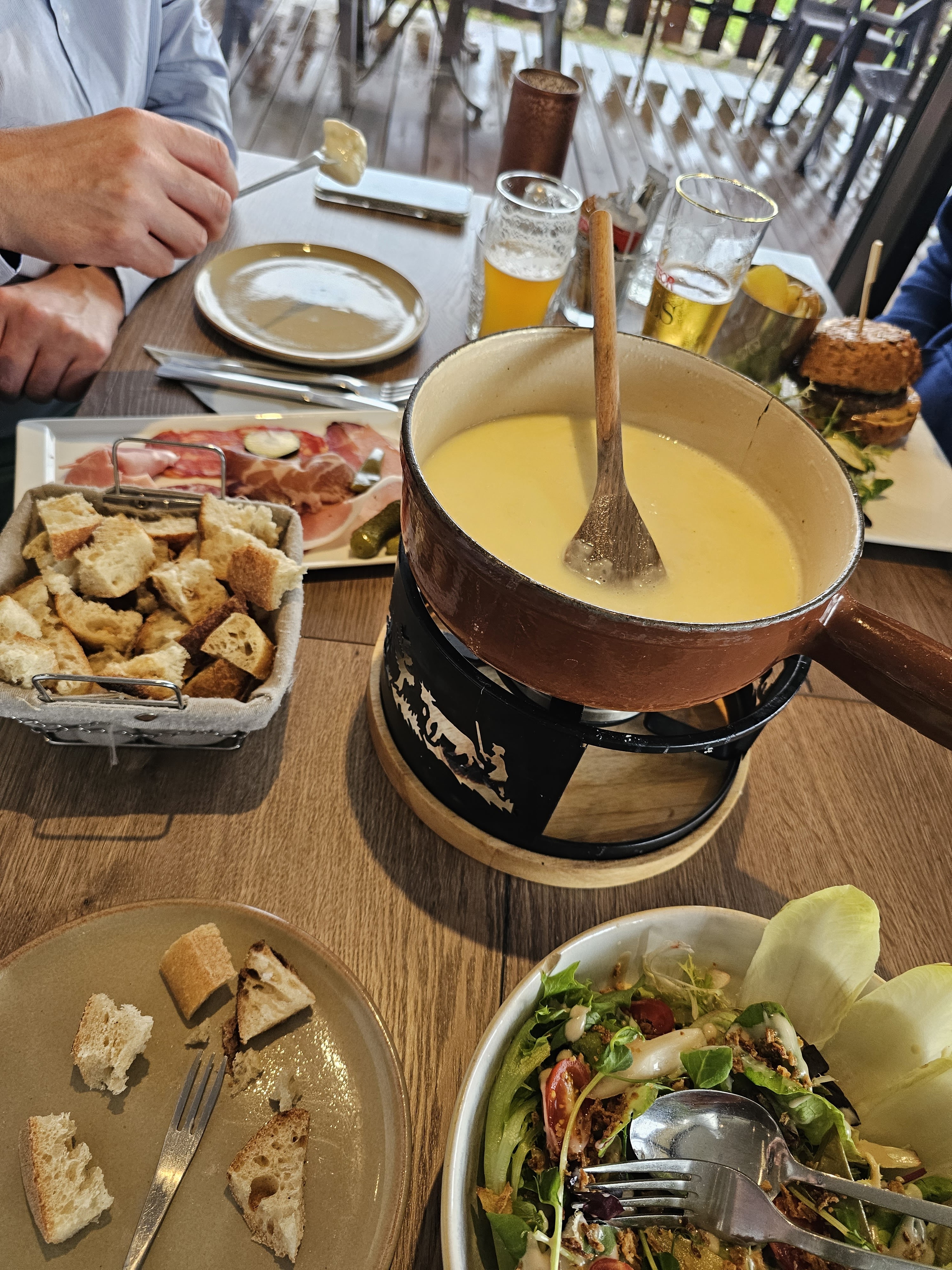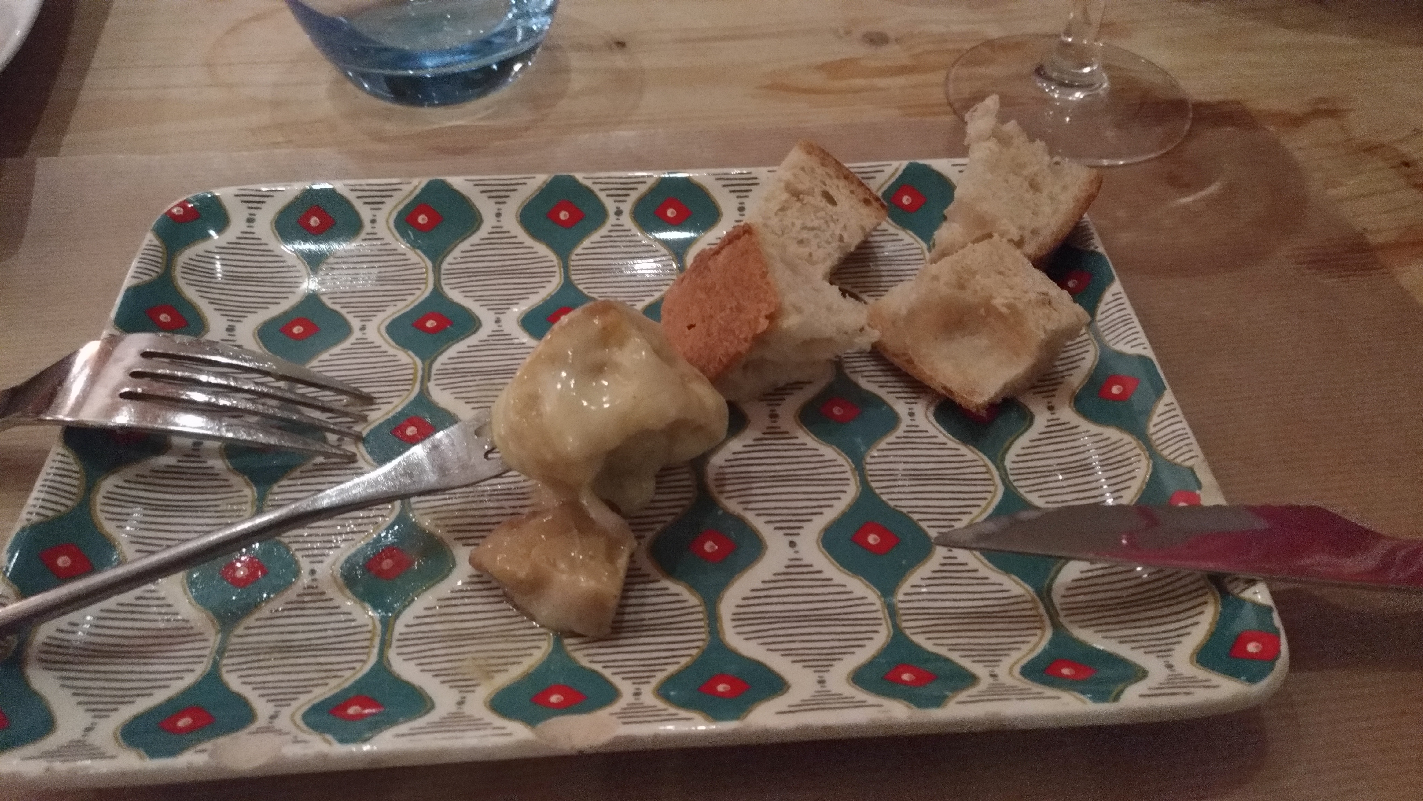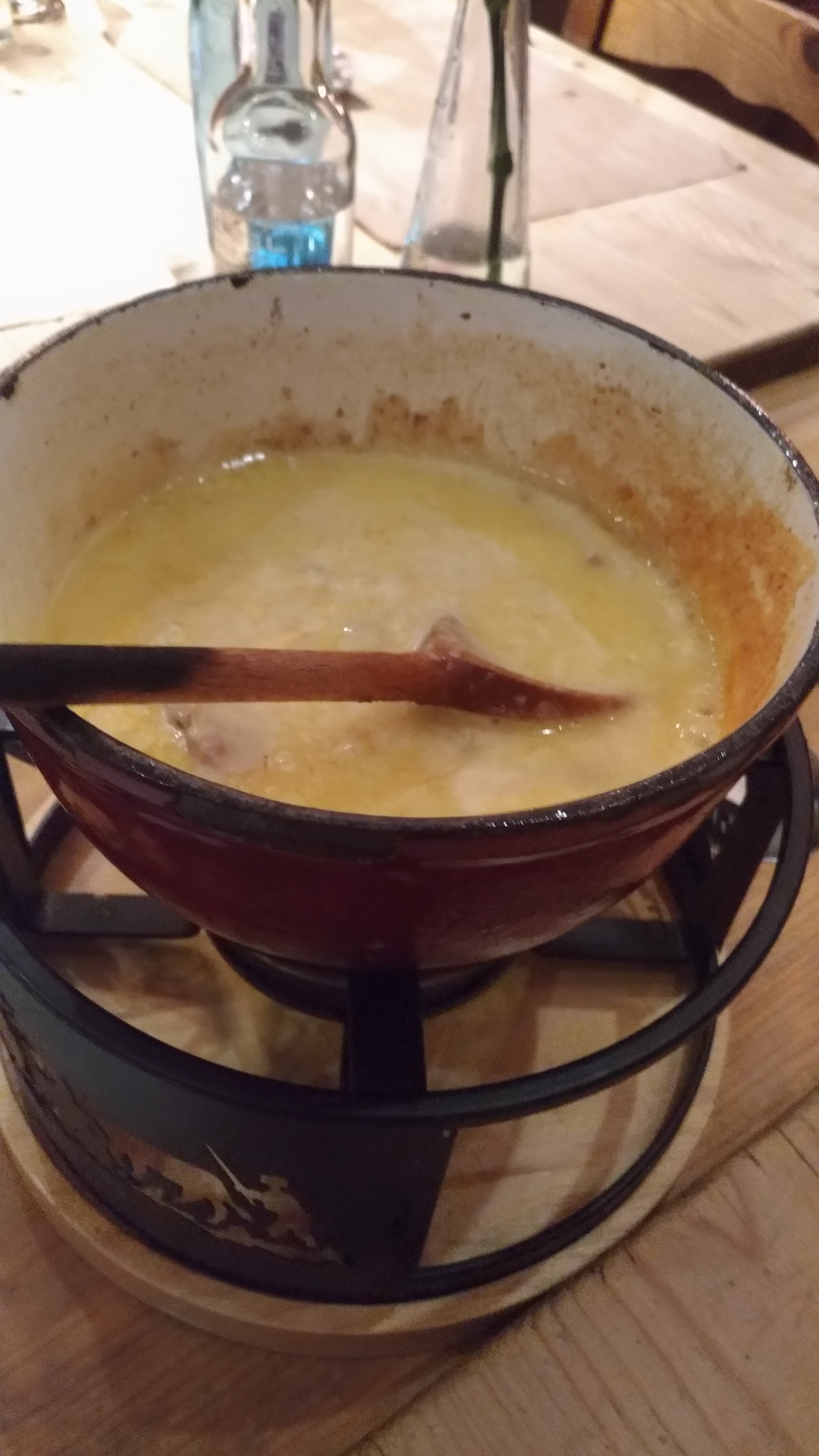 Nous avons pris une fondue au fromage. On n’est pas des gros mangeurs et pourtant on a trouvé que les quantités étaient un peu justes. Dommage.