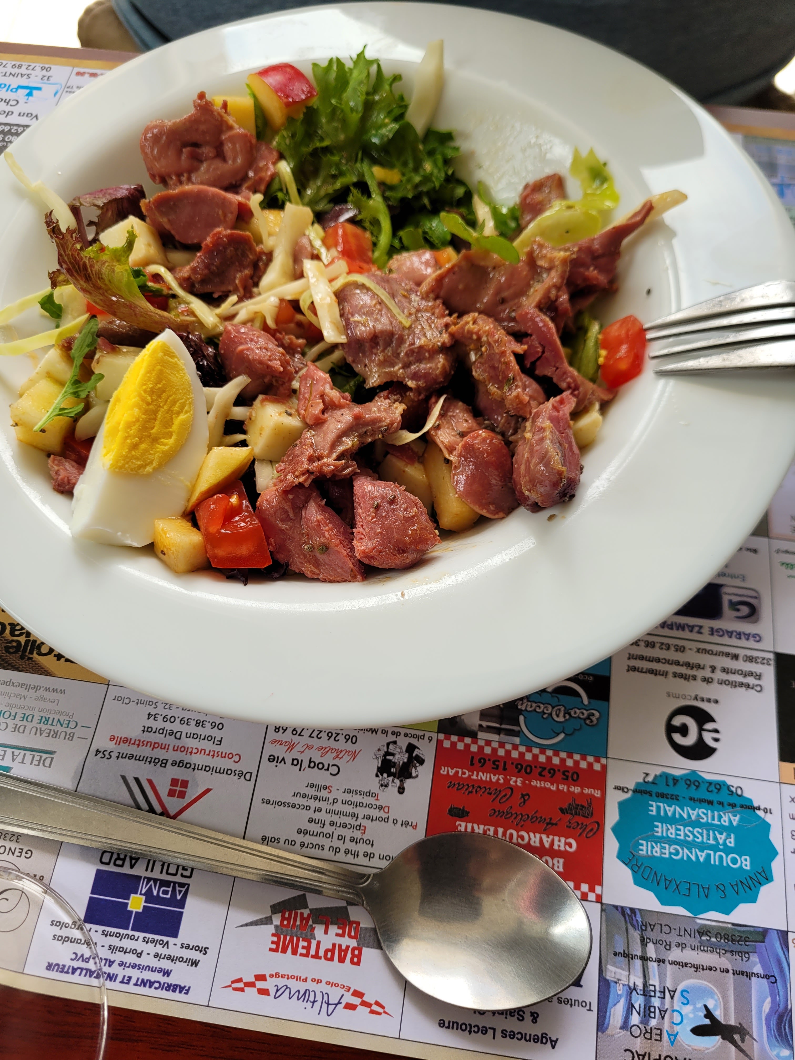 Nous avons fort bien déjeuné Magret très bonne qualité et bien présenté avec légumes sautés, frites et salade. Desserts maison aussi excellents, avons testé feuilleté aux pommes caramélisées en forme de rose avec boule de glace et crème ... délicieux