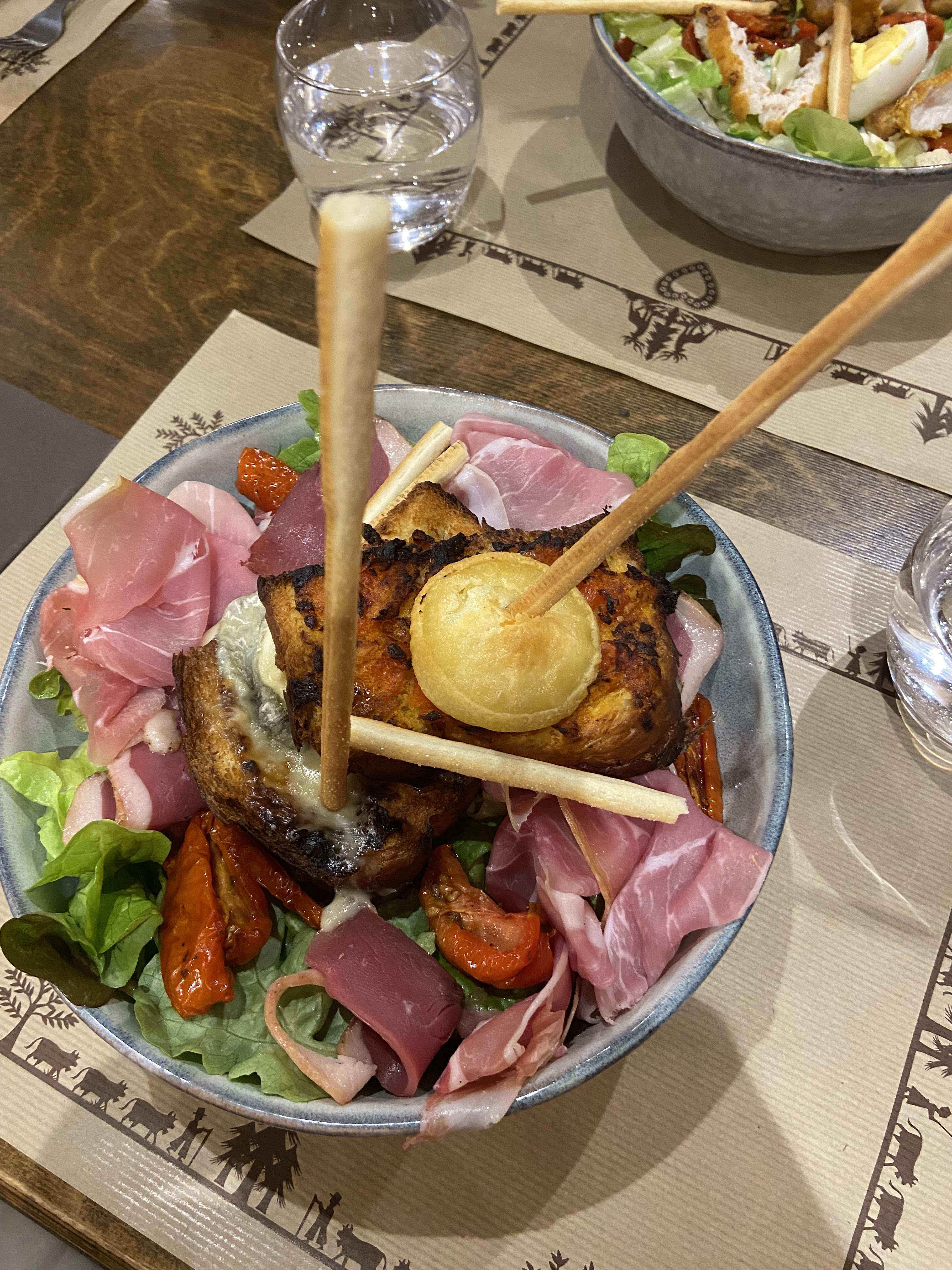 Menu de fin d'année très moyen dire presque bas de gamme. Les deux photos représentent le plat de fromage servi avant le dessert, où plus précisément une tranche fine d'une variété de fromage inconnue gratiné (presque cramé ) au four, sur une tranche de pain d'épices et puis servie sur un lit de salade basique sans plus !! Autant dire que la déception était à son comble et aucun de nous l'a mangé, surtout après la déception des plats précédents. Malheureusement je n'ai pas d'autres photos, mais ceux là sont assez représentatives. Une désillusion pour finir l'année, mais ça ne nous a pas empêché de bien démarrer 2019.