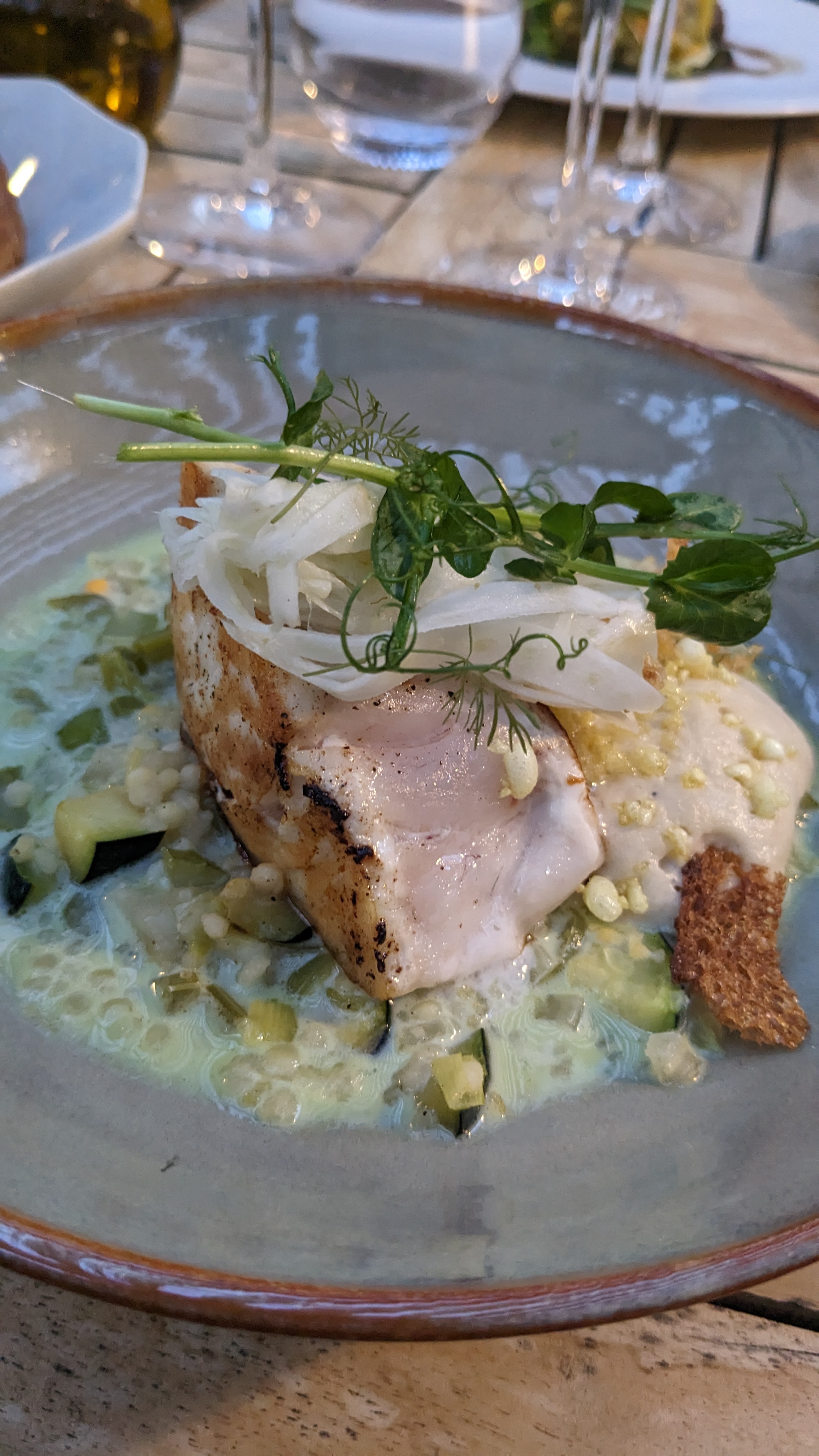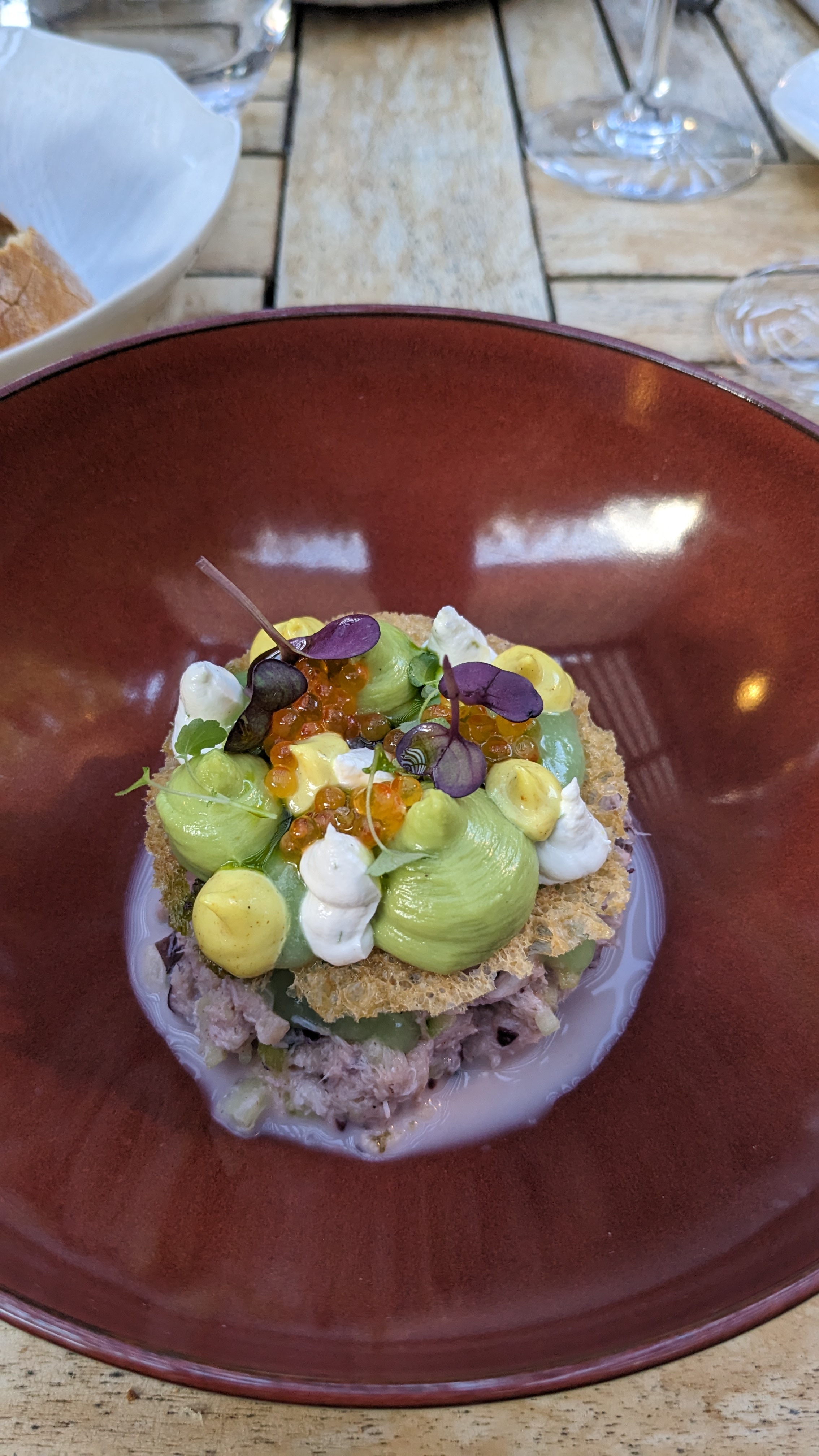 Bon restaurant mais un peu déçue par l'apéritif accompagné de noix de cajou pour un tel établissement je m'attendais à une petite mise en bouche. Service un peu trop rapide. Assiette vide : une autre assiette pleine arrive aussitôt... agréable décor et très joli village à visiter. Les plats et les produits sont de qualité mais sans présentation au moment du service. Dommage