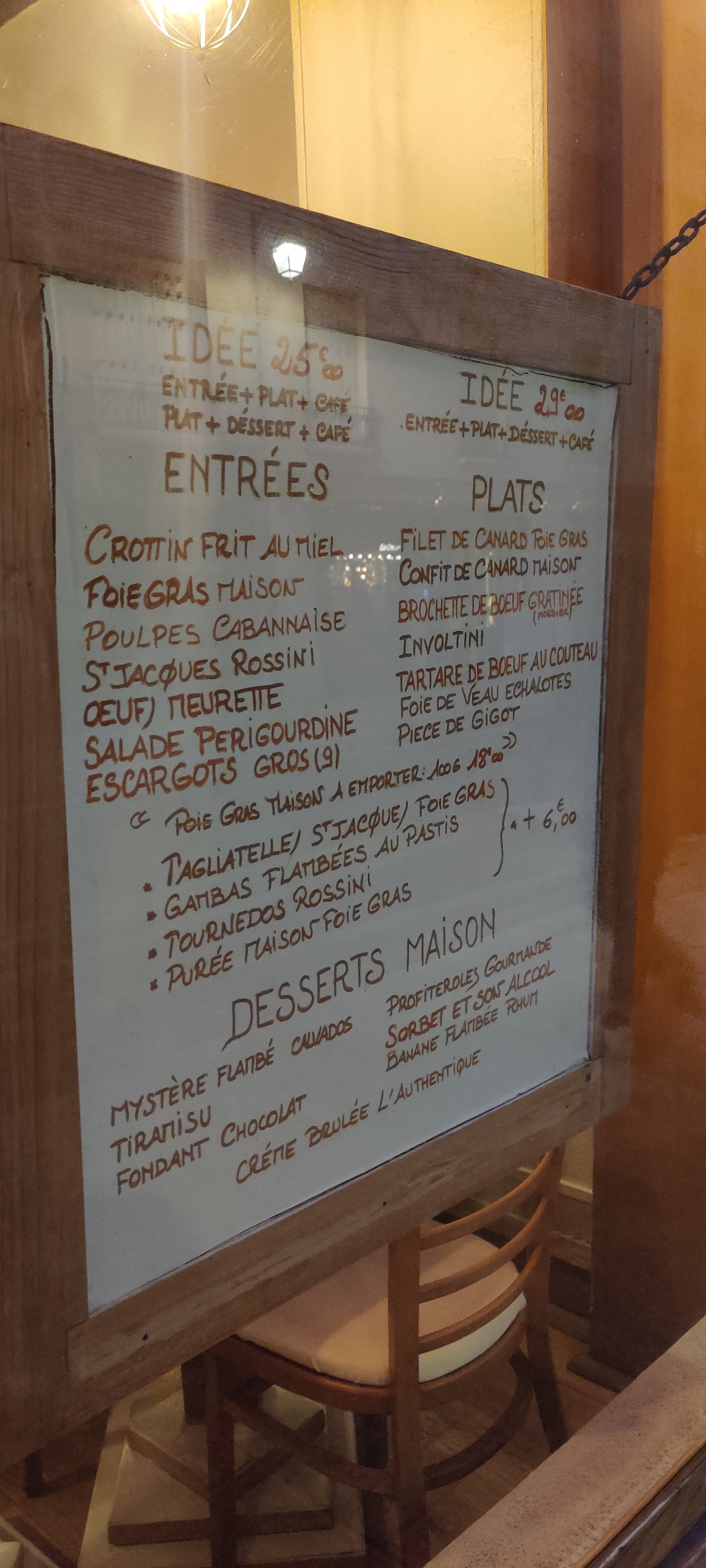 J'ai commencé à me demander où j´étais en entrant dans le resto: à 20h30 un mardi soir, j'étais le seul client. Un vieux monsieur était posé sur une chaise au fond, écoutant un commentateur sportif à la radio. Le resto était pourtant bien noté. Doute. Je m'assois quand même. J´en profite pour lire quelques avis Google, très tranchés: les gens aiment ou détestent. Bien, je tremble un peu. Le patron est un vieux taiseux, qui gromelle, ne sourit pas. Il fait tout tout seul: la cuisine et la salle. Ambiance rustique, salle chauffée avec un vieux radiateur à bain d'huile branché sur une prise entre deux tables. Les tables de bois collent un peu, ca doit pas avoir bougé depuis 1975. On verrait passer une chèvre ou un canard au milieu de la salle que ça détonerait pas. Sur la carte, il y a du foie gras partout. Pas étonnant: le patron le fait lui-même. Je me décide pour un filet de canard... au foie gras, accompagné d'un verre de Jurançon pour ajouter un peu de fraicheur sucrée. La cuisine est visible depuis la salle. Ca a l'air propre, mon hôte s'affaire, me demande la cuisson du canard, en quatre mots. Le plat est rustique. De la cuisine de refuge: de la patate, du gras, de bonnes odeurs, pas de chichi. C´est bon. Le morceau de foie gras fond doucement posé sur son filet. Peu relevé, il a gout à... canard, c'est agréable. La cuisson demandée est respectée, la viande est tendre, la salle toujours silencieuse, je suis le seul client. La radio du patron diffuse à présent quelques classiques contemporains à la déco. Le Jurançon est jeune. J´ai pas demandé le nom: il est bien fruité ce qui nettoie bien le gras du canard. En dessert, crème brûlée, devant moi, au fer chaud. Je ne connaissais pas la technique et me retrouve pris dans la vapeur du sucre caramélisant. Chef ne m'a pas prévenu. Il ne dit rien. Je parie qu'il s'amuse le bougre. Le caramel de la crème est un peu trop épais pour moi, elle a la peau dure et il faut taper fort de la cuillère pour accéder au dessert. C'est finalement une bonne allégorie du périgord cette crème. 33€ pour tout ca: 26 de plat+dessert+café et 7 de vin. A Paris ca les vaut, mais sommes-nous vraiment à Paris ? Un temps, je me suis cru à Souillac, et il a fallu l'odeur de pisse et de Seine en sortant du resto pour rappeler que cette enclave de Sud est sur l'ile Saint Louis.