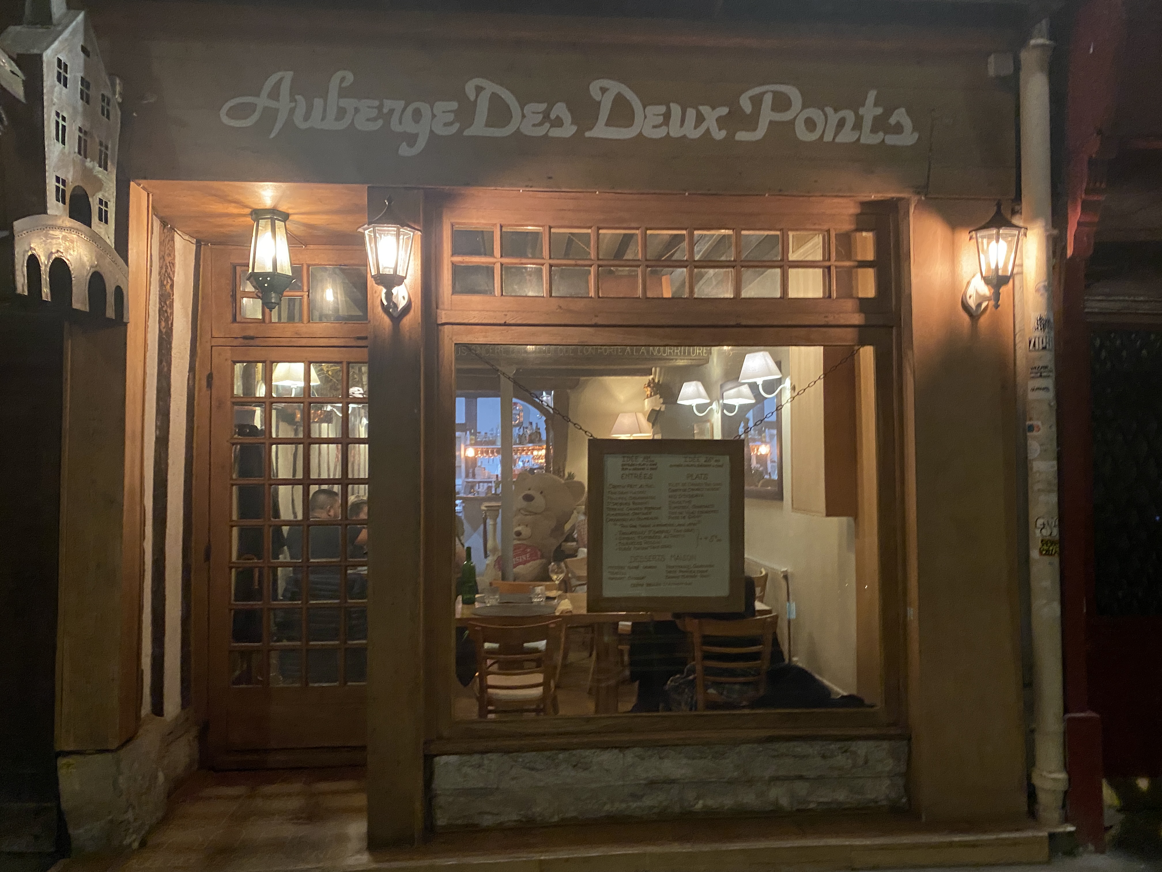 Nous avons passé un merveilleux moment à dîner à L'auberge Des Deux Ponts. Il s'agit d'une opération menée par un seul homme et si je suis occupé, je pourrais comprendre la perception d'un service lent. Nous avons réservé le matin. Je savais qu'il n'y avait rien au menu pour ma femme végétarienne et j'ai demandé dans mon français très limité s'il était possible de lui préparer une salade. Il a dit oui et a posé des questions sur le poisson, les œufs et le fromage. Quand nous sommes arrivés ce soir-là, il lui a servi avec plaisir une salade joliment préparée. Mon confit de canard avec pommes de terre poêlées et mayonnaise était simple et parfait. J'ai apprécié la présentation de la crème brûlée mais elle soulève un gros nuage de fumée de sucre brûlé. Je suppose que c'était la façon de procéder avant l'avènement des torches au propane et cela s'est avéré à merveille. Dans l’ensemble, nous avons eu un délicieux repas bien préparé dans un endroit charmant, préparé et servi par un chef qui semblait vraiment apprécier et apprécier notre présence. Passez absolument par là ou appelez et faites des réservations et attendez-vous à être là pendant 2 heures ou plus pour le dîner, comme il se doit.