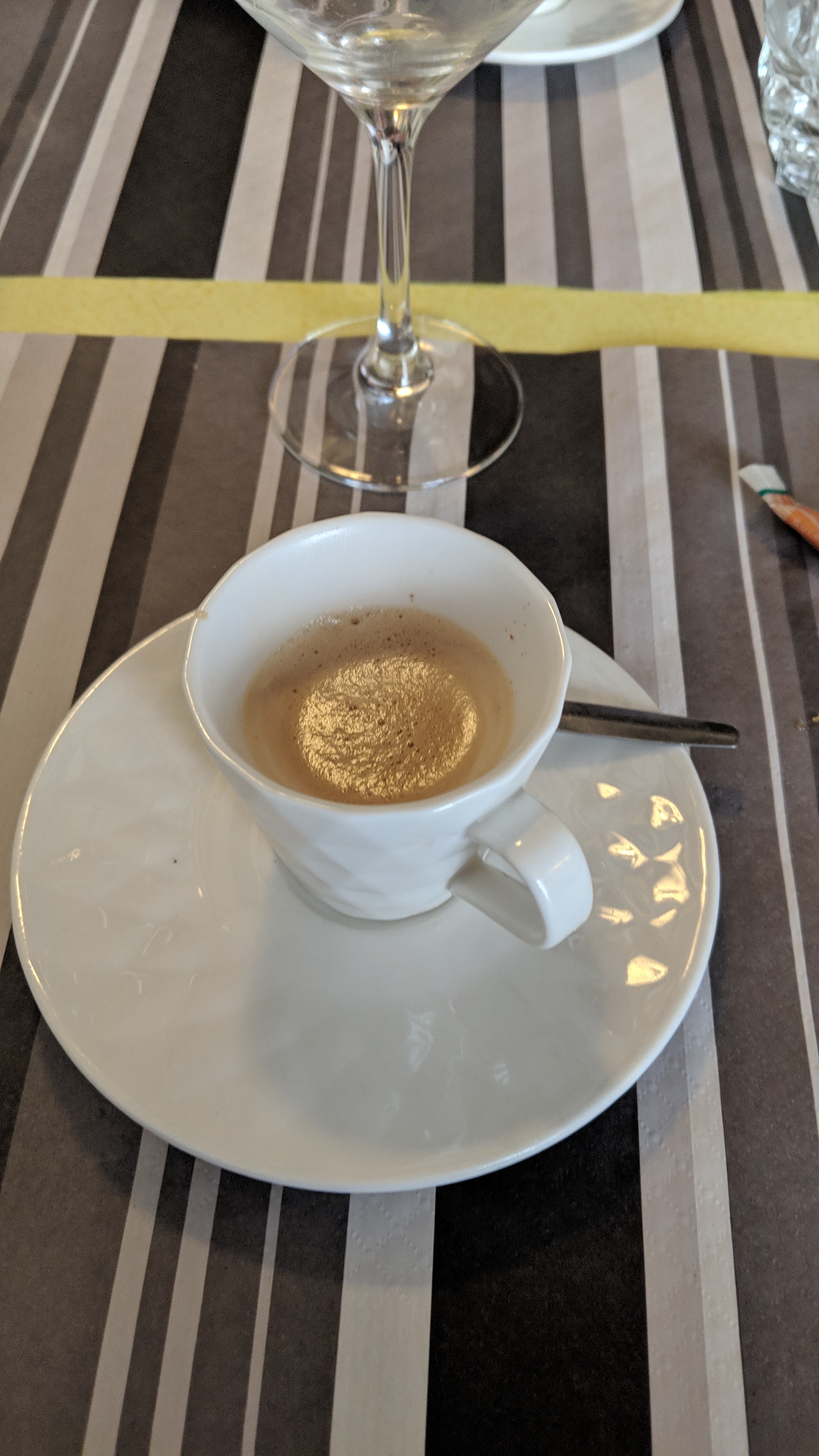 Charmant petit restaurant français. Il semble être destiné aux locaux (le propriétaire/gérant parle un peu anglais mais le menu est uniquement en français). Le service est un peu lent mais il faut s'y attendre. Ils proposent un bon menu à prix fixe pour le déjeuner - 2 plats et café pour 18,5 euros ou un peu plus avec 3 plats. La sélection de vins était bonne et 4 à 6 euros par verre pour nous. Les plats étaient très bons - nous avions la Brochette de la Mer et le Foie Gras de canard. Les desserts étaient théâtraux et bons également. Nous avons eu une glace à la vanille flamboyante et une crème brûlée - servies comme base de crème anglaise à votre table avant qu'un gabarit en acier chaud ne soit abaissé pour produire la « brûlée » en quelques secondes. C'était environ 50 euros pour un déjeuner pour deux.