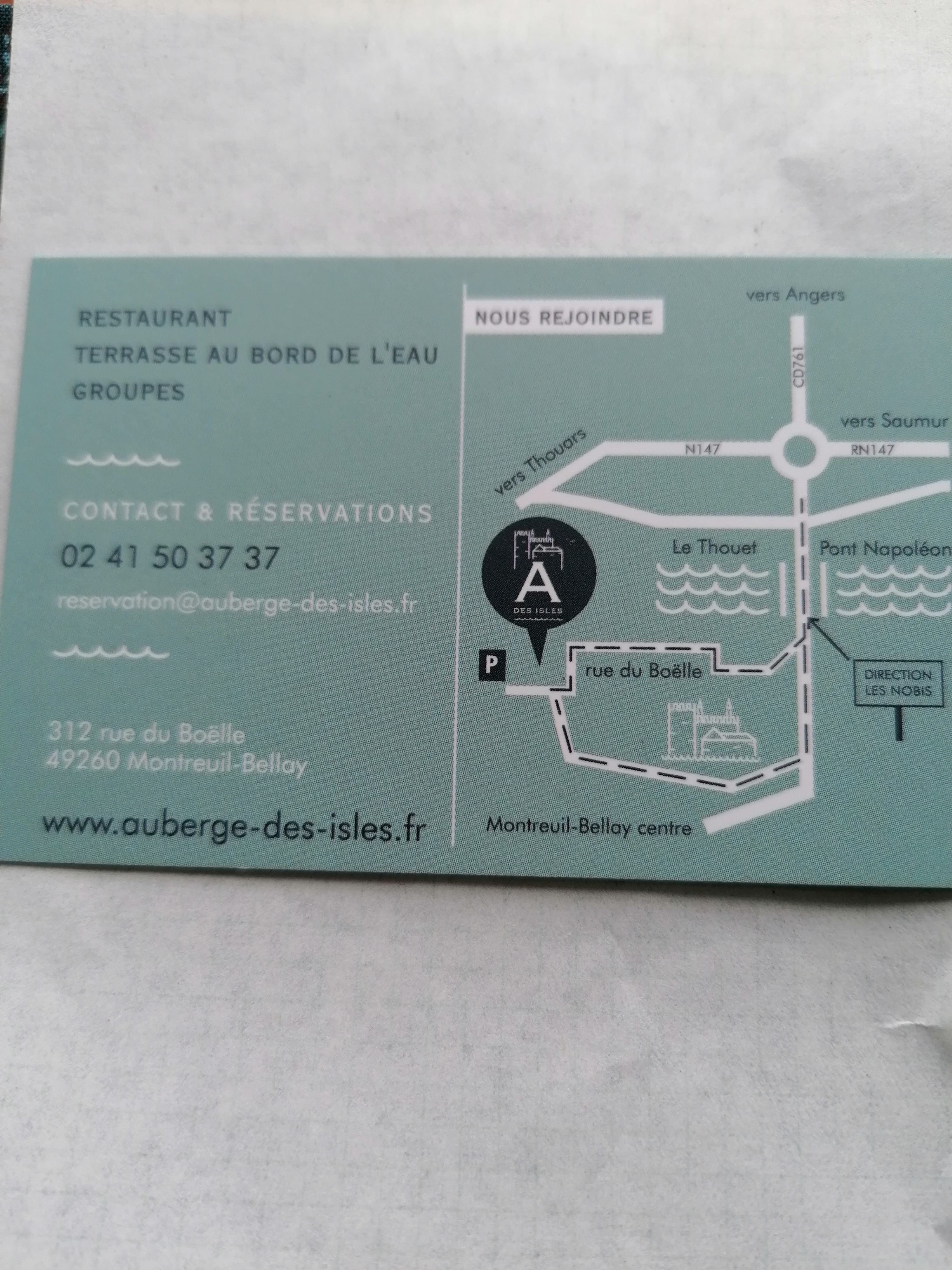 Lieu, repas, personnels sympas, vue sur le Thouet si vous réservez et le demandez. Original et bon rapport qualité/prix. Nous vous le recommandons. Bonne suite à l'Auberge des Isles.