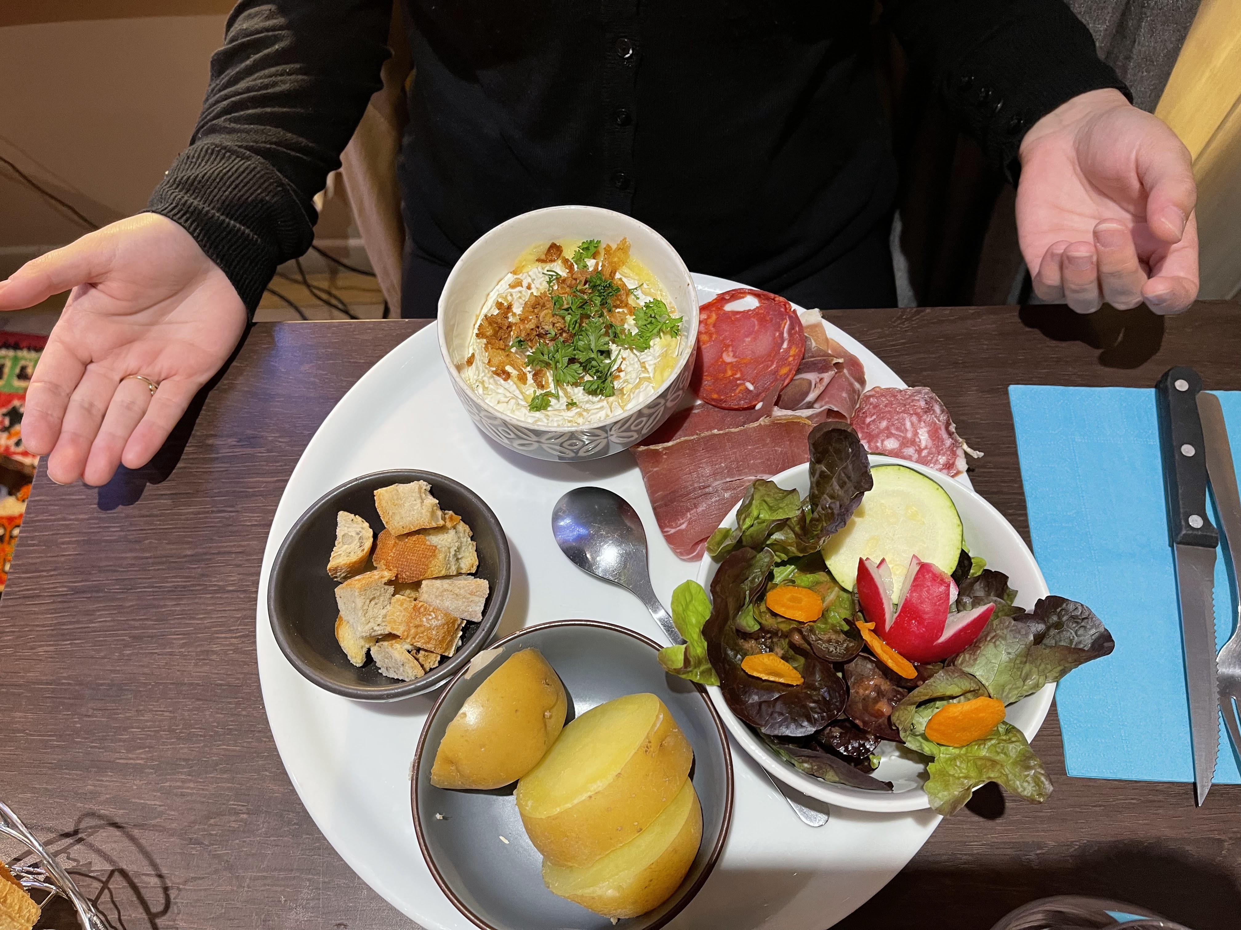 Déçu de ce restaurant ,nous voulions tenter la fondue savoyarde, la serveuse qui était en essai nous l'a conseillé, avec, normalement il y avait salade et pommes de terre avec les morceaux de pains,sauf qu'à l'arrivée des plats juste un panier de pains, le fromage fondu et une assiette de charcuterie que nous pensions pour une personne seulement !! Le prix bien plus élevé que les autres restaurants finalement après avoir regardé. Nous ne conseillons pas, car les autres jours nous avons découverts des petites pépites !