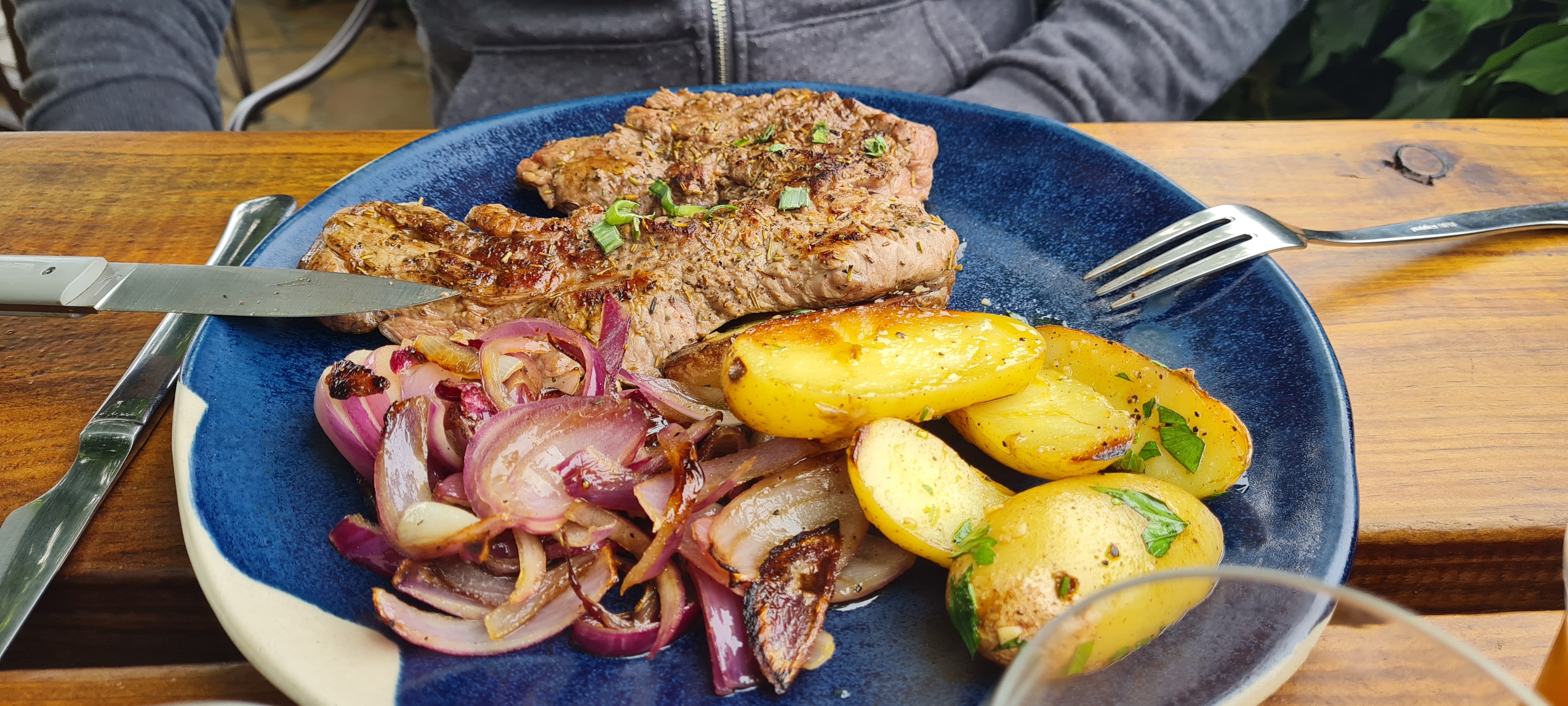 Emplacement magnifique ! En ce qui concerne les plats .ous avons pris des côtelettes d'agneau et une entrecôte de bœuf. La cuisson était parfaite et les viandes, l'une comme l'autre très bonne et tendre à souhait. Une petite attention aussi pour notre chien avec une gamelle d'eau et un os avec encore de la viande autour. Le service a été correcte. Le seul bémol j'avoue sont les guêpes qui se sont invitées.