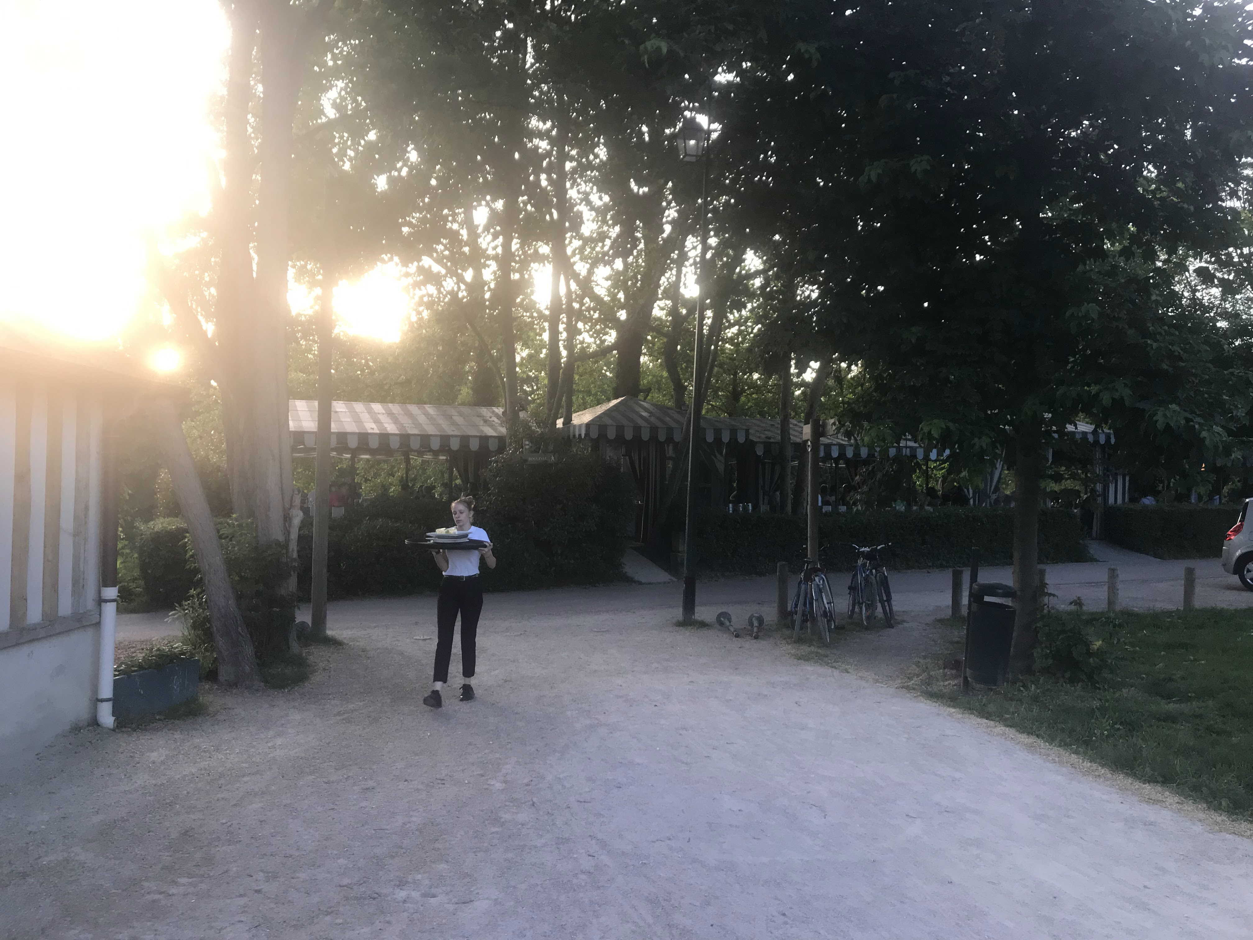 Dejeuner en terrasse sous les parasols et à côté des pommiers, proximite de la Seine. Plats de bonne qualite, tarifs raisonnables par rapport au Fruit Defendu, le sister ship. Tres bons desserts à moins de 10 euros
