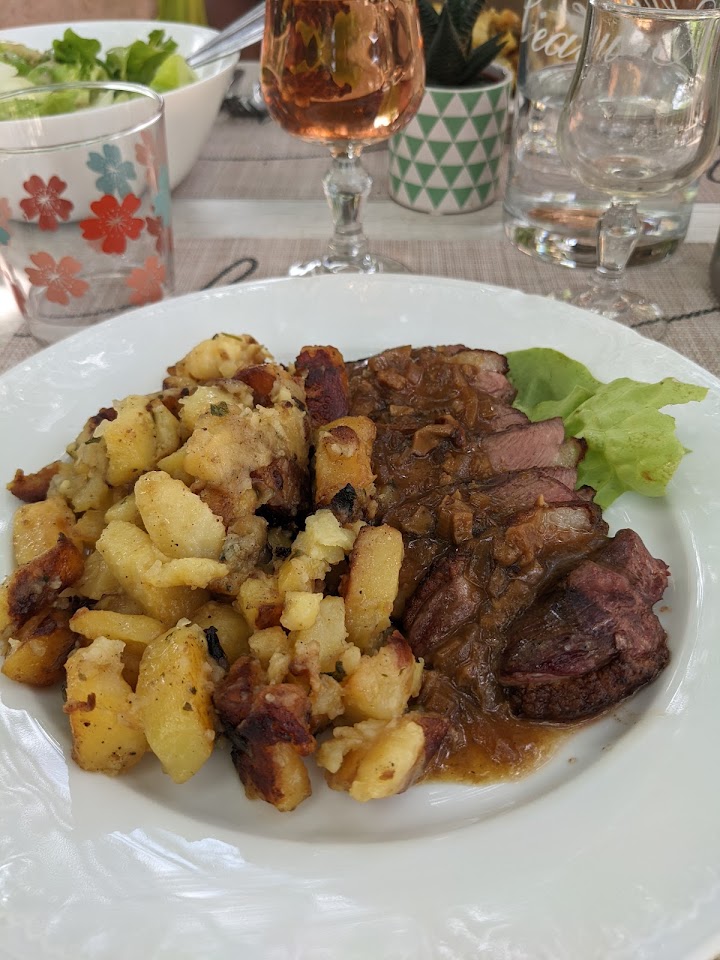 Notre premier repas dans la région qui fut grandement apprécié. Des produits frais et de qualité y sont servis. La patronne Janine - adorable, est venue nous voir à table pour nous demandé ce que nous avions pensé du repas. Nous avons dîné sous le noyer, l’ambiance était reposante, douce, romantique.
