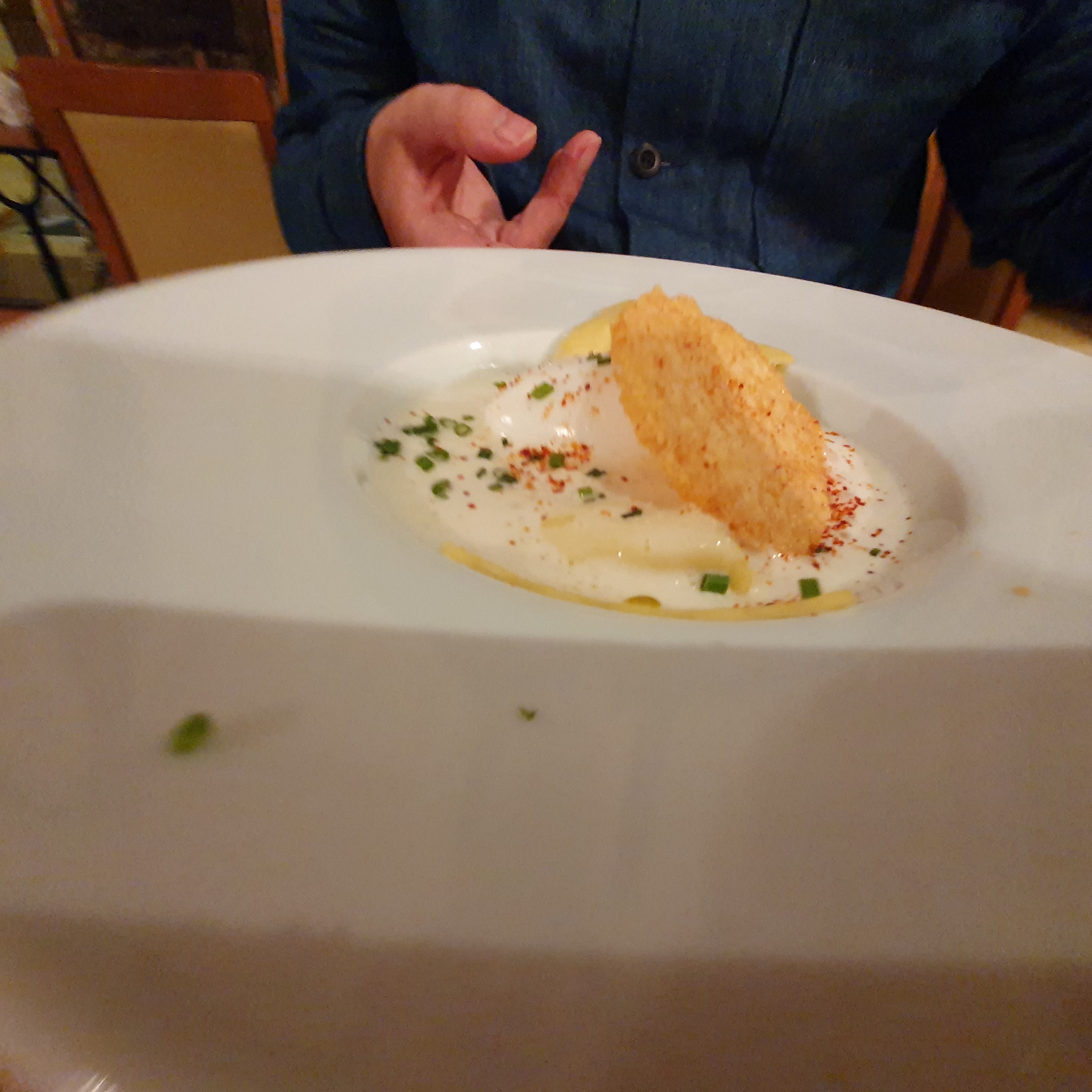 Un restaurant avec un chef ouvert et vraiment de bonne humeur ! Les lieux sont vraiment magnifiques et le service est de première classe. Carte petite mais vraiment sympa. Le service nous a bien conseillé et était également disponible pour apporter de petites modifications (sans viande). Nous avons passé une merveilleuse soirée et nous reviendrons certainement ! Juste à cause du dessert breton !