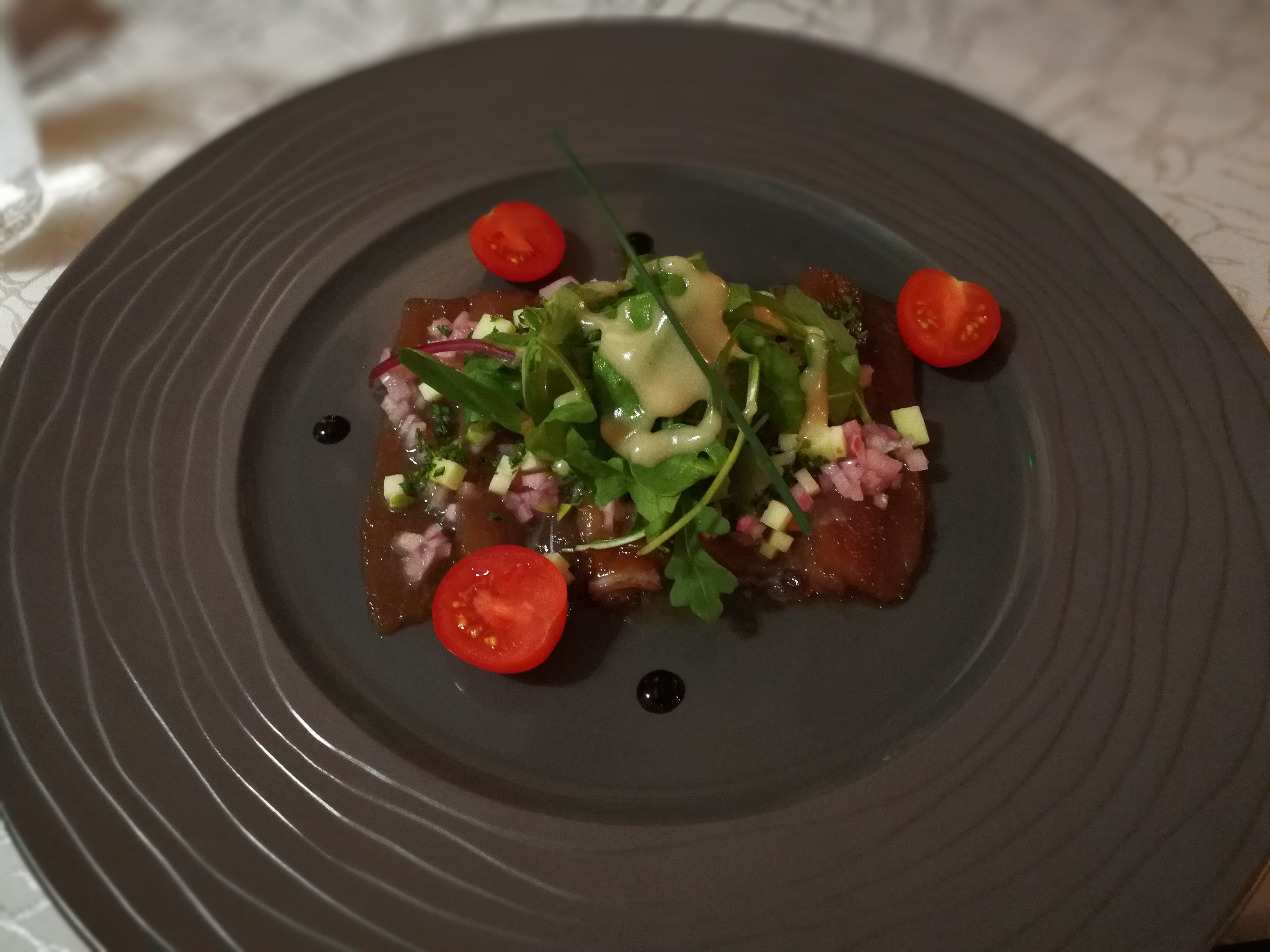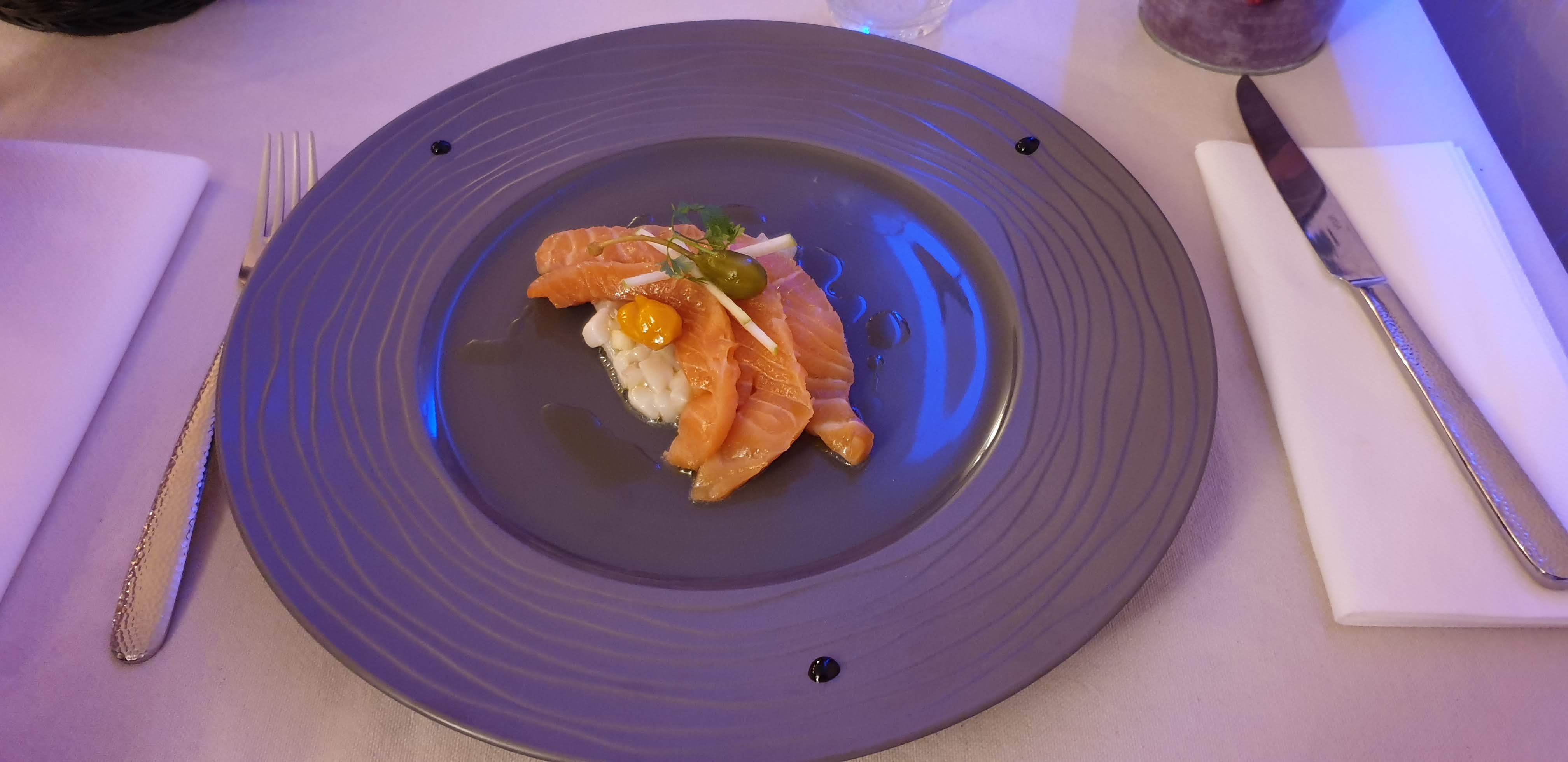 Très bon accueil, le restaurant est sympa et la carte prometteuse. Dommage d'être quand même déçu malgré une belle présentation, notamment le saumon fumé par nos soins où j'ai certes senti l'odeur du fumé quand le serveur a enlevé la cloche de l'assiette, mais je m'attendais à autre chose de plus goûteux. Le choix de la pièce de saumon n'est pas, à mon sens, le meilleur. Pour le reste c'était très bien, carpaccio savoureux et copieux, malgré un long nerf retrouvé dans la viande. Une petite attention de la part du chef aurait été la bienvenue...