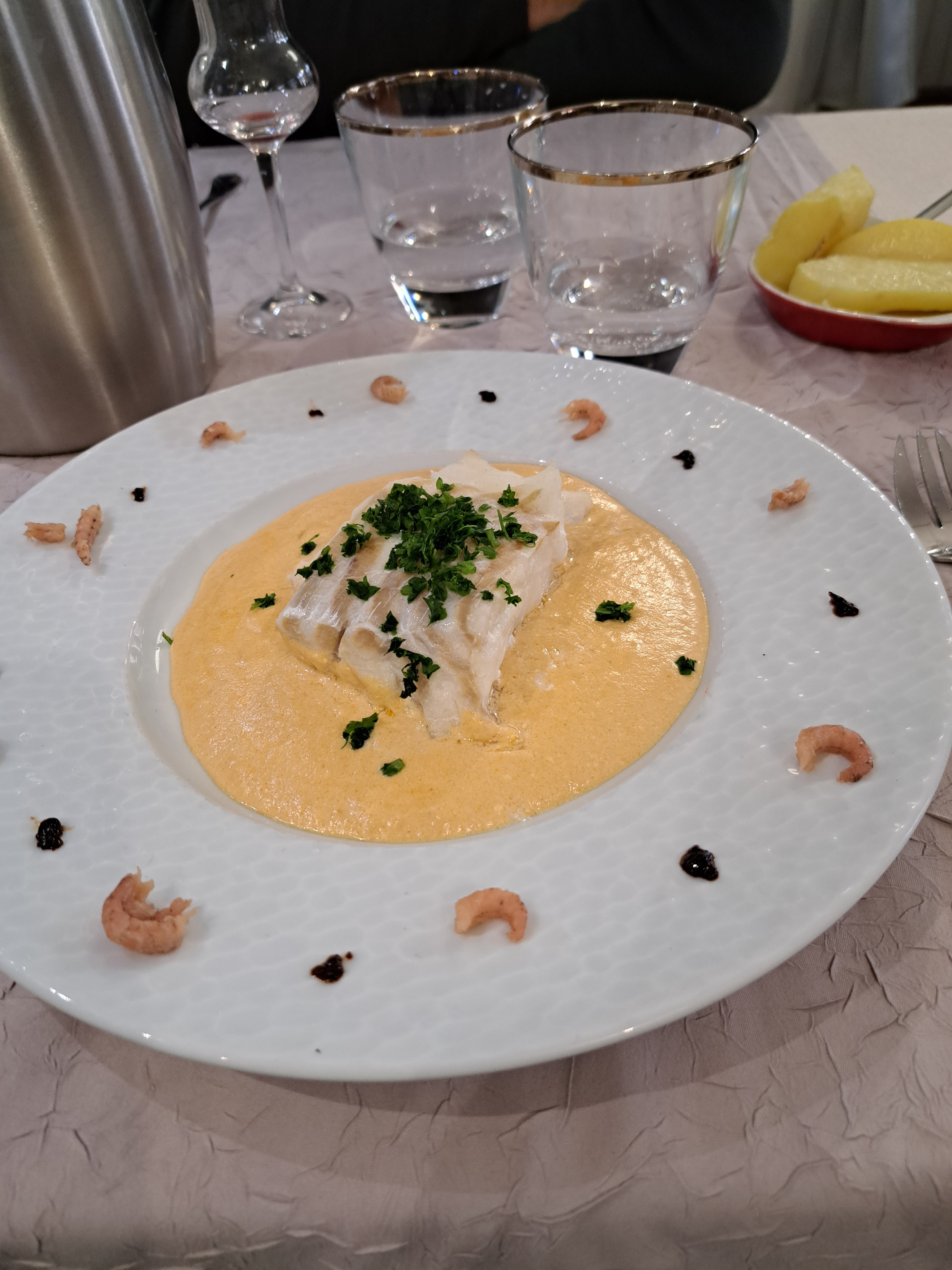Nous avons pris en plat du poisson accompagné d'une sauce crevettes et du riz super bien préparé et très bien servi un régal Les tarifs sont très corrects 😊😊 Une très belle carte La serveuse très souriante Je recommande 😁😁😁