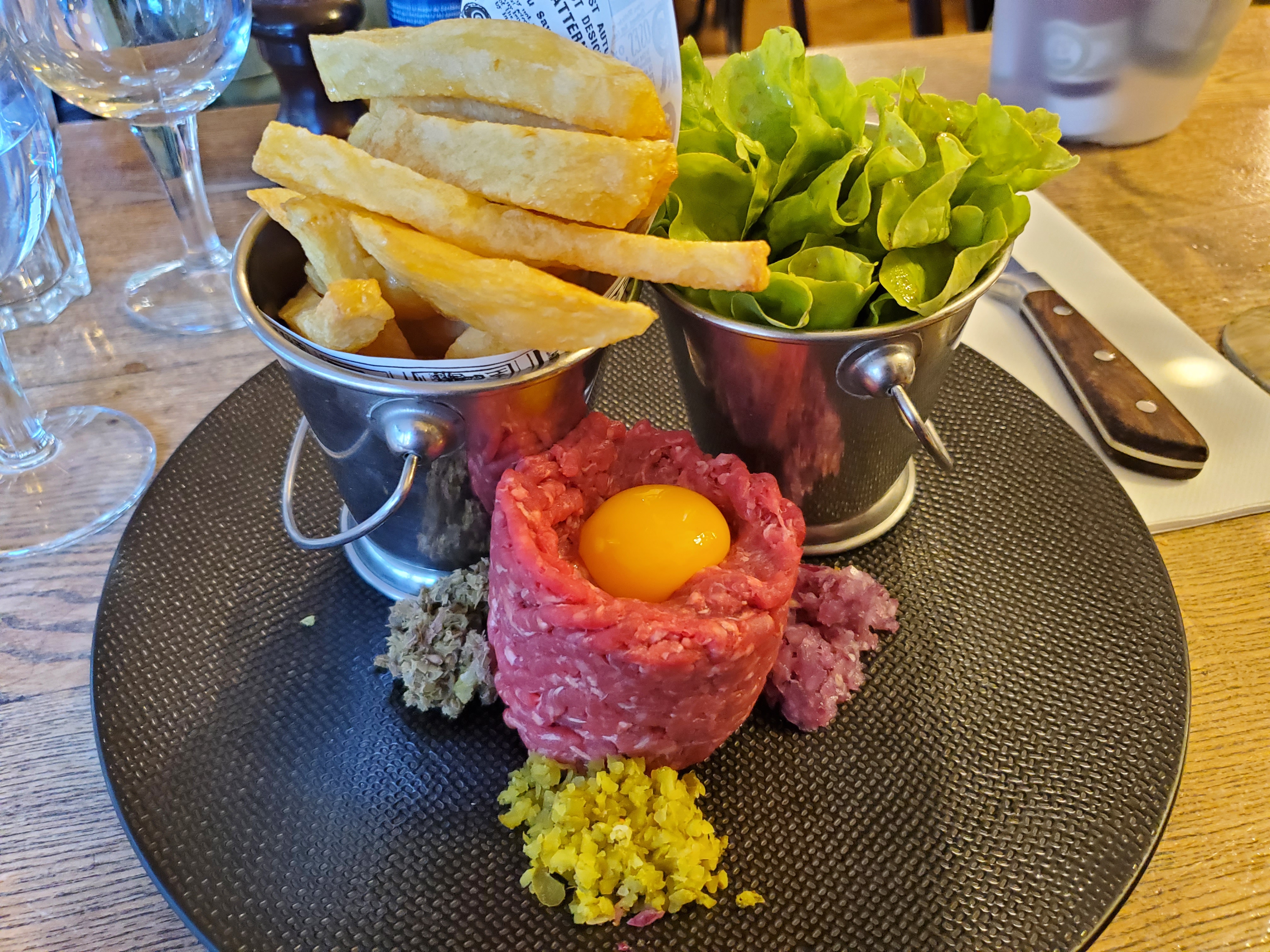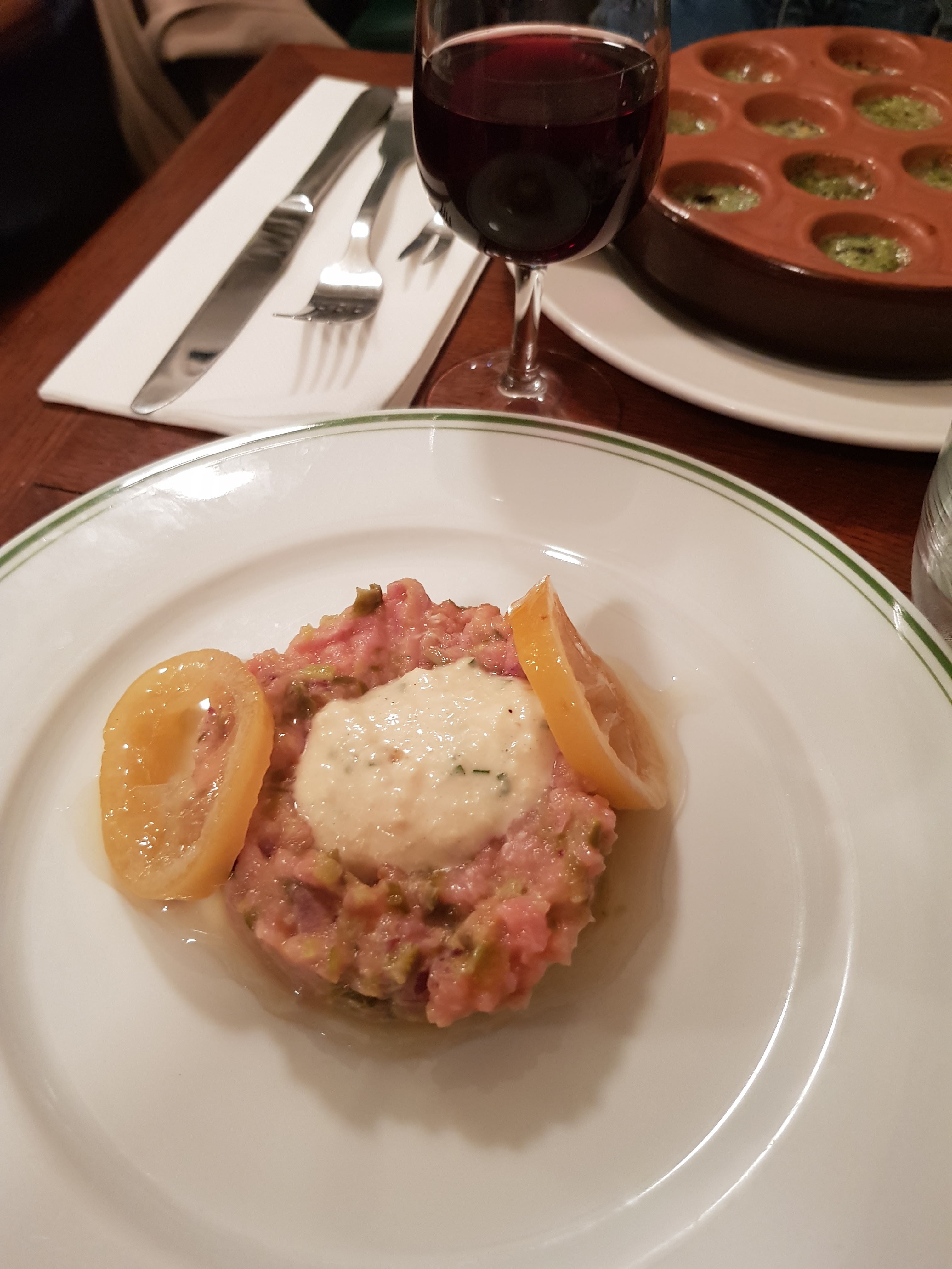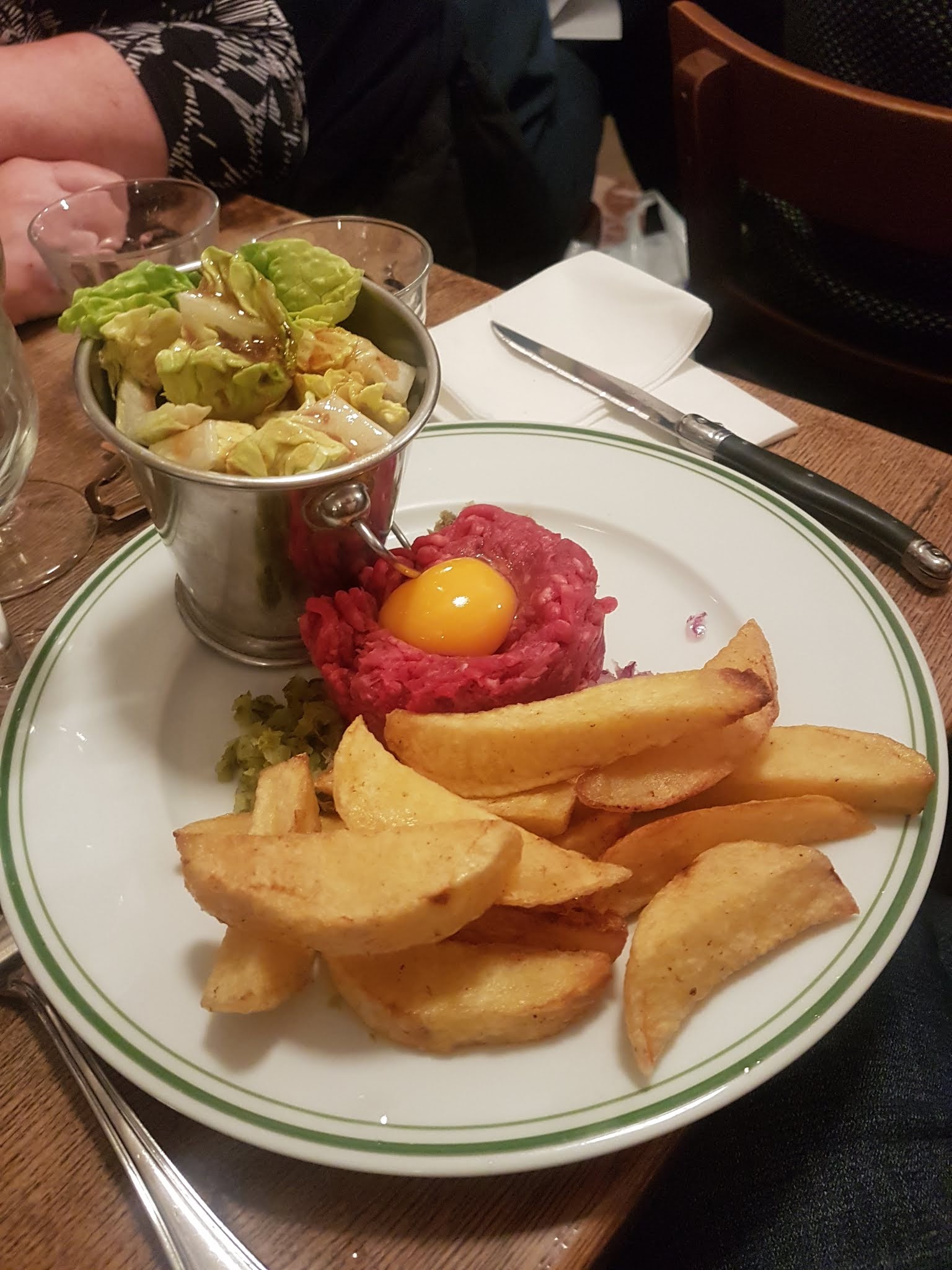 Ne vous faites pas avoir par cette cantine pour touriste américain. Pour un menu à trente euros vous aurez droit à une (bonne) entrée peu généreuse et somme toute assez simple. Je me suis laissé tenté par un tartare très fade qui sortait visiblement d’un frigo un peu trop froid accompagné de frites molles et encore une fois peu généreuses. Le vin (rouge) était brulant et ressemblait plus à une villageoise de fin de soirée qu’à une bouteille servie en restaurant. Service chaleureux nonobstant.