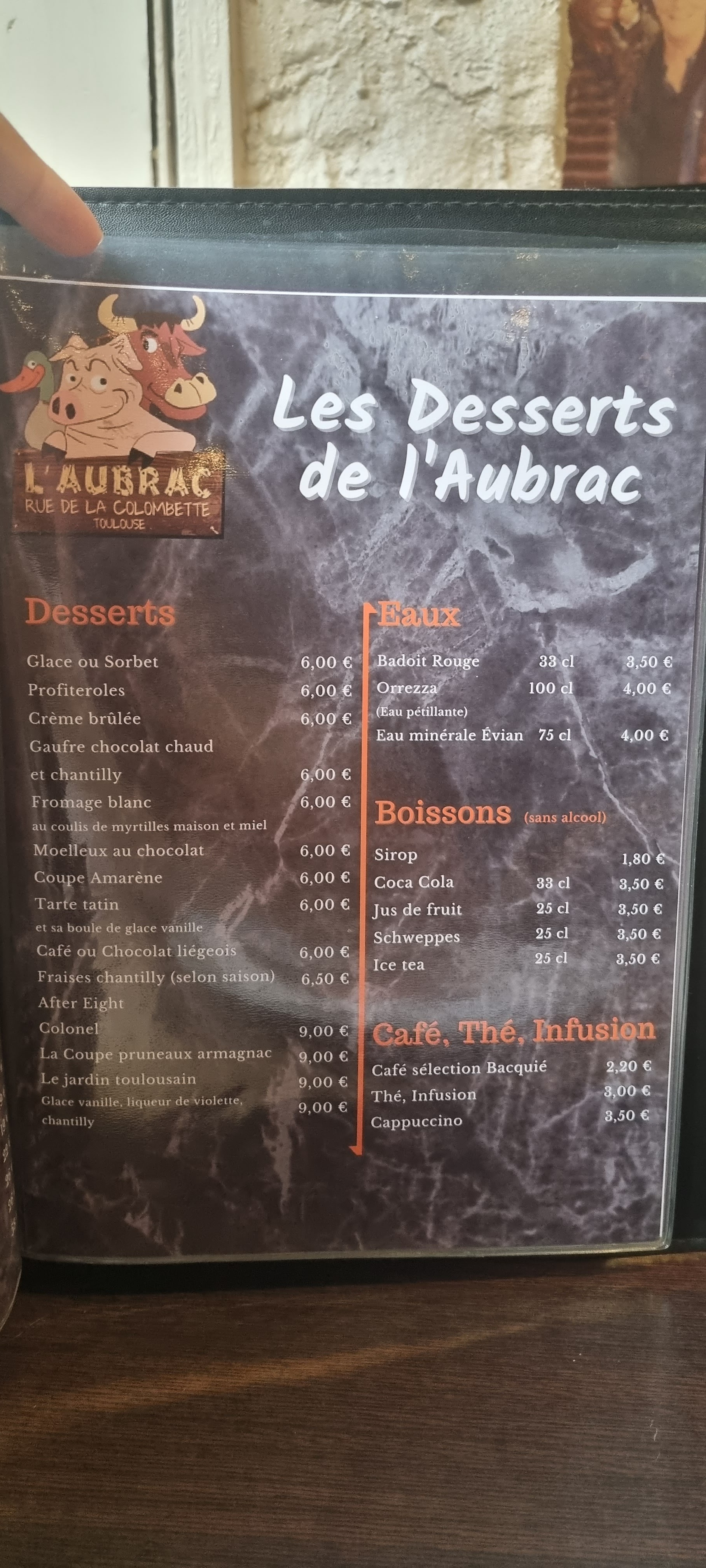 L'Aubrac n'est plus ce petit restau convivial de Toulouse. C'est devenu beaucoup trop bruyant, attente interminable, serveuse fort désagréable et l'hygiène est scandaleuse. A deux reprises 2 heures après la sortie du restau ma femme et moi même pris par d'énormes et insupportables maux de ventre et devoir stopper la soirée en rentrant vite à la maison. Nous déconseillons donc ce restaurant si vous ne voulez pas passer la nuit sur les water.