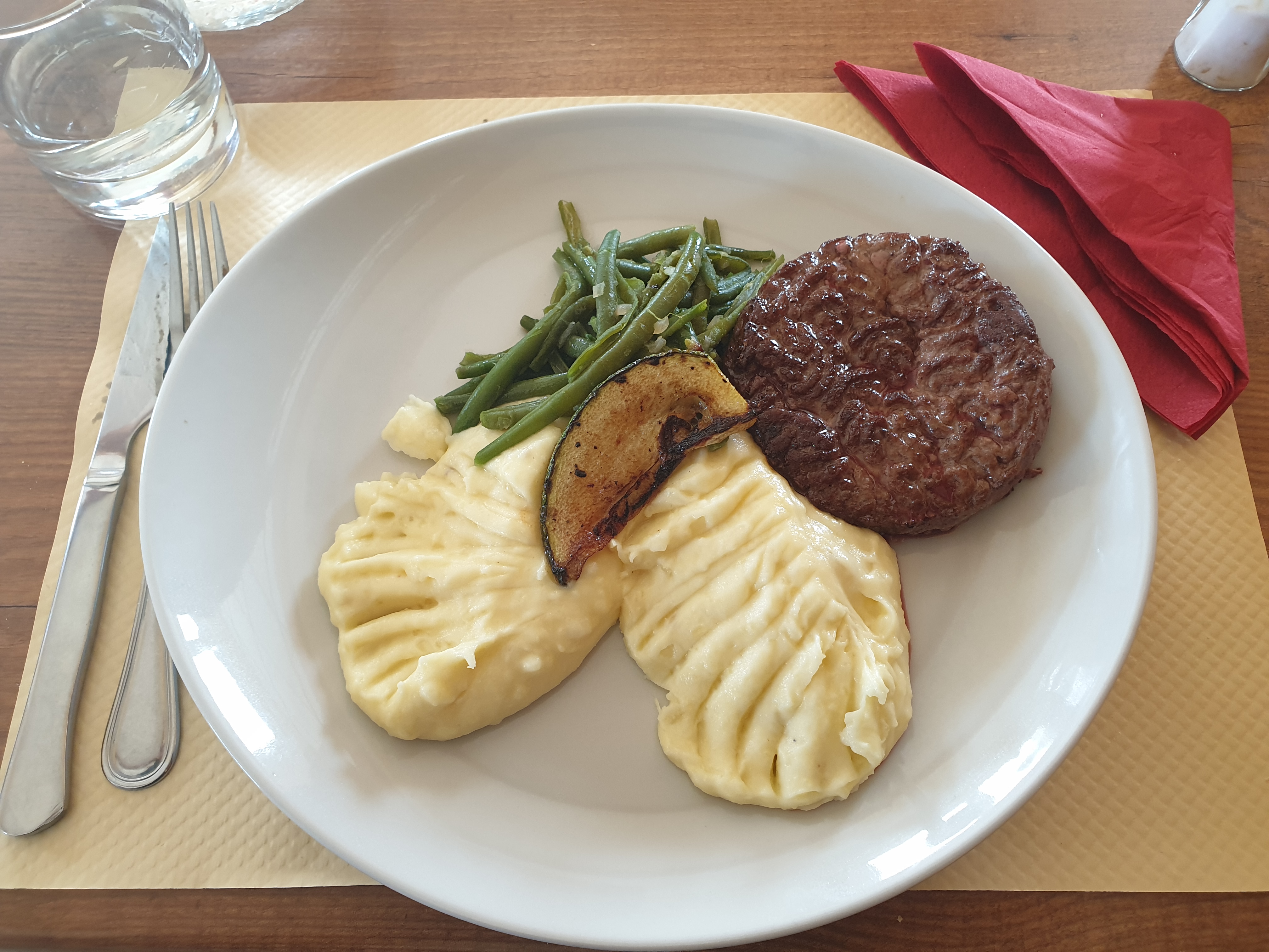 Petit restaurant dans un petit village. Menu du jour avec principalement des burgers. Un plat du jour pas cher chacun. Malheureusement, la nourriture était très grasse. Le restaurant et les toilettes pourraient être plus propres. Fonctionne si vous avez faim après une randonnée.