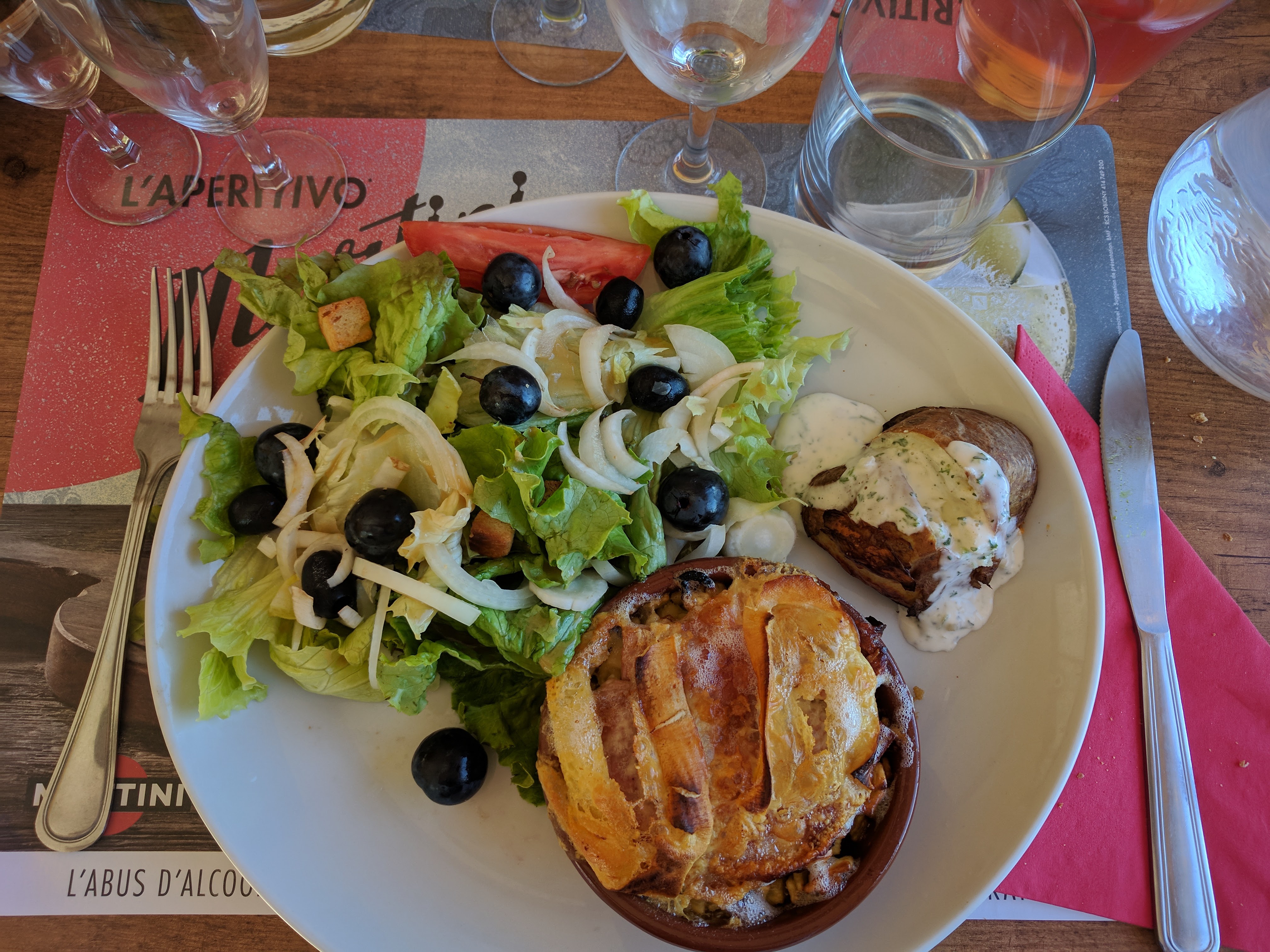 Trop bien, ombragé, frais en soirée, bon menu variété et prix pour un foi raisonnable pleine campagne à côté de village personnel sympa, accueillant,
