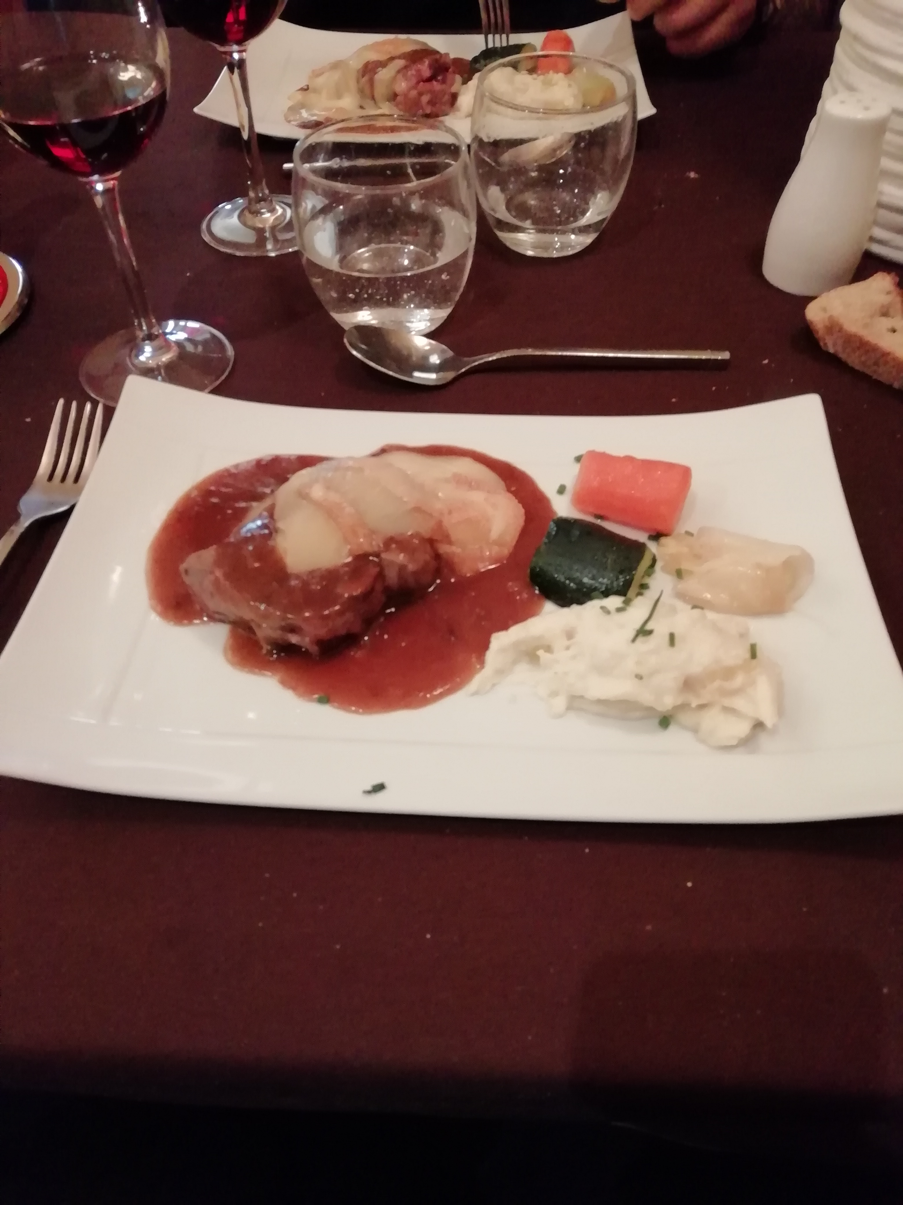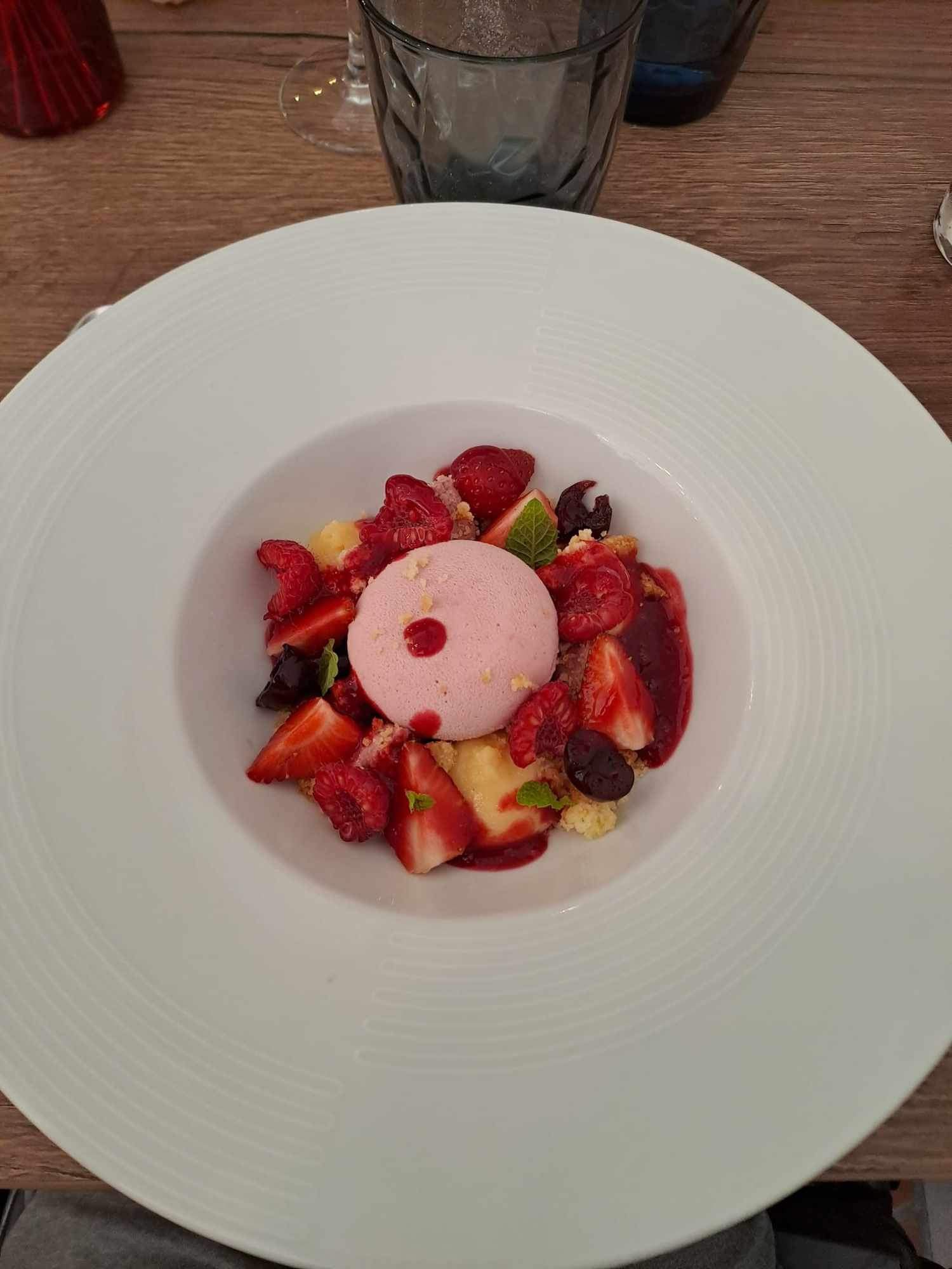 Entrée saumon en gelée 👏suivi d'un magret de canard sauce pêche 😋et vacherin coulis de framboises 1/2 mercurey un régal. Je reviendrais c'est certain. 👏👏👏👏